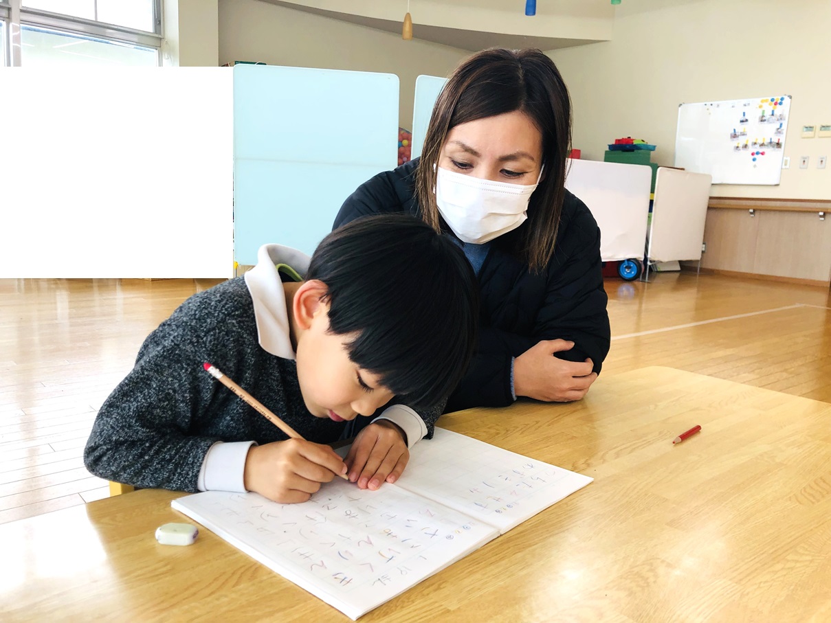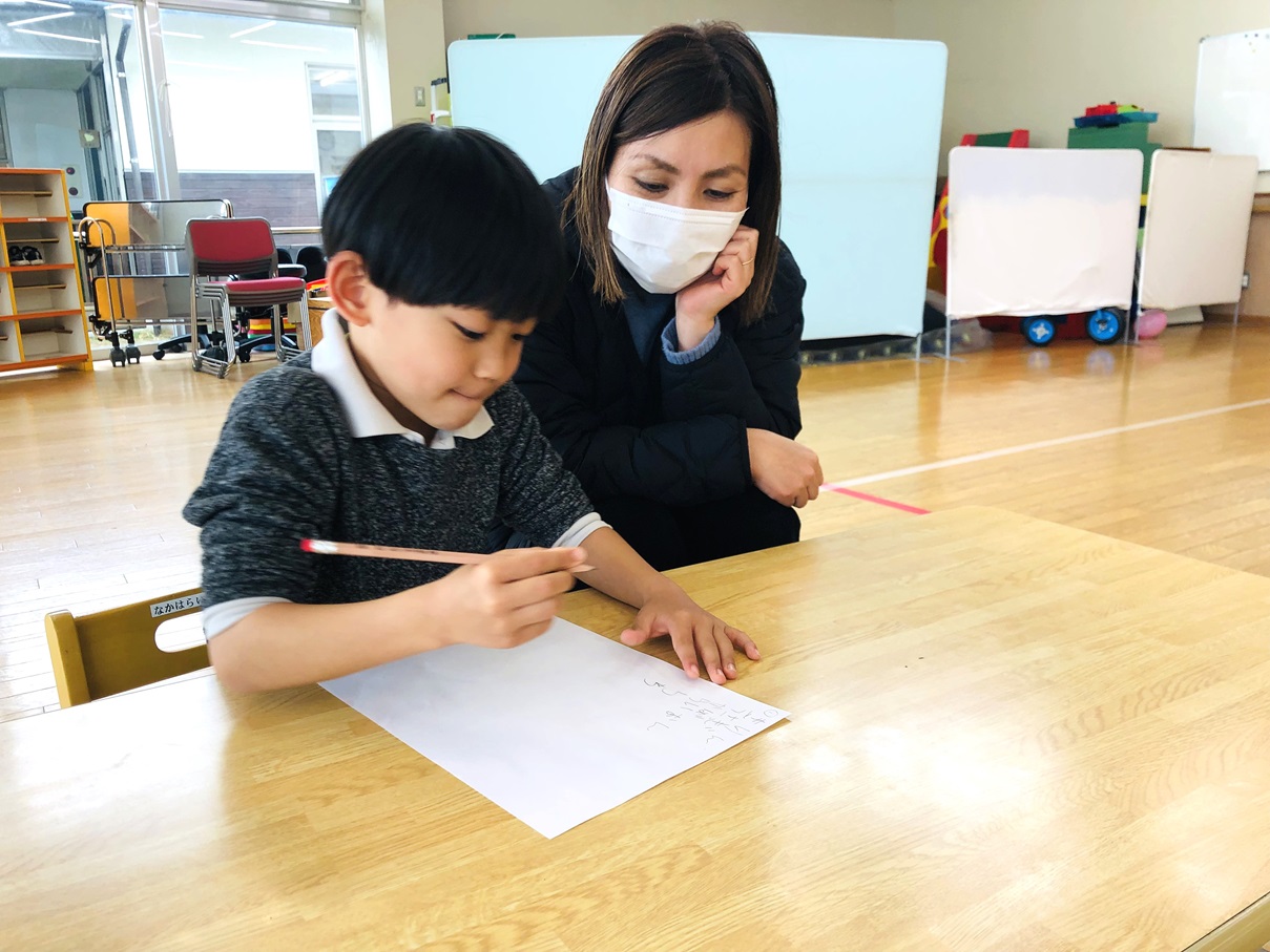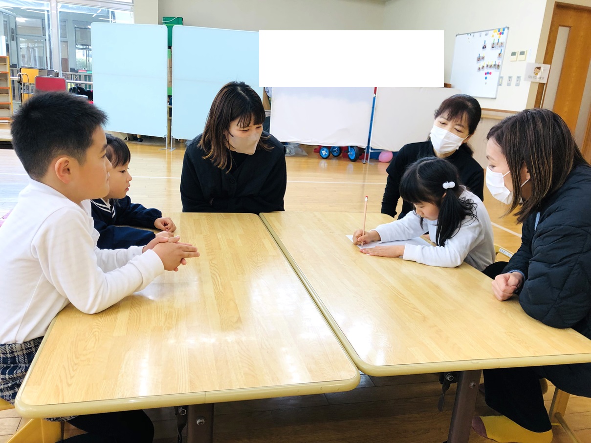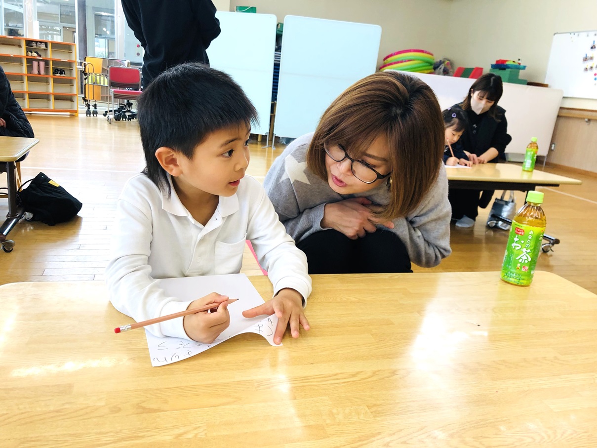 最初は文字遊びからスタートです。年長さんになり毎日文字遊びに取り組んでいる、ぞう①グループさん。集中している姿や成長した姿をお母さんに見てもらい、頑張ったご褒美として花丸を付けてもらいました♪