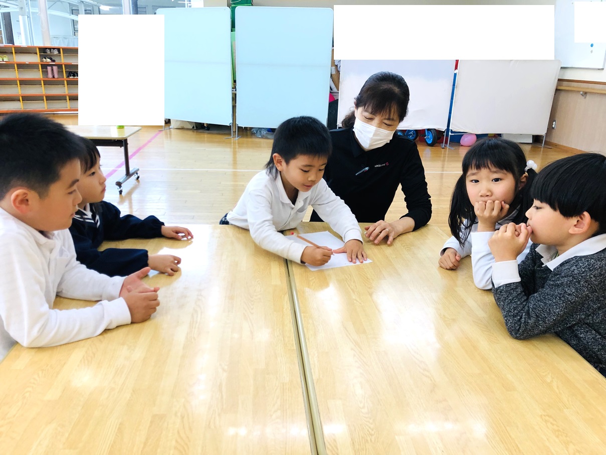言葉集めに慣れてきたところで、チーム戦にも挑戦です!「あ!分かった!相手チームに聞こえないよう優しい声でね!」「書くのが早い人だと有利かも!」とチームごとで作戦を考えながら取り組むことができていました。