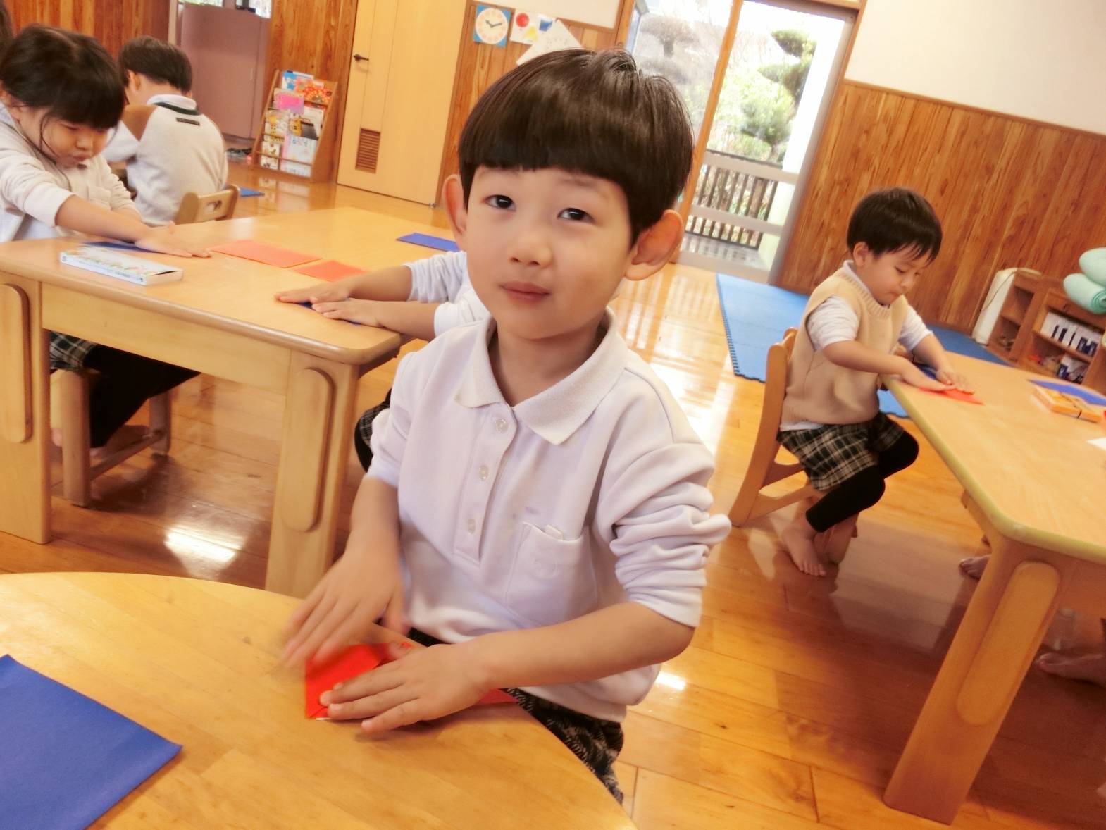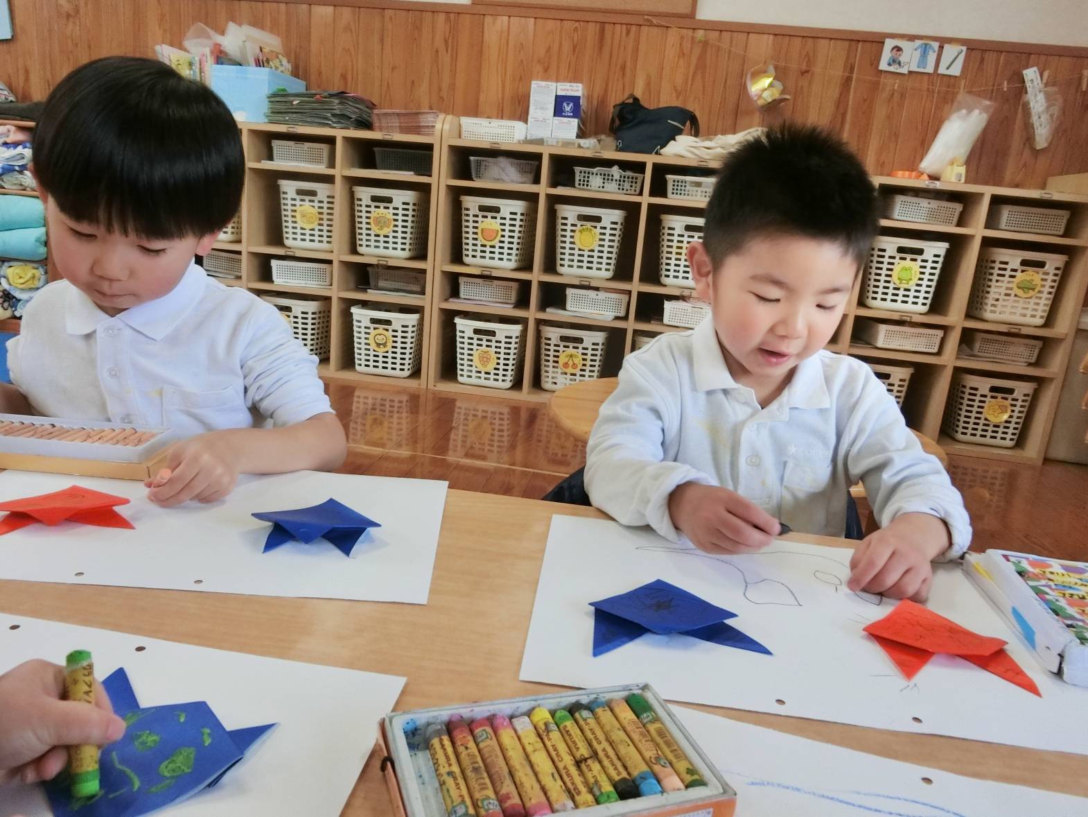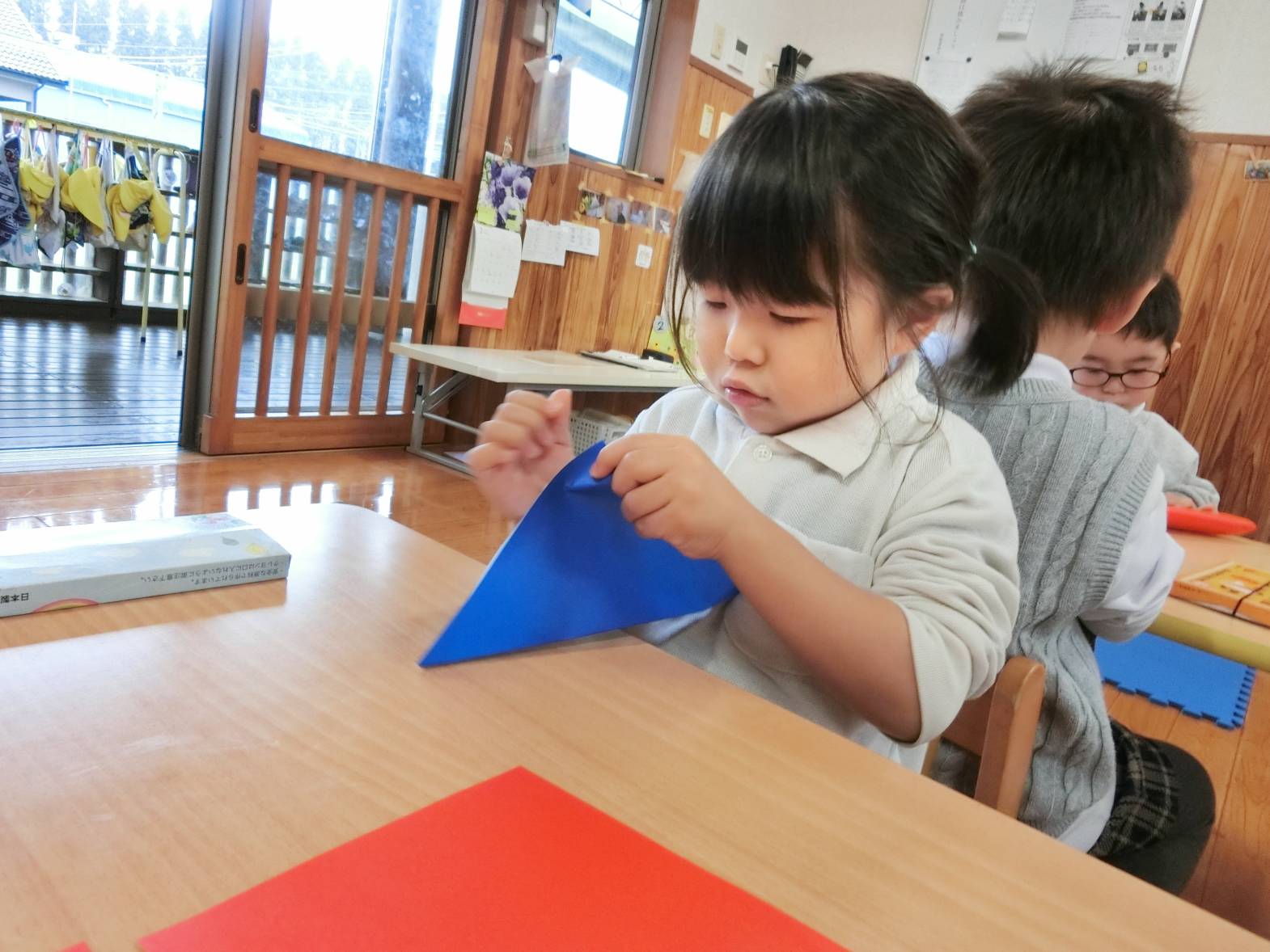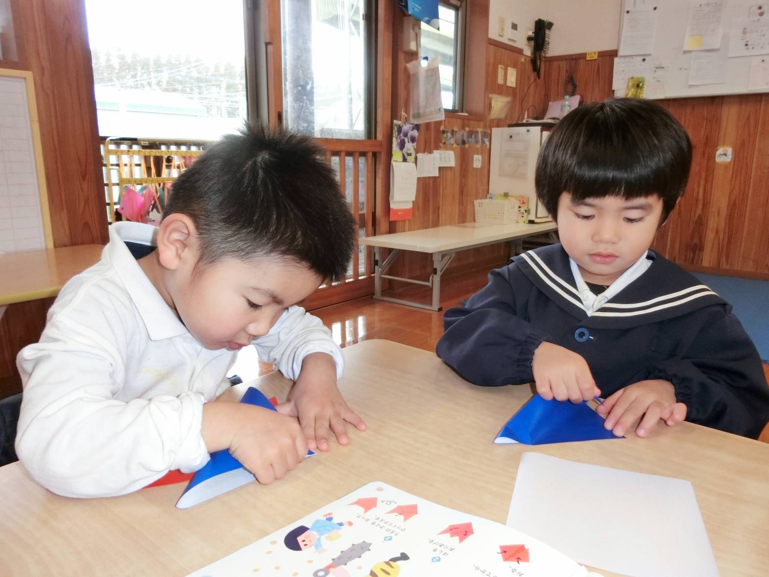 今年度最後のりす組での折り紙製作は、今までで一番難しかったこともあり「先生、ここ分からない。」、「僕が教えてあげるよ。」、「こうしたらいいんだって。」と保育者や友だちと協力しながら作る姿が見られました。