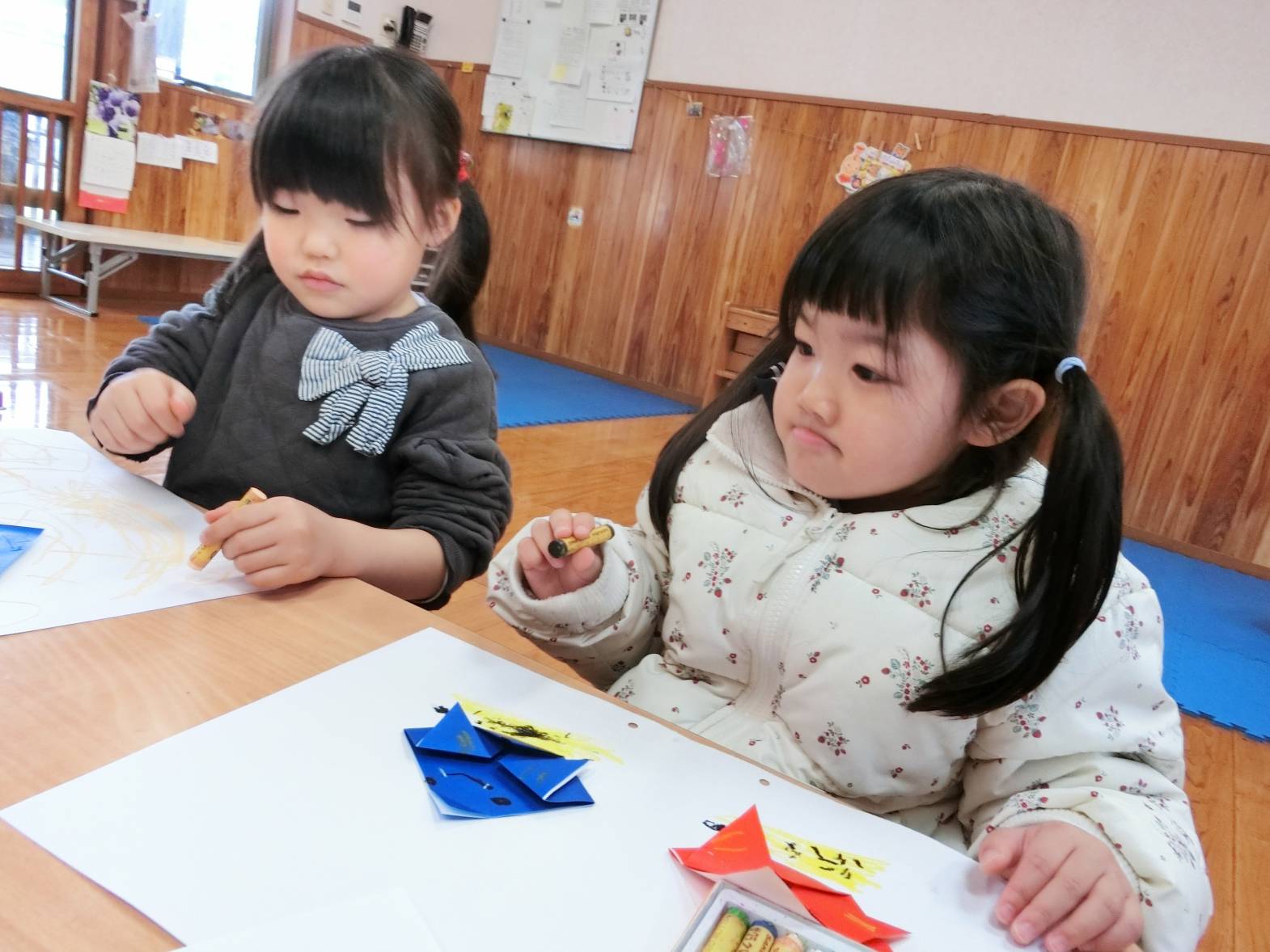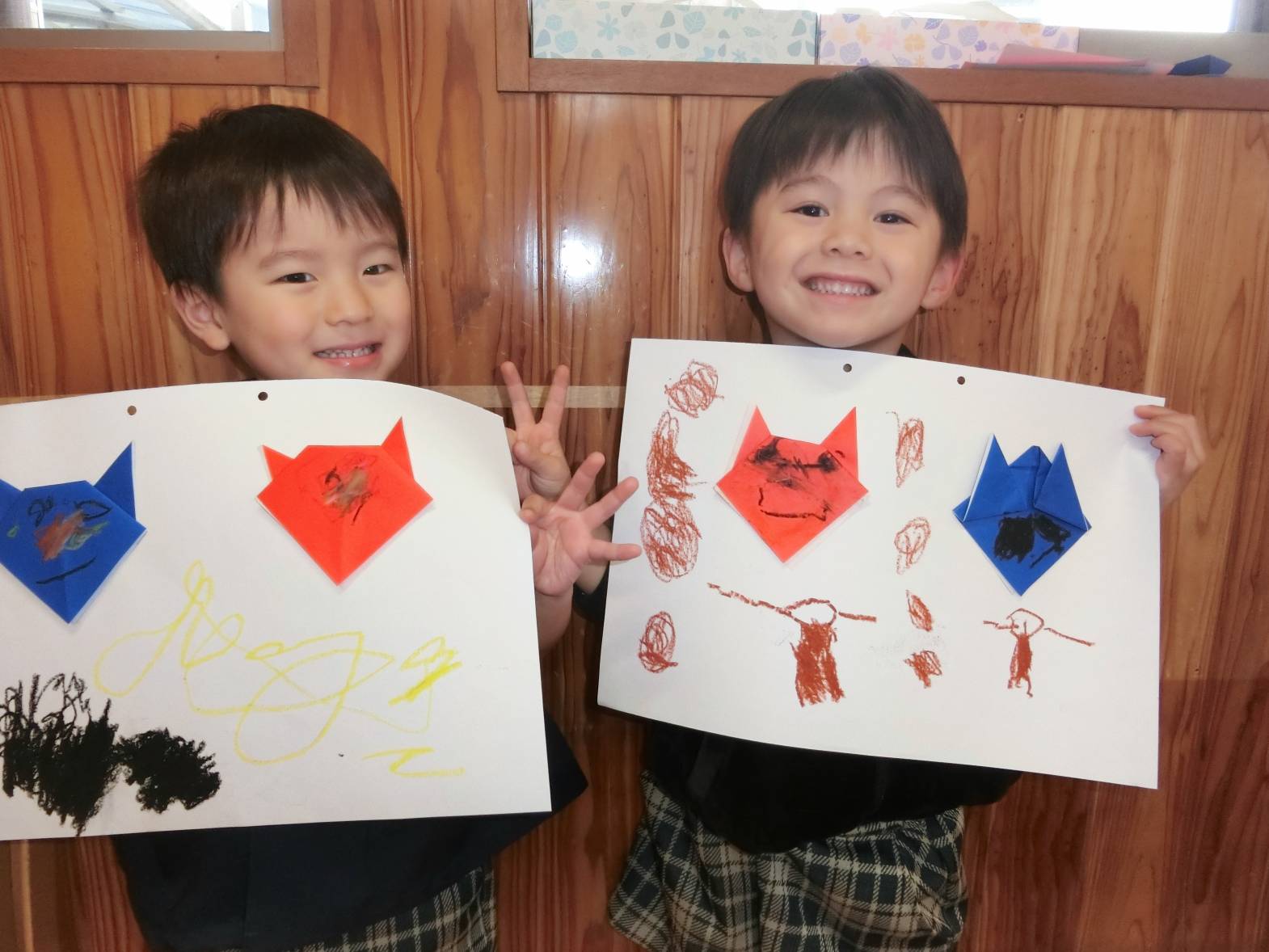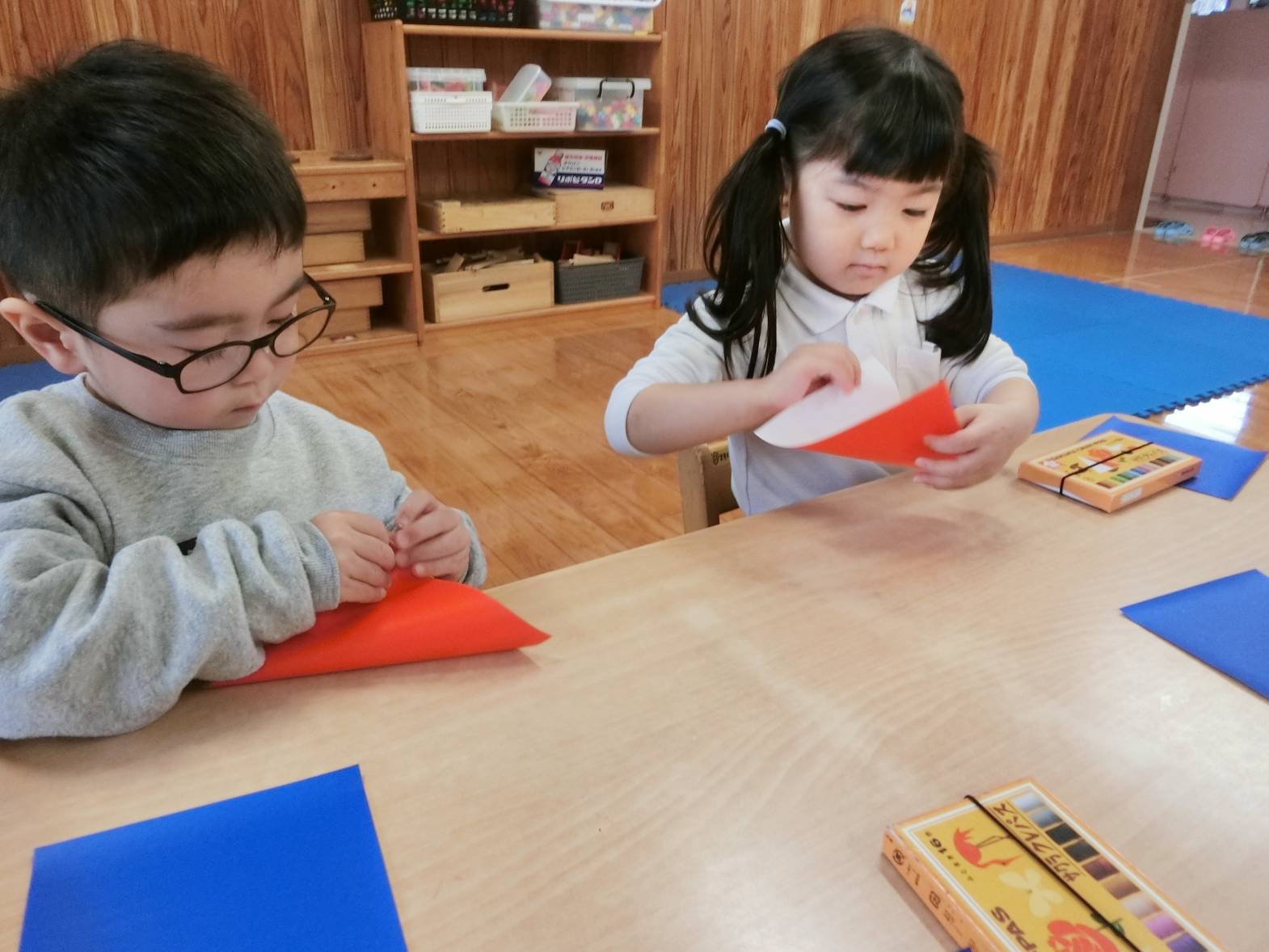 今年度最後のりす組での折り紙製作は、今までで一番難しかったこともあり「先生、ここ分からない。」、「僕が教えてあげるよ。」、「こうしたらいいんだって。」と保育者や友だちと協力しながら作る姿が見られました。