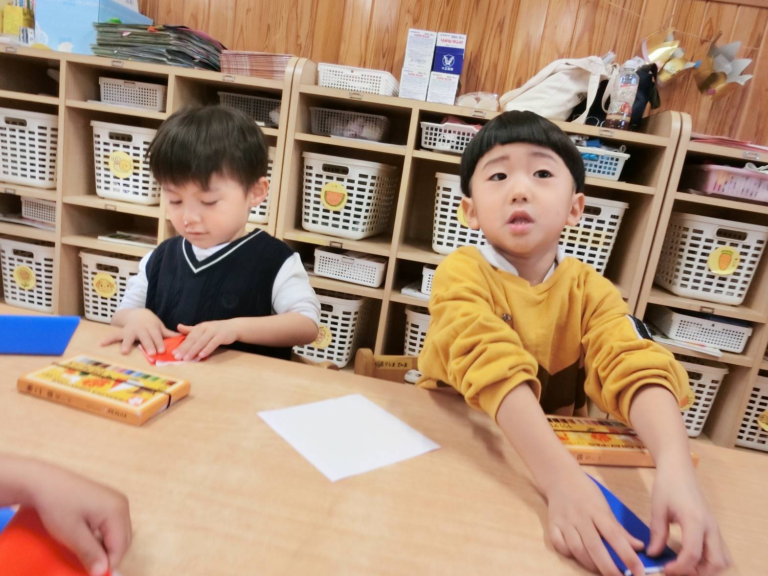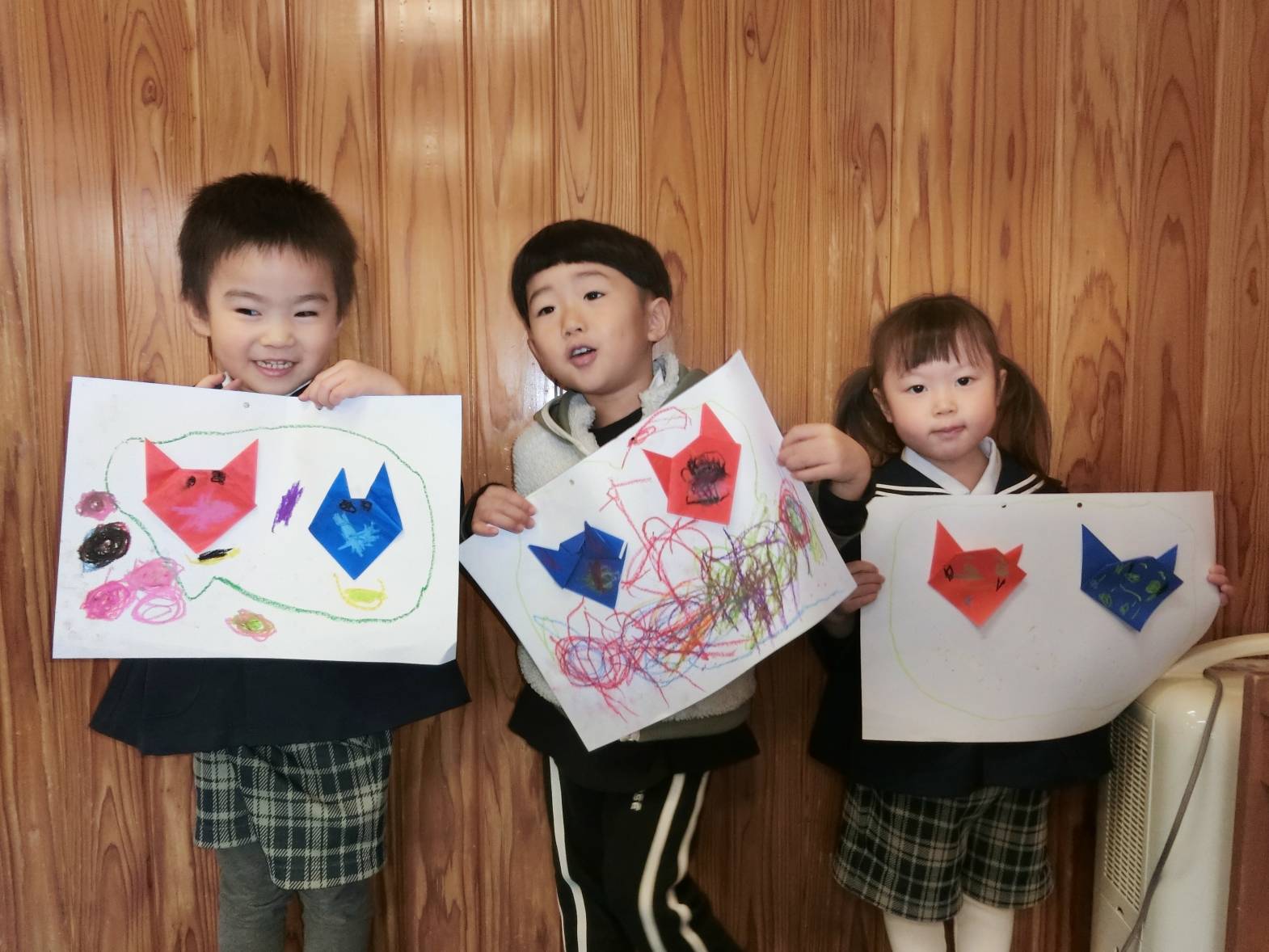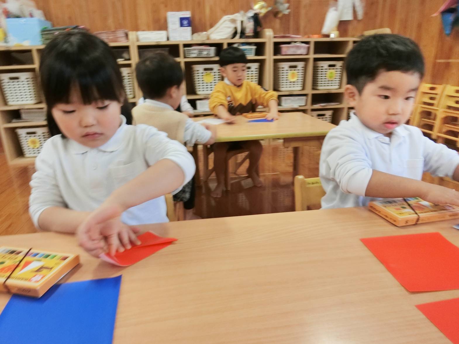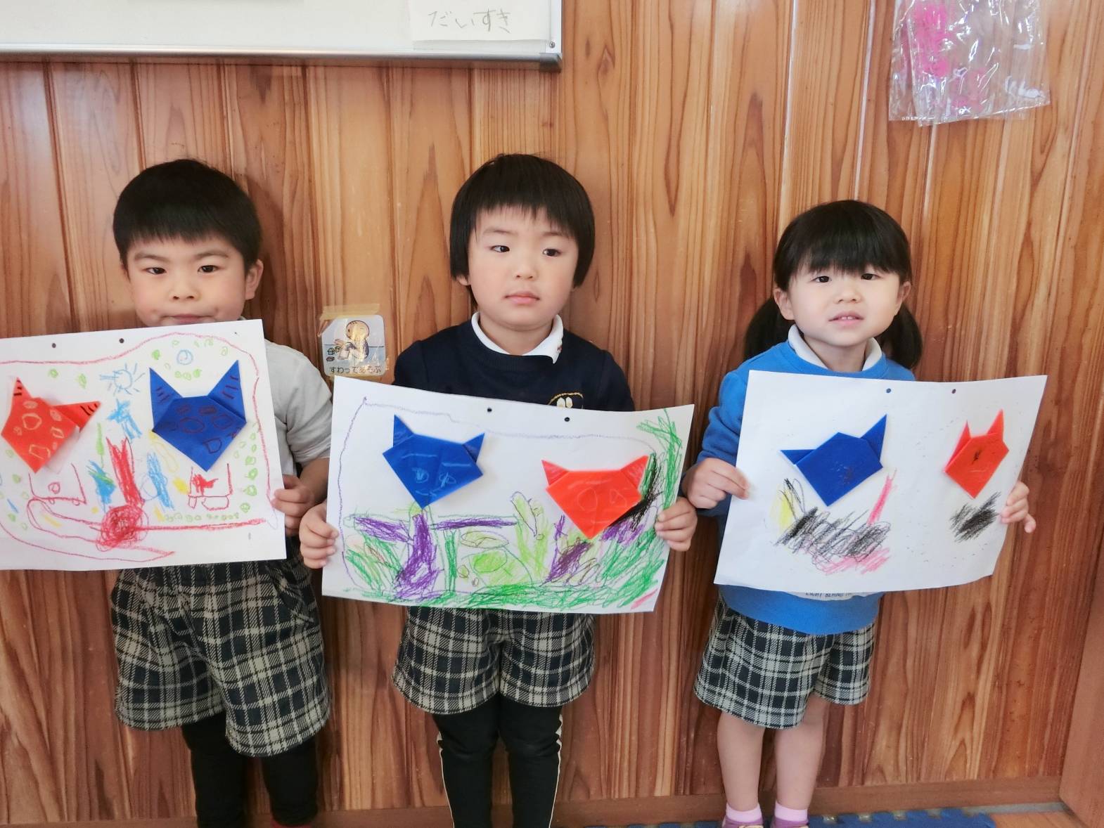 今年度最後のりす組での折り紙製作は、今までで一番難しかったこともあり「先生、ここ分からない。」、「僕が教えてあげるよ。」、「こうしたらいいんだって。」と保育者や友だちと協力しながら作る姿が見られました。