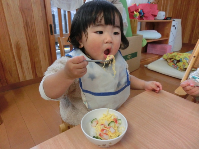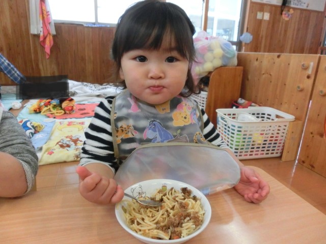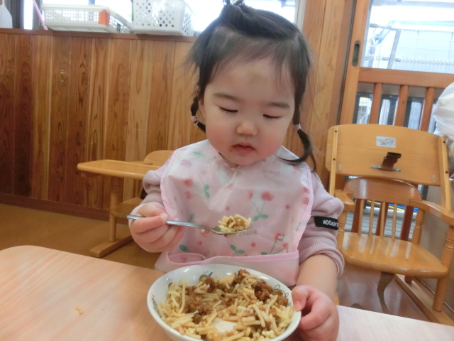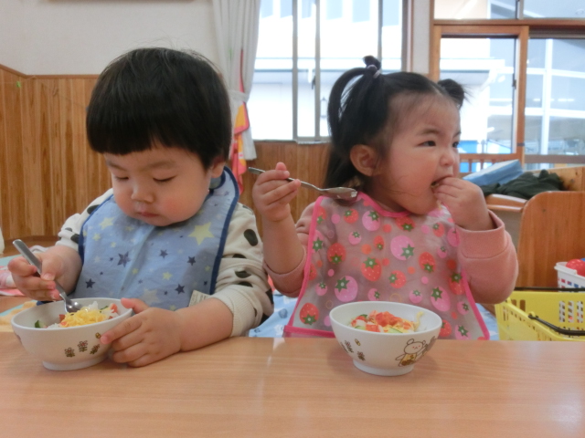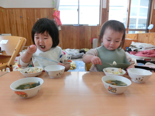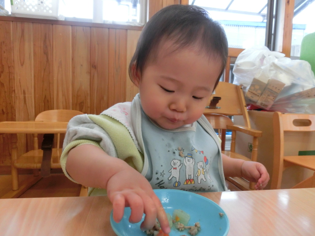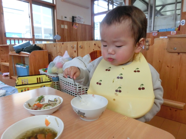 毎日、食事の時間が楽しみなひよこ組さん! 手口拭きで口元を拭き、袖をまくって食べる準備ができるといただきます!と元気に挨拶をします。 各々スプーンの持ち方も定着してきており、自身で食材をすくって食べ進める姿が見られます。 「美味しいね。」、「お皿に手を添えようね。」と声を掛けると、保育者とアイコンタクトを取り笑顔を見せてくれます♪ 最後の食材まで綺麗に食べ、満足そうにする子どもたちです! 丁寧に援助を行い、楽しく食べる環境を作っていきたいと思います。