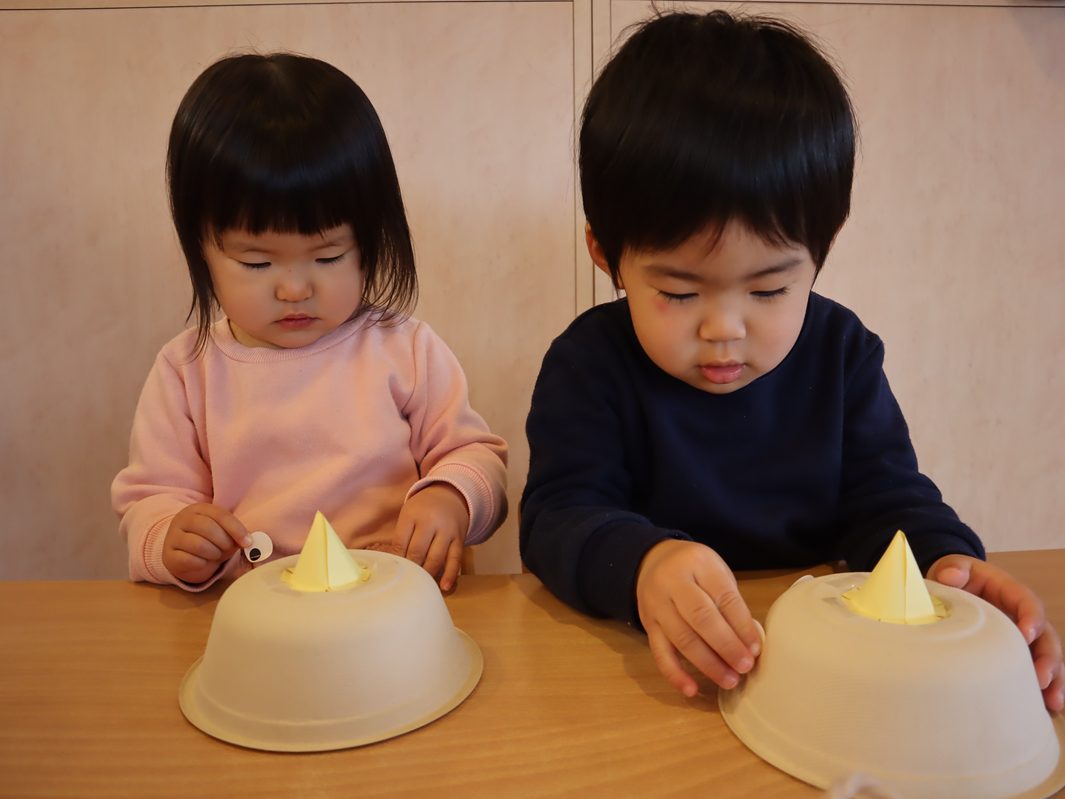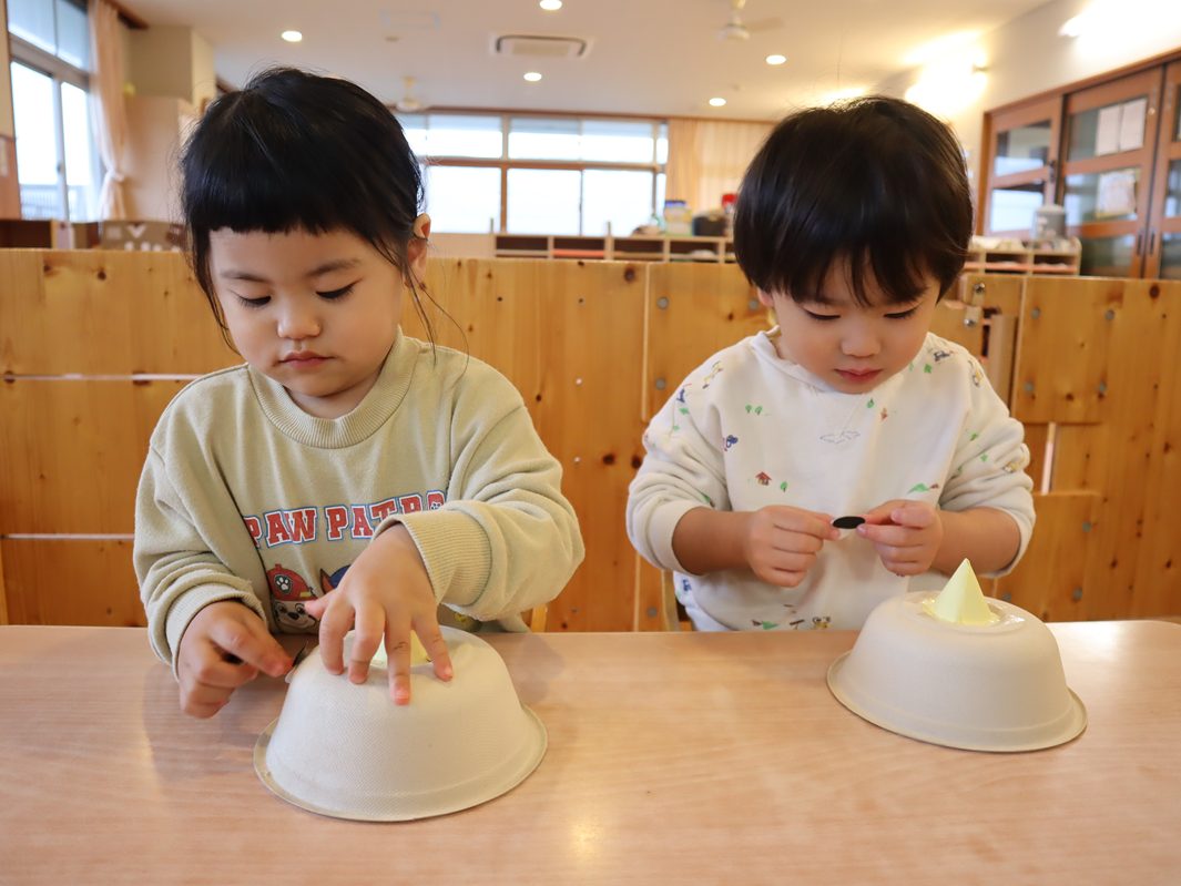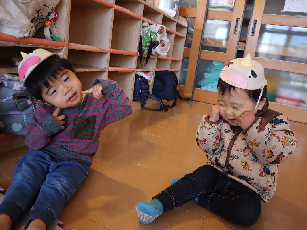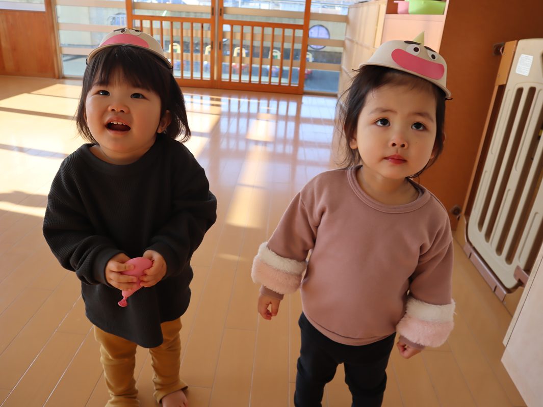 節分製作では鬼の帽子を作った子どもたち。 目や口など、顔のパーツをペタペタと貼っていきます。 「目だよ~!」「お口はここ!」と保育者や友だちの顔をよく観察しながら貼っていく姿が見られました。 怒った顔や笑った顔などそれぞれ素敵な鬼の帽子が出来上がりました! 完成すると満足げにかぶって「見て!」「できた~。」と嬉しそうな表情を見せてくれたこあら組さんです。