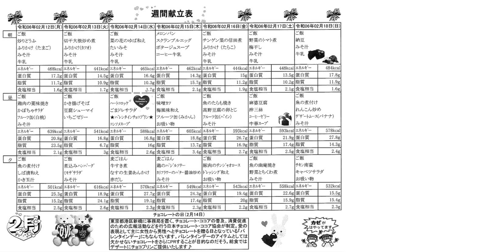 2月12日(月)~2月18日(月)の献立表になります。ぜひご覧ください。