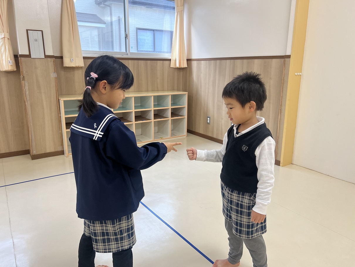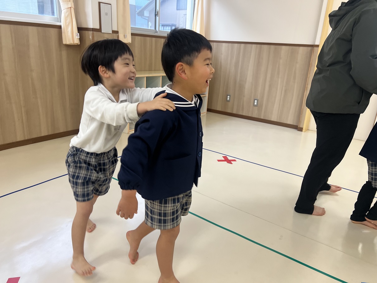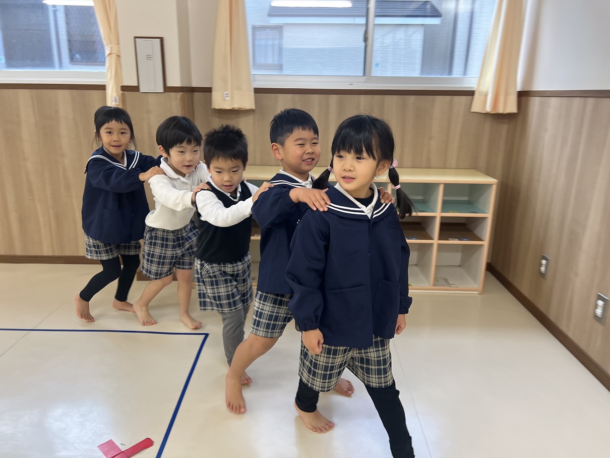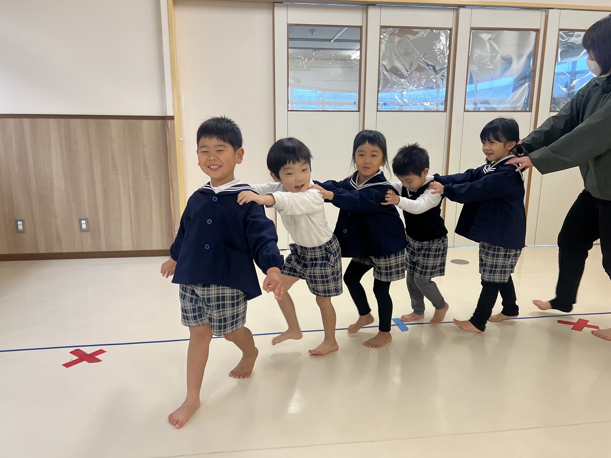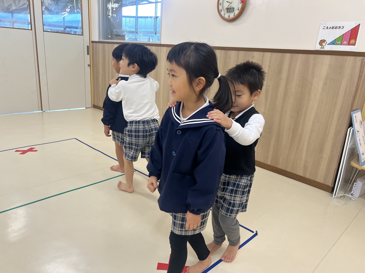 今回は、勝敗を受け入れることとルールを理解することを目的として、とら①グループさんではじゃんけん列車を行いました! 「やったことある!」 とノリノリで歌を歌いながら列車を走らせる子ども達♪ じゃんけんのルールも理解できており、少しずつ勝敗の受入れも行うことができていますよ! 一回目にジャンケンを行ったお友だちとは、違うお友だちとジャンケンを行うなどのルールを加えていきました。 お友だちの肩に優しく手を置いて、長い列車を完成させたとら①グループさんでした☆