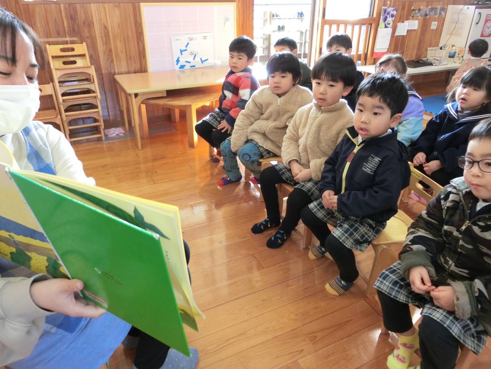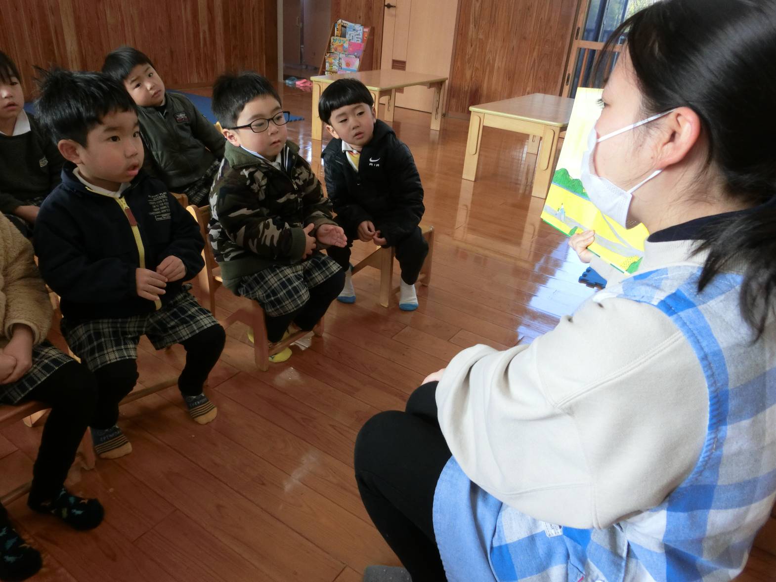 サークルタイムでは、実習生に絵本を読んでもらったり、遊ぶ時間には絵描きやブロック遊びを一緒に楽しんでいます。