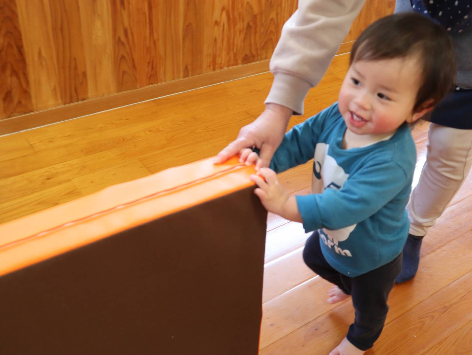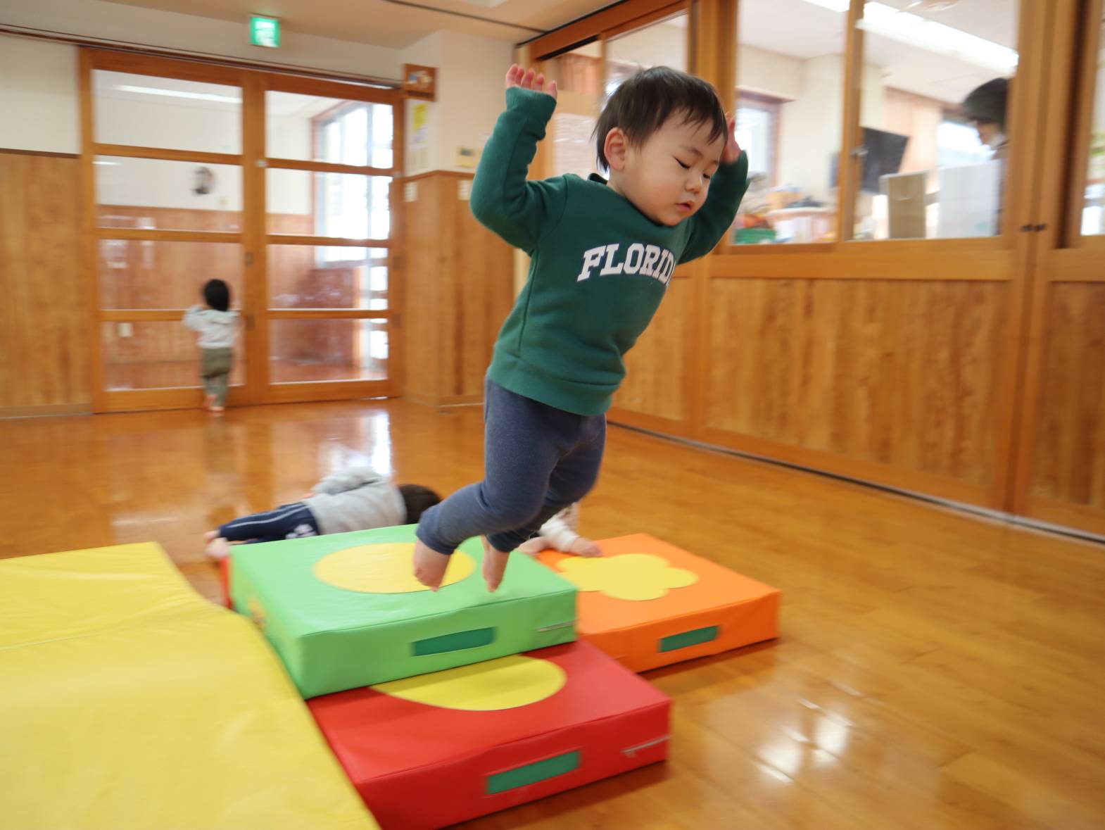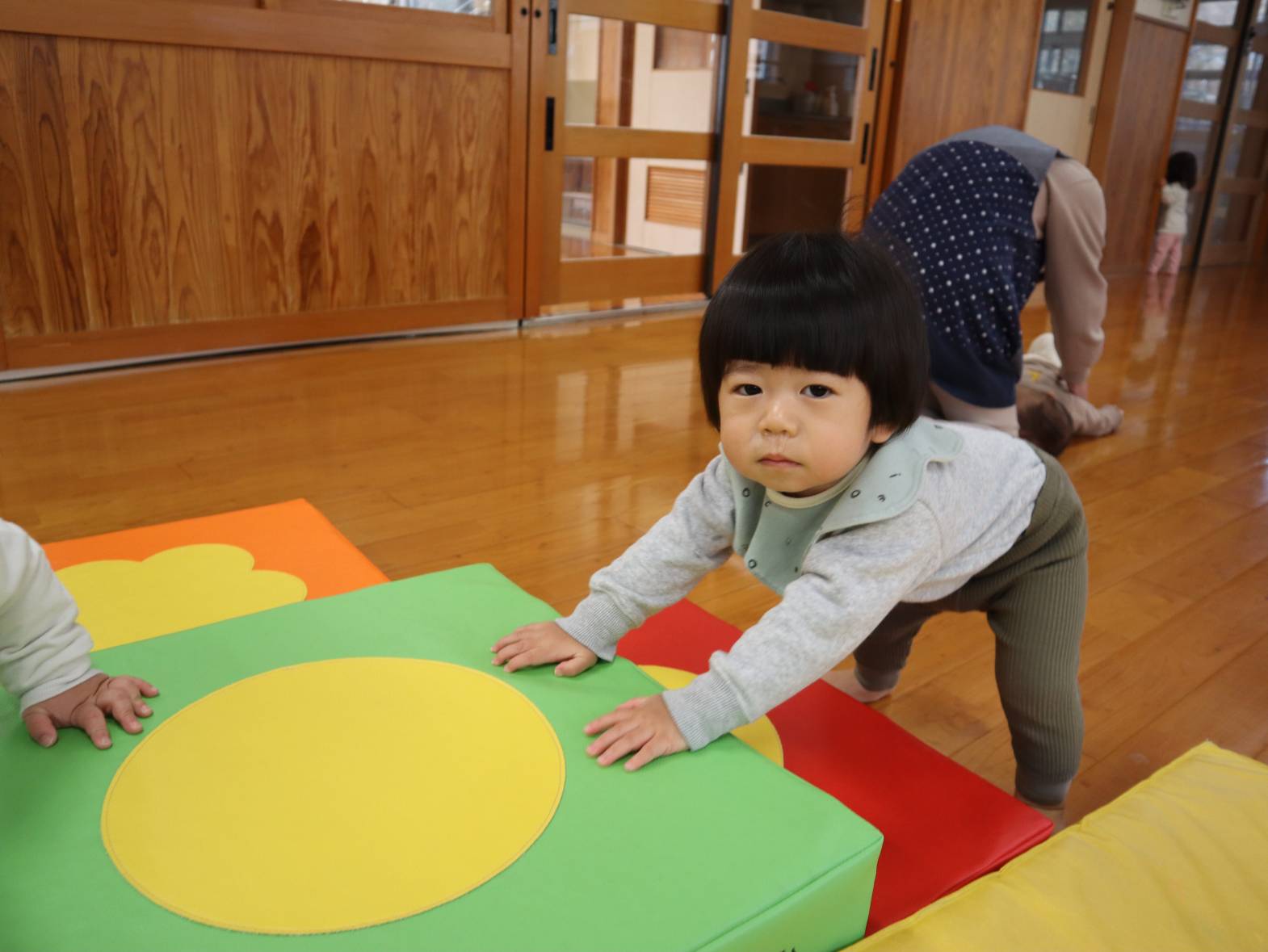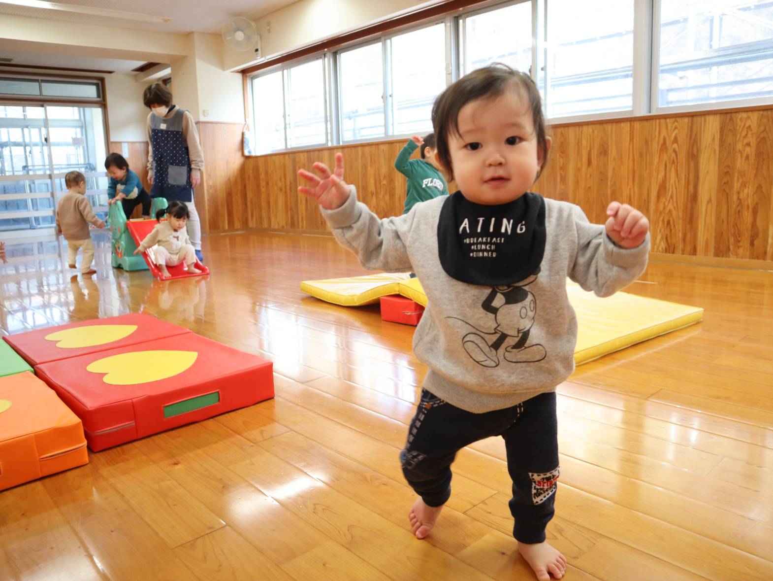 日に日に活発になっているひよこ組さん! マットを出すと大喜びで上り下りを楽しむ子どもたち。 手を繋がなくても平均台マットや坂を渡れるようになったり、「ぴょんぴょん!」と言ってジャンプをして降りたりと、できることがどんどん増えています。 ほとんどの子どもが歩けるようになり、それぞれ自由に体を動かして楽しんでいます! 保育者の手伝いをして「いちに、いちに」と片付けまでしっかりしてくれるひよこ組さんです。