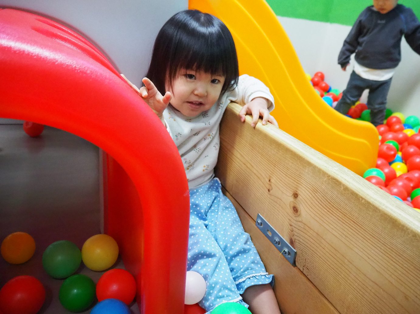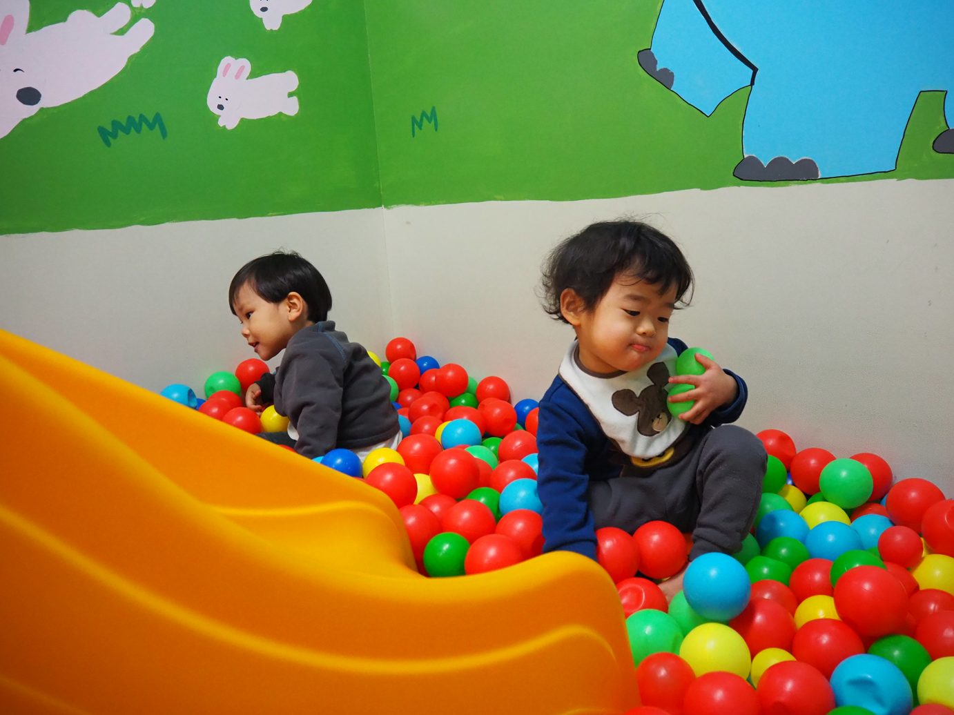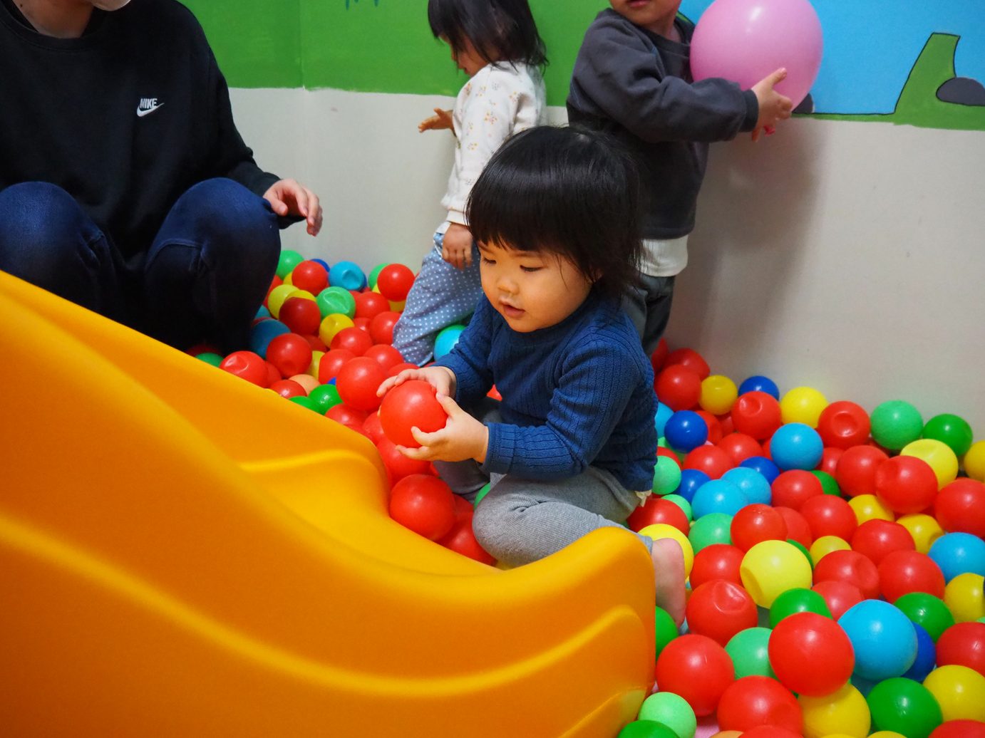 ボールの部屋で元気いっぱい遊ぶ子どもたち。ボール一つ一つを手に取ると、「これは?」、「赤のボール!」などと色あてをして遊ぶ姿が見られます。最近では、水色も覚えてきているため、青と水色を比べてみて色の違いを楽しんでいます。