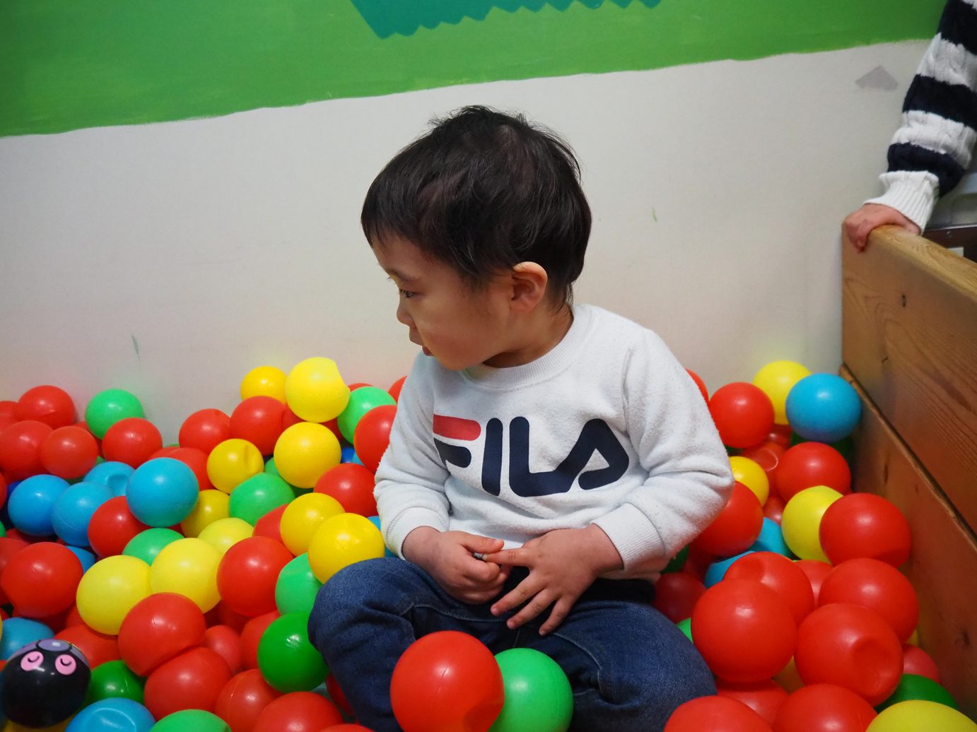 ボールを上に投げて落ちてくる音を楽しんだり、ボールプールの中を泳いだりと様々な遊びに発展させながら友達同士で真似して楽しむこあら組さんです。