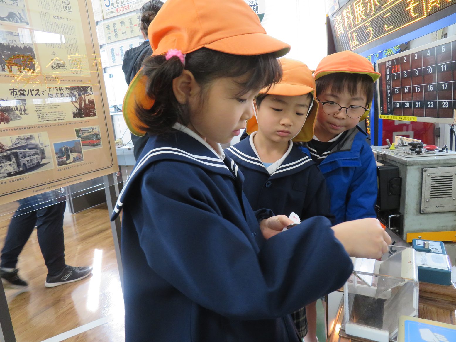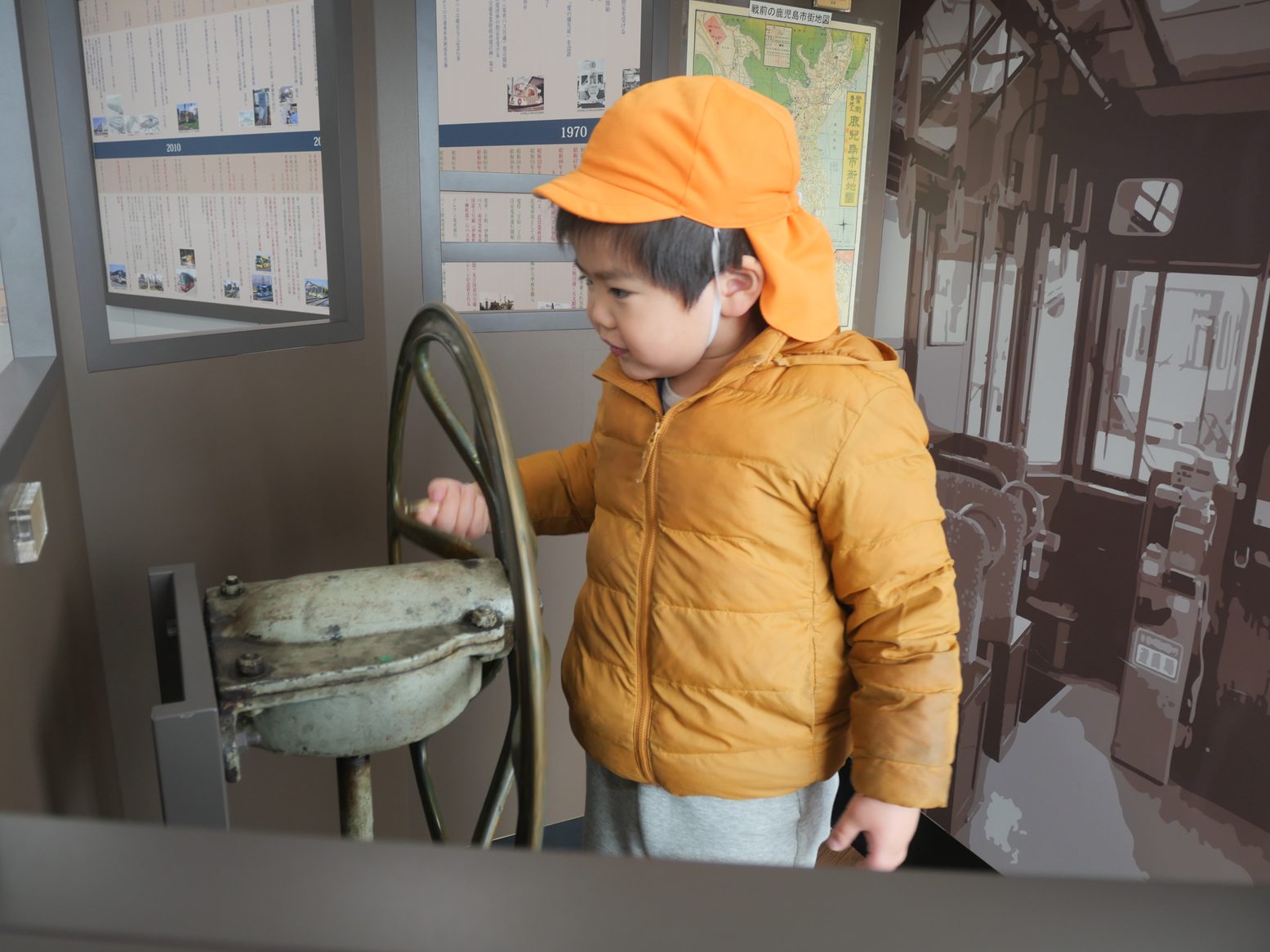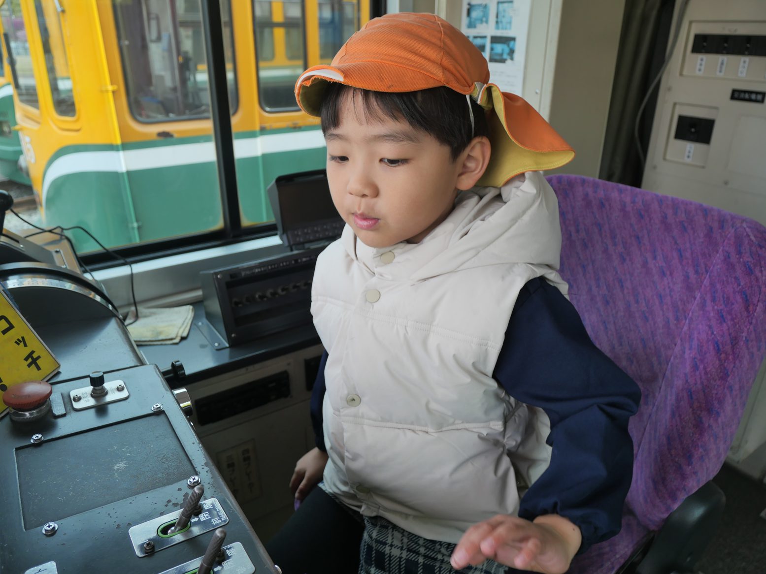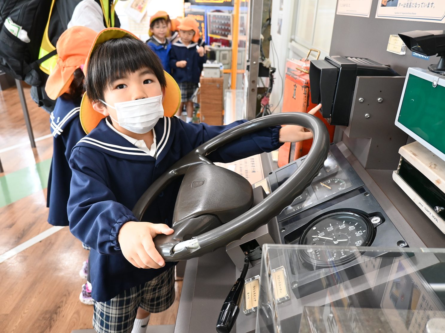 ハンドルやブレーキ、電光掲示板などを間近で見ることができて、大興奮のきりん組さん。