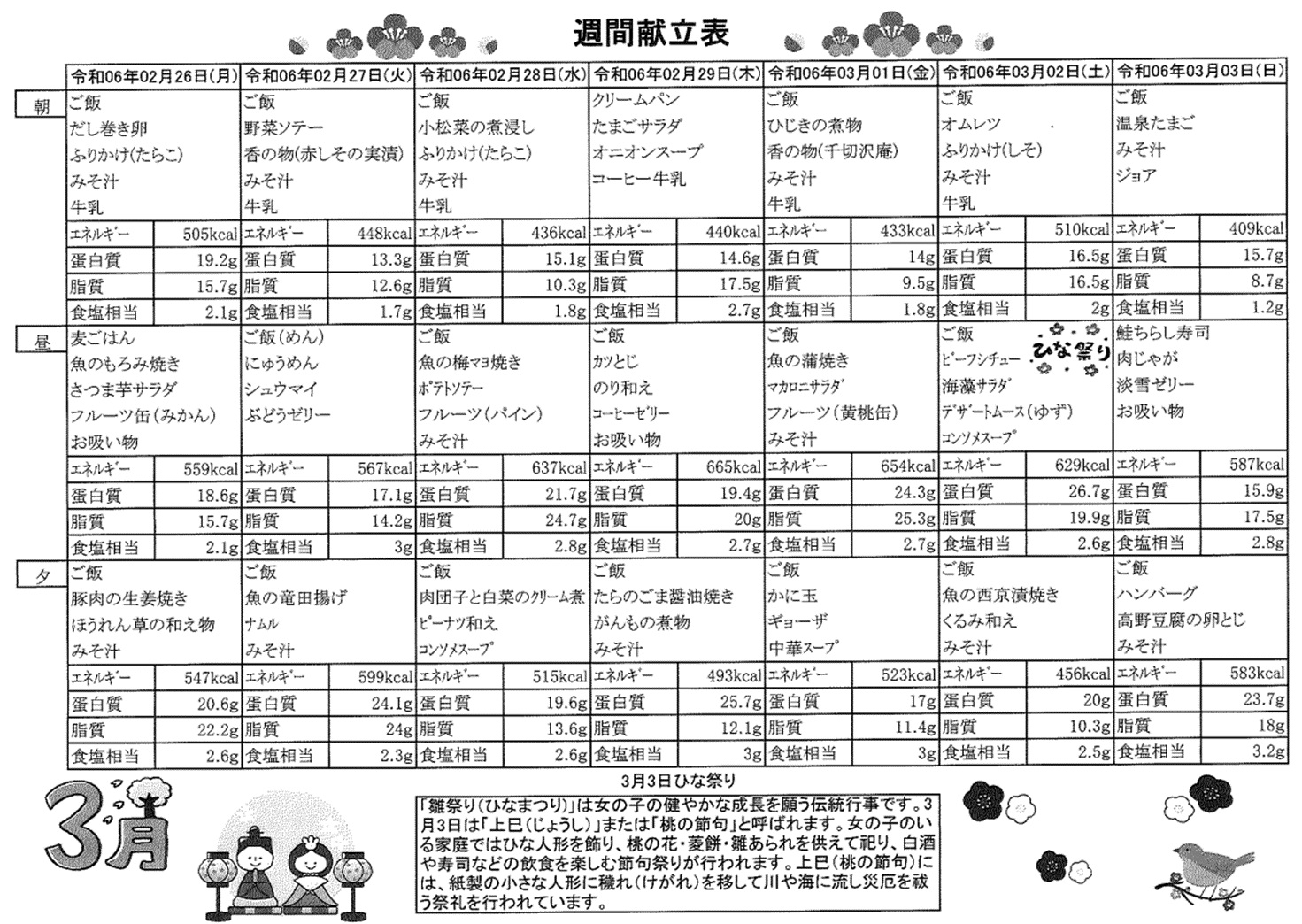 2月26日(月)~3月3日(日)の献立表になります。是非ご覧ください。