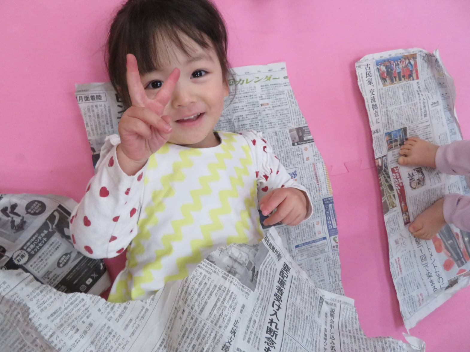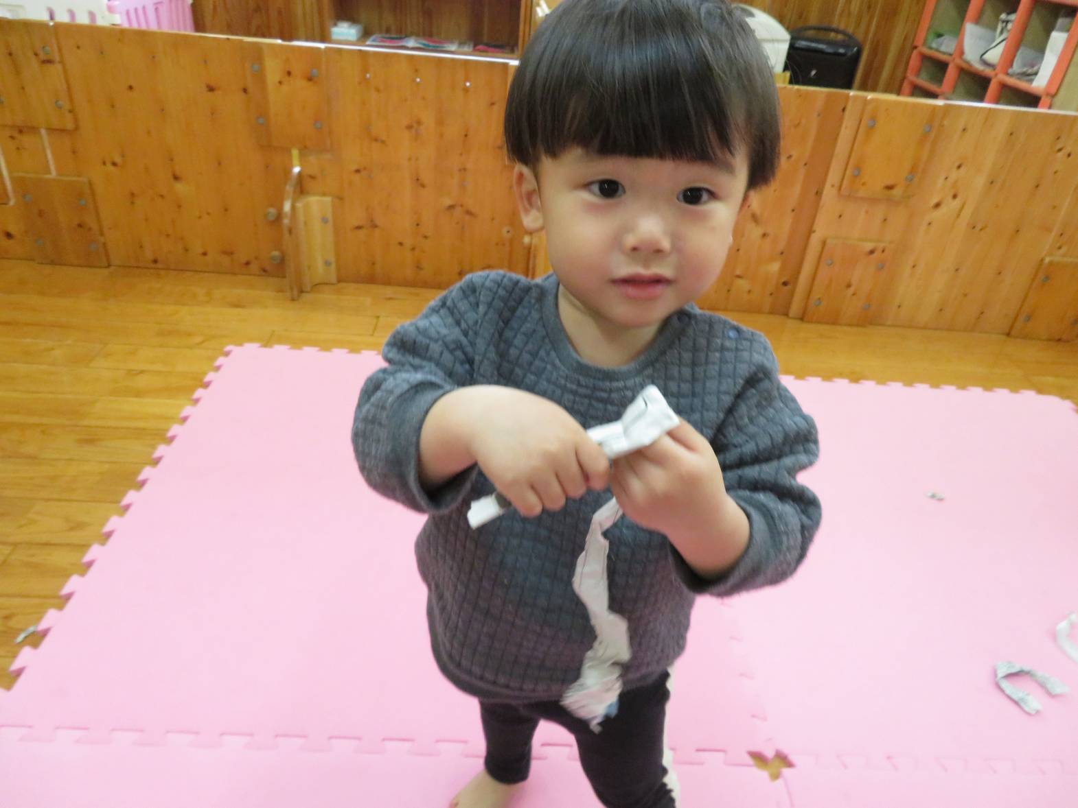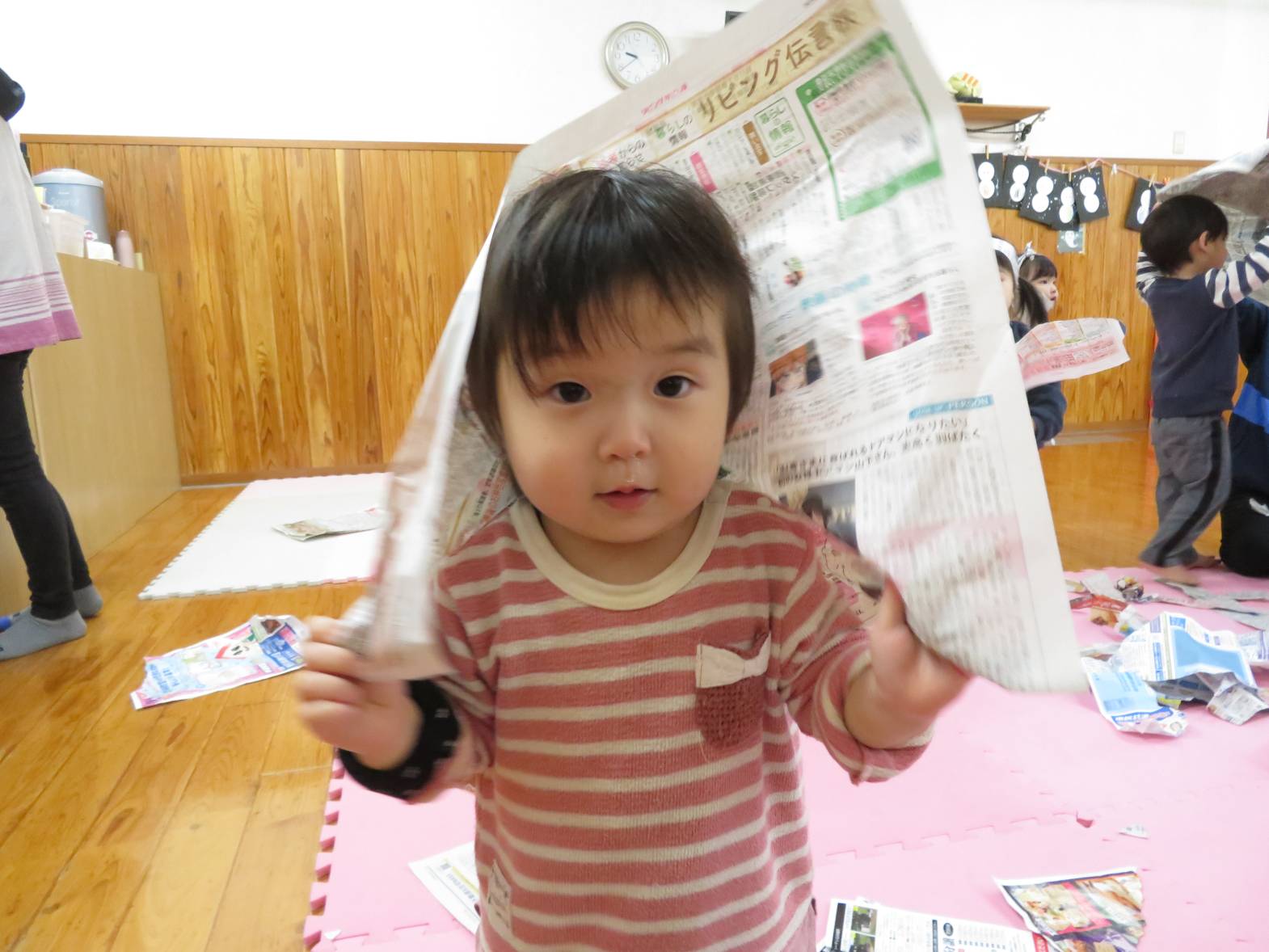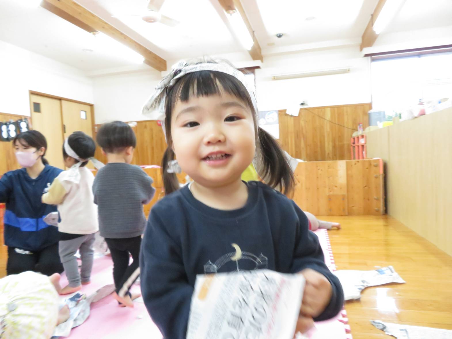 雨の日が続き、「今日も外行かない?」と少し残念そうにする子どもたちですが、室内での遊びにも全力で楽しんでいます! 今日は新聞紙遊びを行いました。 新聞を破ったり、丸めたりしながら様々な物を作っていく子どもたち。 新聞を洋服のように身に付けると、「見てみて~!」と保育者に伝えたり、「かわいい?」と、友だちと見せ合ったりする姿が見られました。 また、新聞を丸めると「ポーンポーン!」とボール遊びをしたり、「おやすみ~!」と布団のようにしてごっこ遊びをしたりして楽しんでいたこあら組さんでした♪