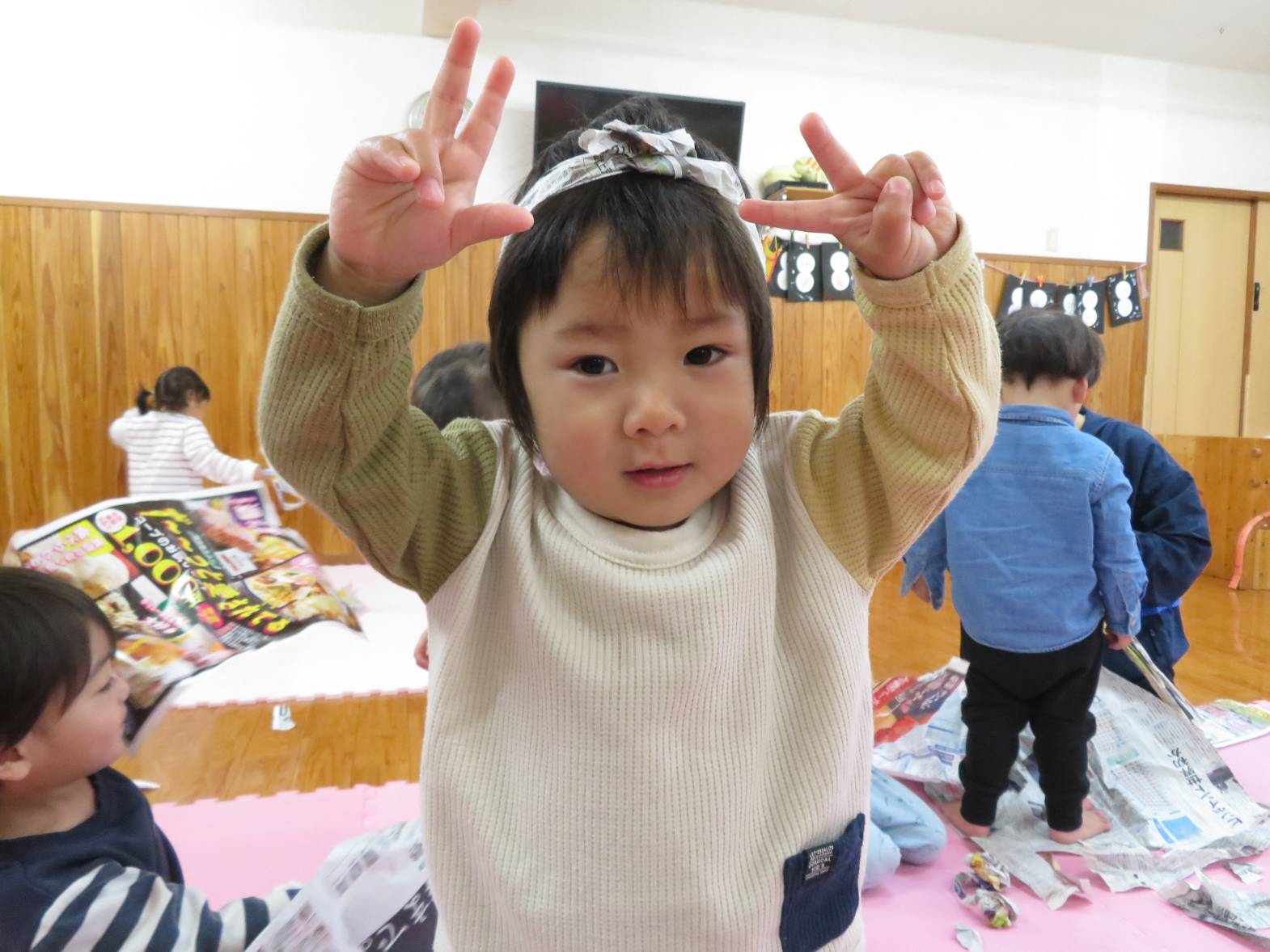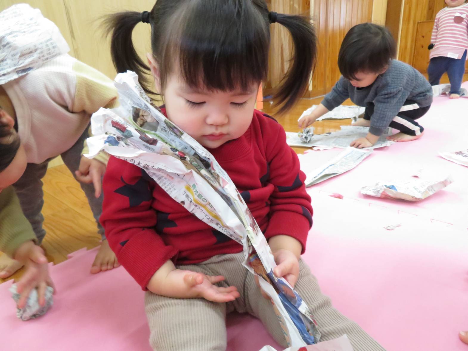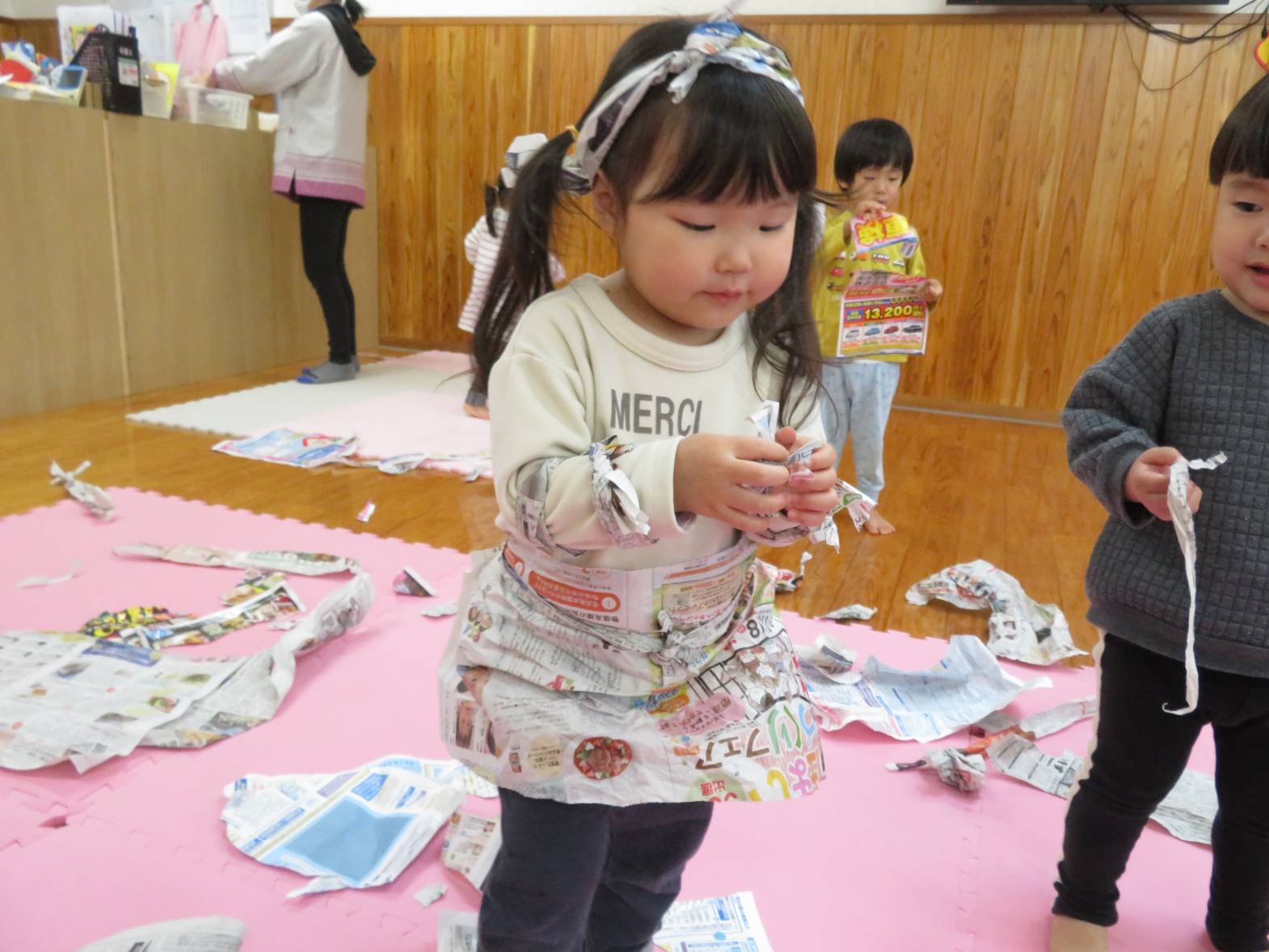 雨の日が続き、「今日も外行かない?」と少し残念そうにする子どもたちですが、室内での遊びにも全力で楽しんでいます! 今日は新聞紙遊びを行いました。 新聞を破ったり、丸めたりしながら様々な物を作っていく子どもたち。 新聞を洋服のように身に付けると、「見てみて~!」と保育者に伝えたり、「かわいい?」と、友だちと見せ合ったりする姿が見られました。 また、新聞を丸めると「ポーンポーン!」とボール遊びをしたり、「おやすみ~!」と布団のようにしてごっこ遊びをしたりして楽しんでいたこあら組さんでした♪