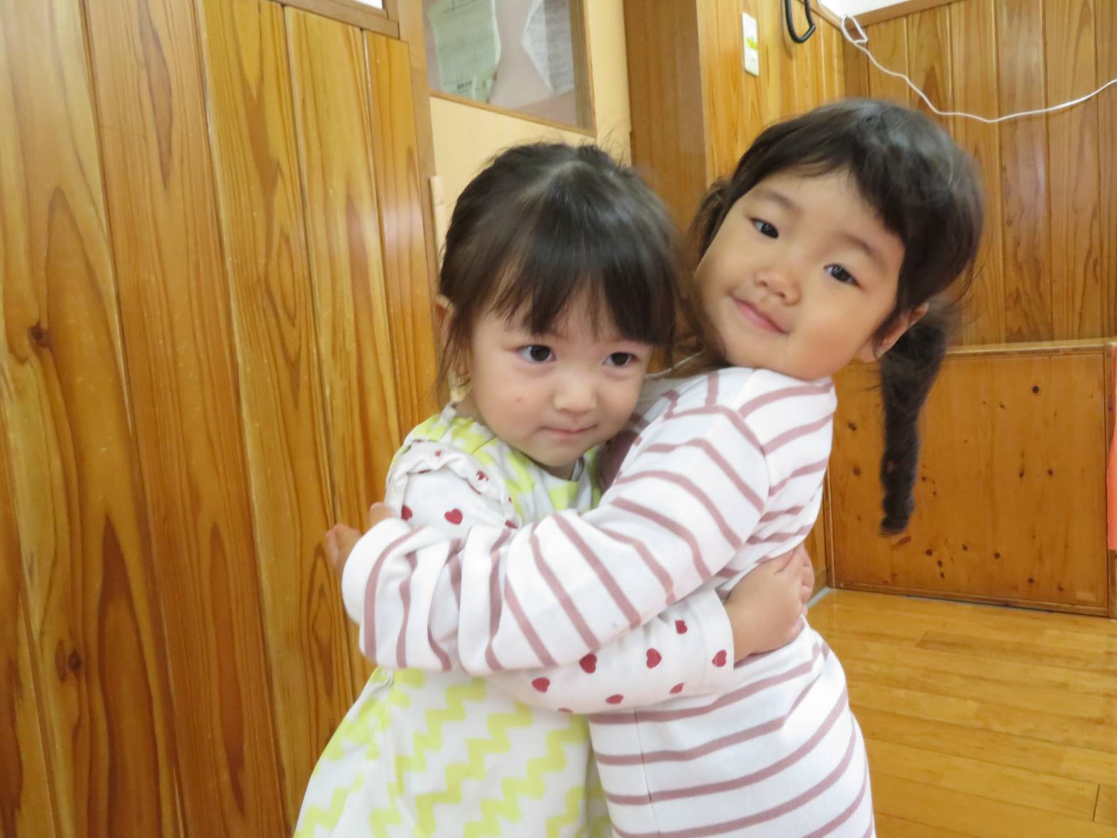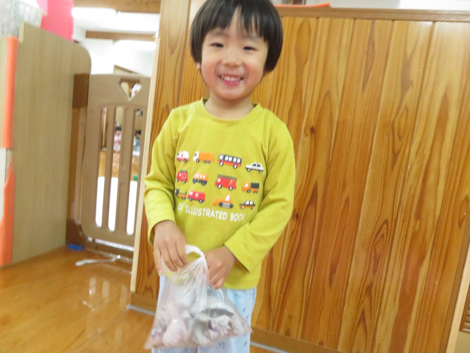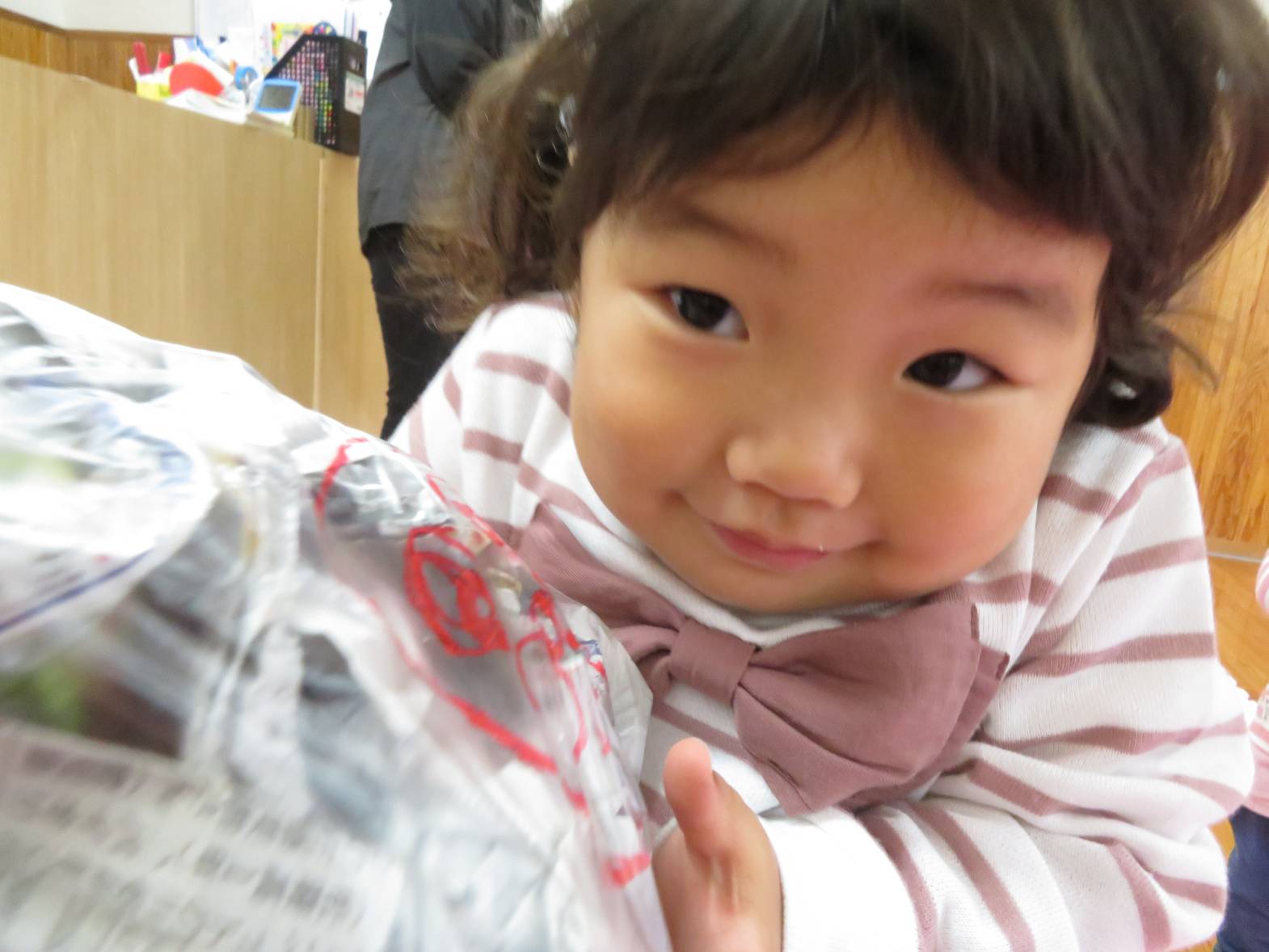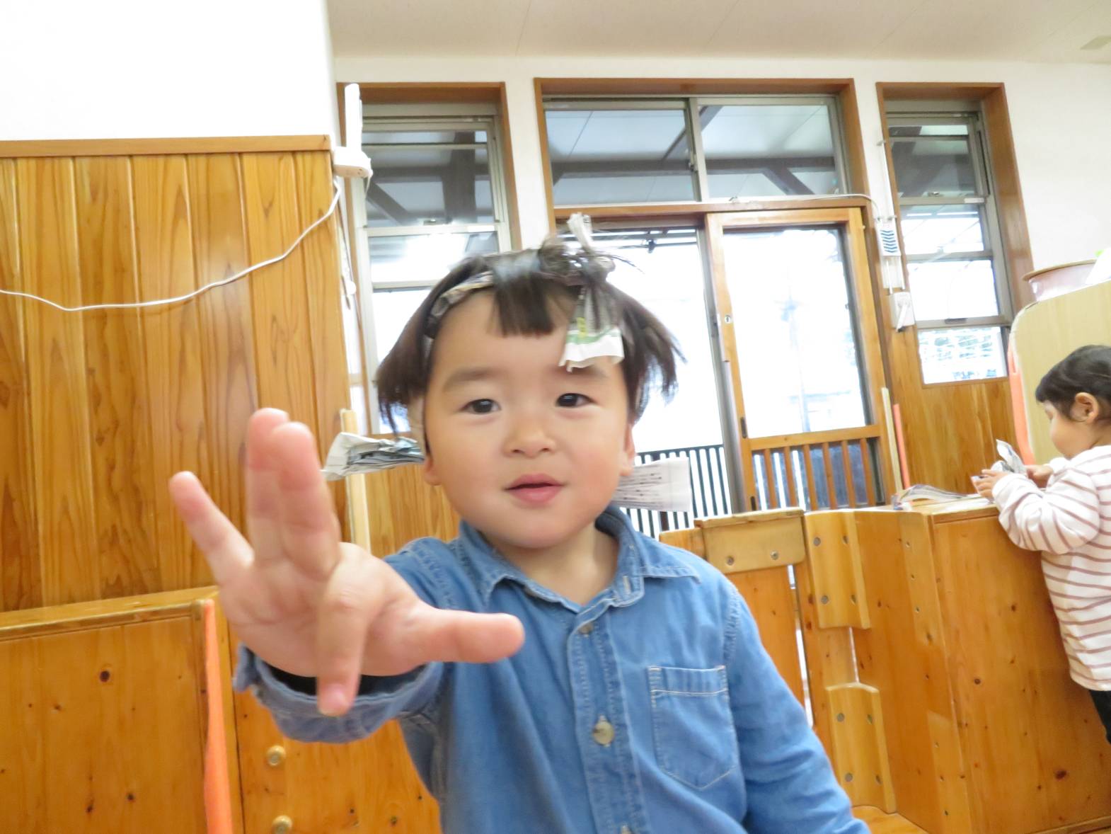 雨の日が続き、「今日も外行かない?」と少し残念そうにする子どもたちですが、室内での遊びにも全力で楽しんでいます! 今日は新聞紙遊びを行いました。 新聞を破ったり、丸めたりしながら様々な物を作っていく子どもたち。 新聞を洋服のように身に付けると、「見てみて~!」と保育者に伝えたり、「かわいい?」と、友だちと見せ合ったりする姿が見られました。 また、新聞を丸めると「ポーンポーン!」とボール遊びをしたり、「おやすみ~!」と布団のようにしてごっこ遊びをしたりして楽しんでいたこあら組さんでした♪