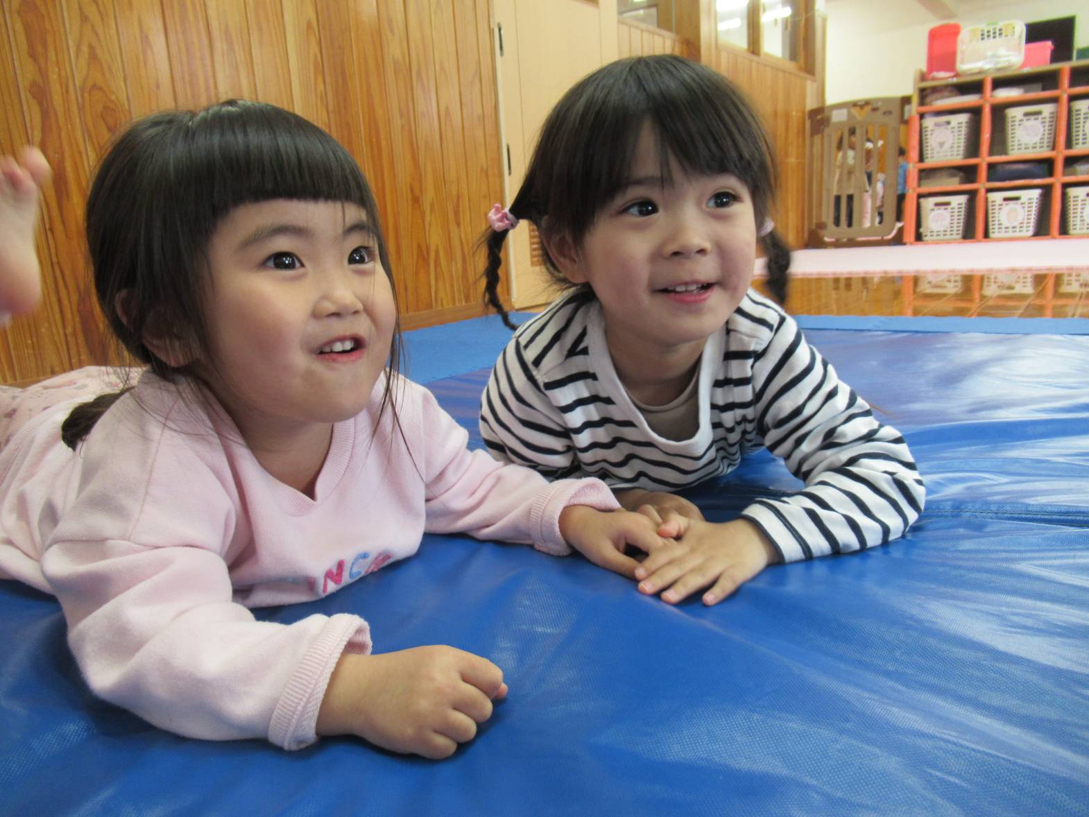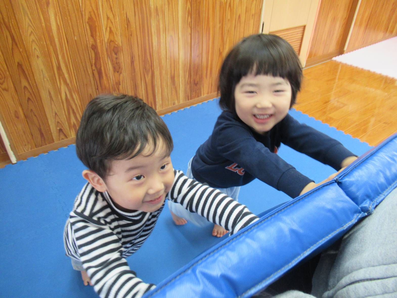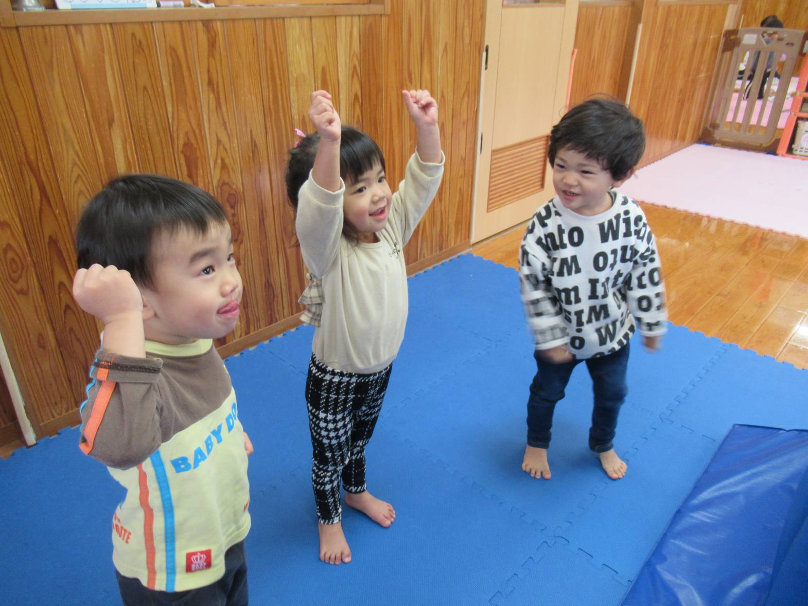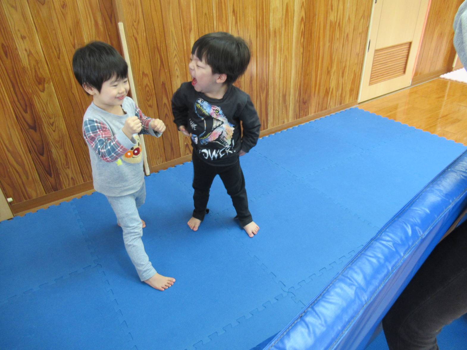 マット遊びでは、マットを怪獣に見立てて倒す遊び“マット怪獣”が好きな子どもたち。 友だちと「頑張るぞ!」と気合を入れて、マットに向かっていきます! 力いっぱいマットに向かい、マットが倒れると「やったー!」と大喜び! 「次は僕がする!」、「もう一回する!」と何度も繰り返し楽しむぱんだ組さんでした。