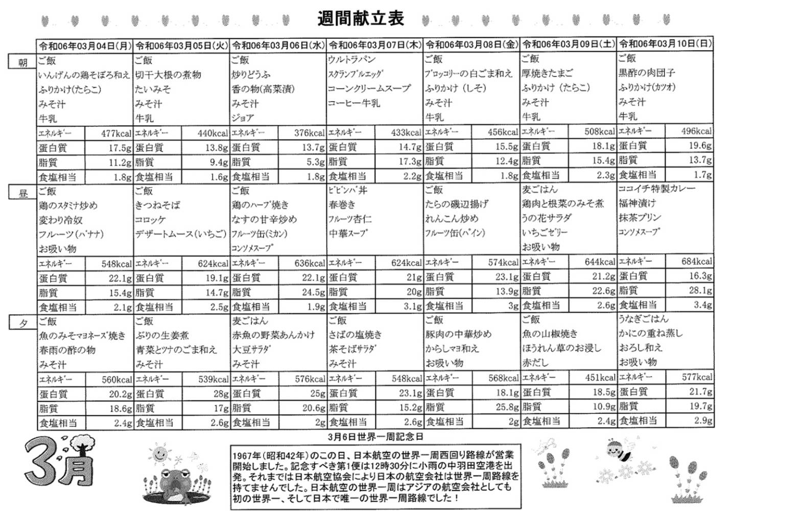 3月4日(月)~3月10日(日)の献立表になります。ぜひご覧ください。