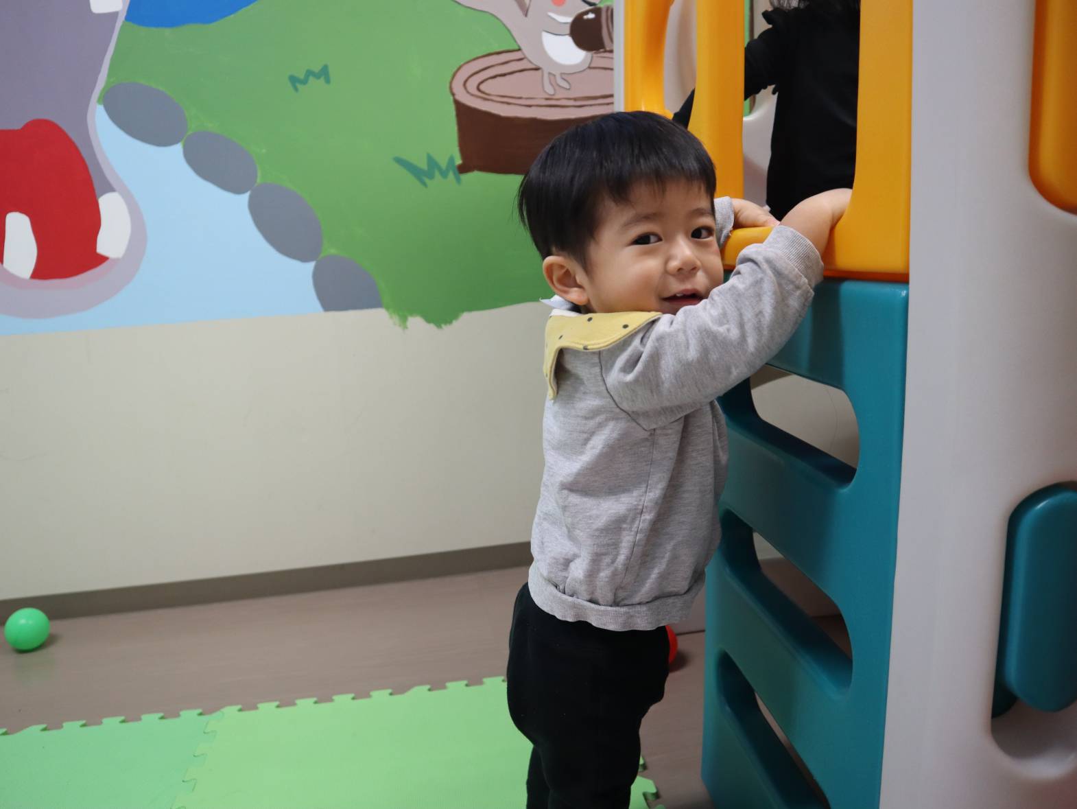 はじめはお尻を支えていましたが、今ではほとんどの子どもが一人で登れるようになりました。