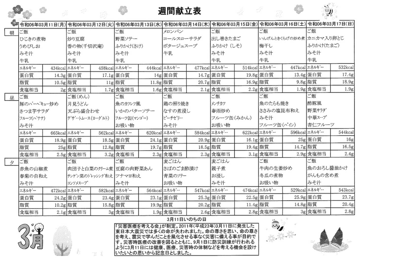 3月11日(月)~3月17日(日)の献立表になります。ぜひご覧ください。