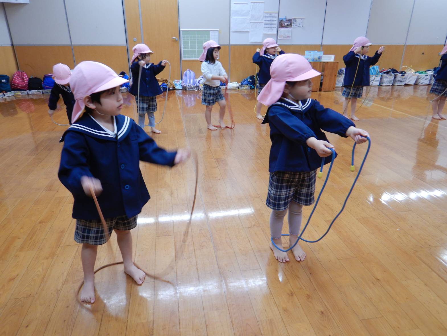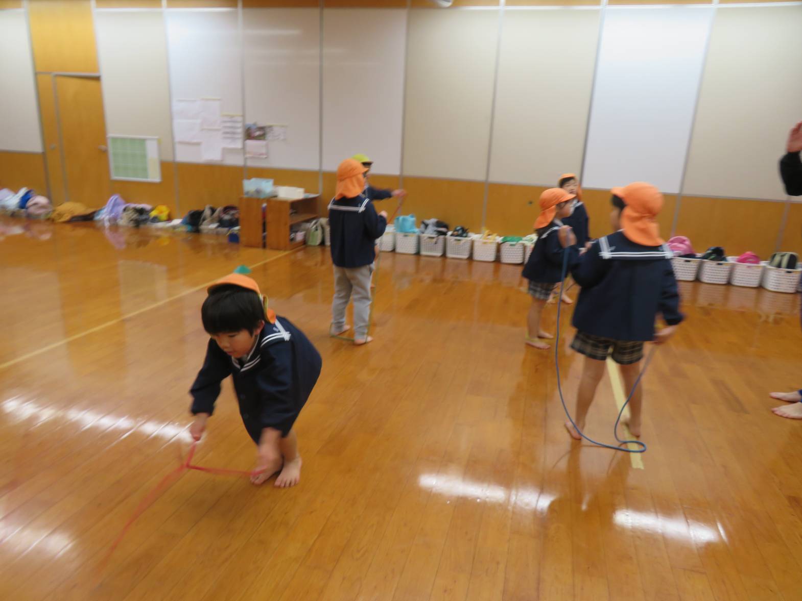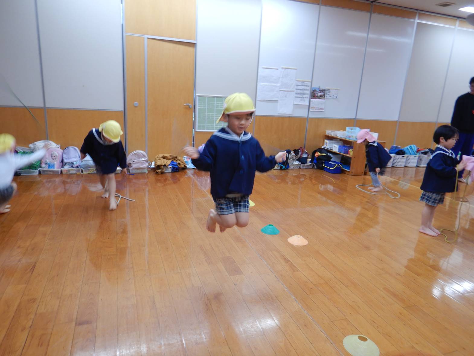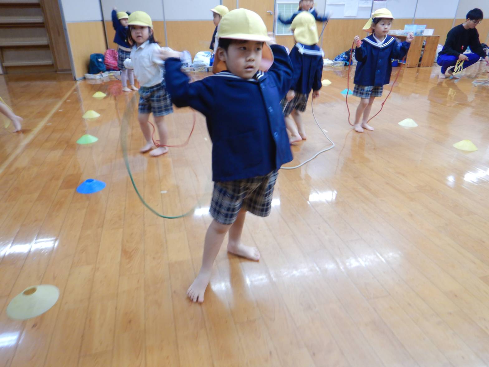 また今日は前とび、後ろとびをやり遂げて新たに「あやとび」を教えてもらい挑戦しました。「あと少し!」と、あと一歩のところまでできるようになる子の姿も見られ、ますます縄跳びへの挑戦に燃える子どもたちです。