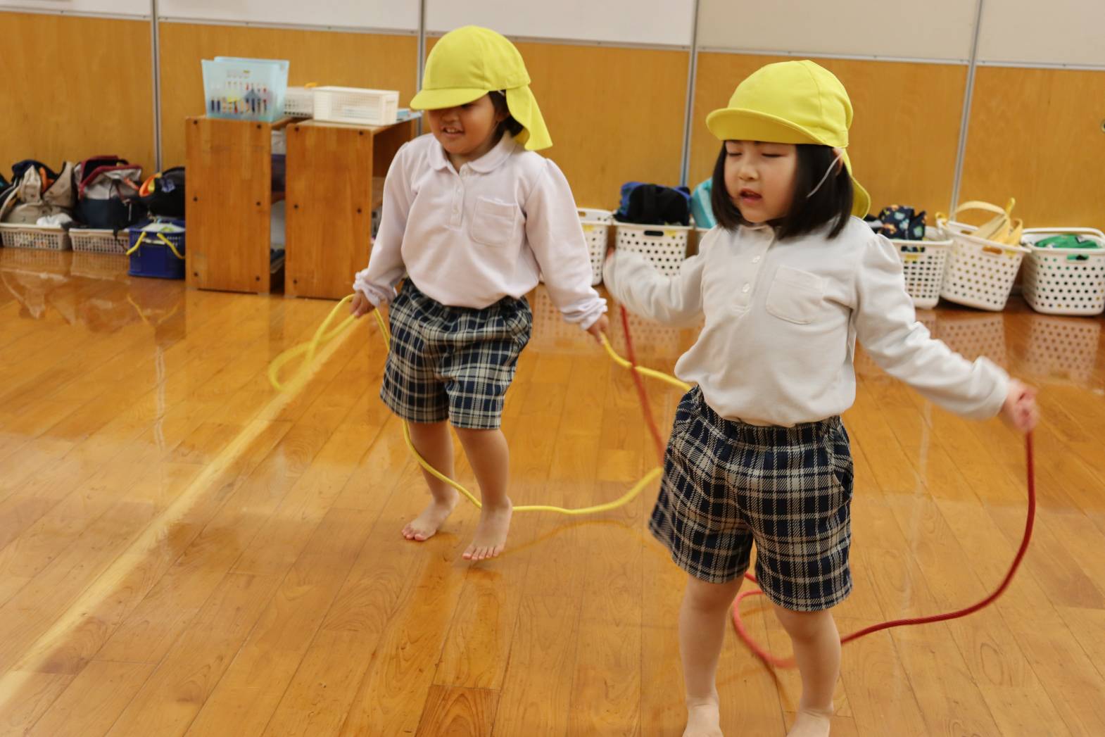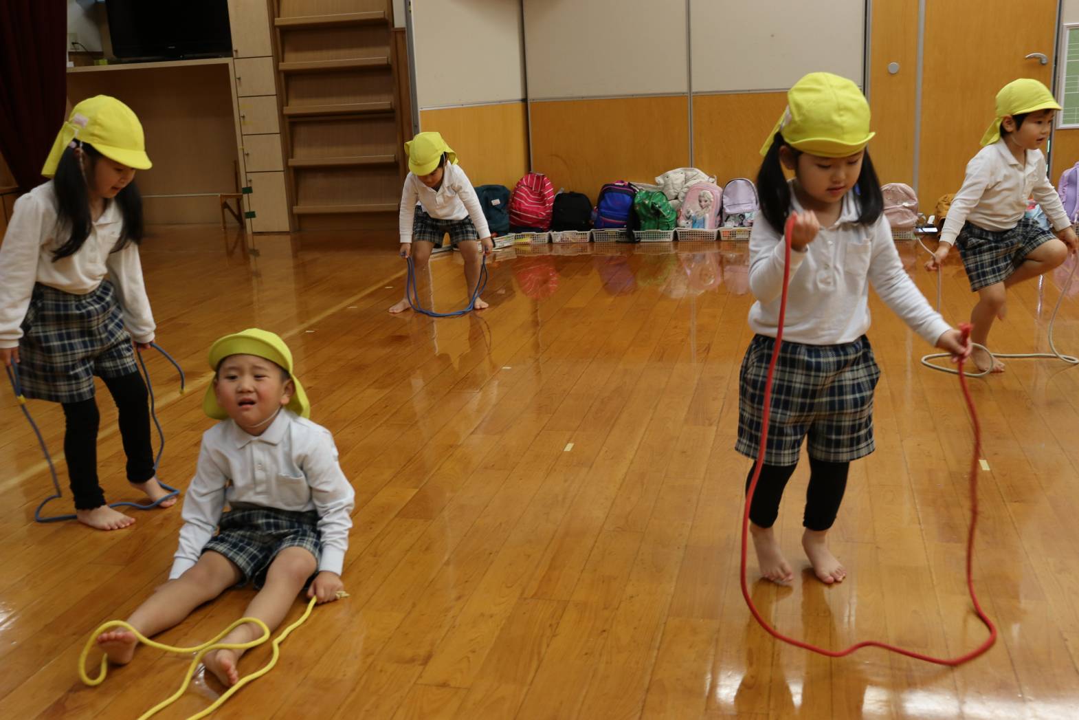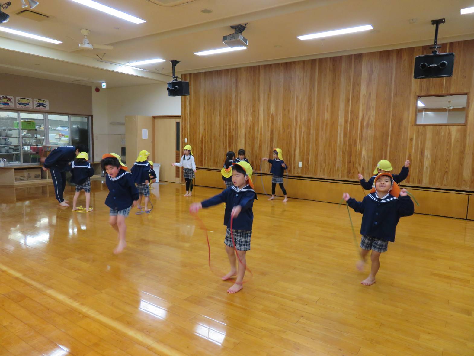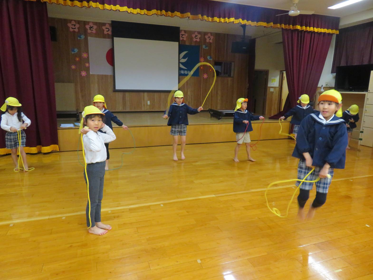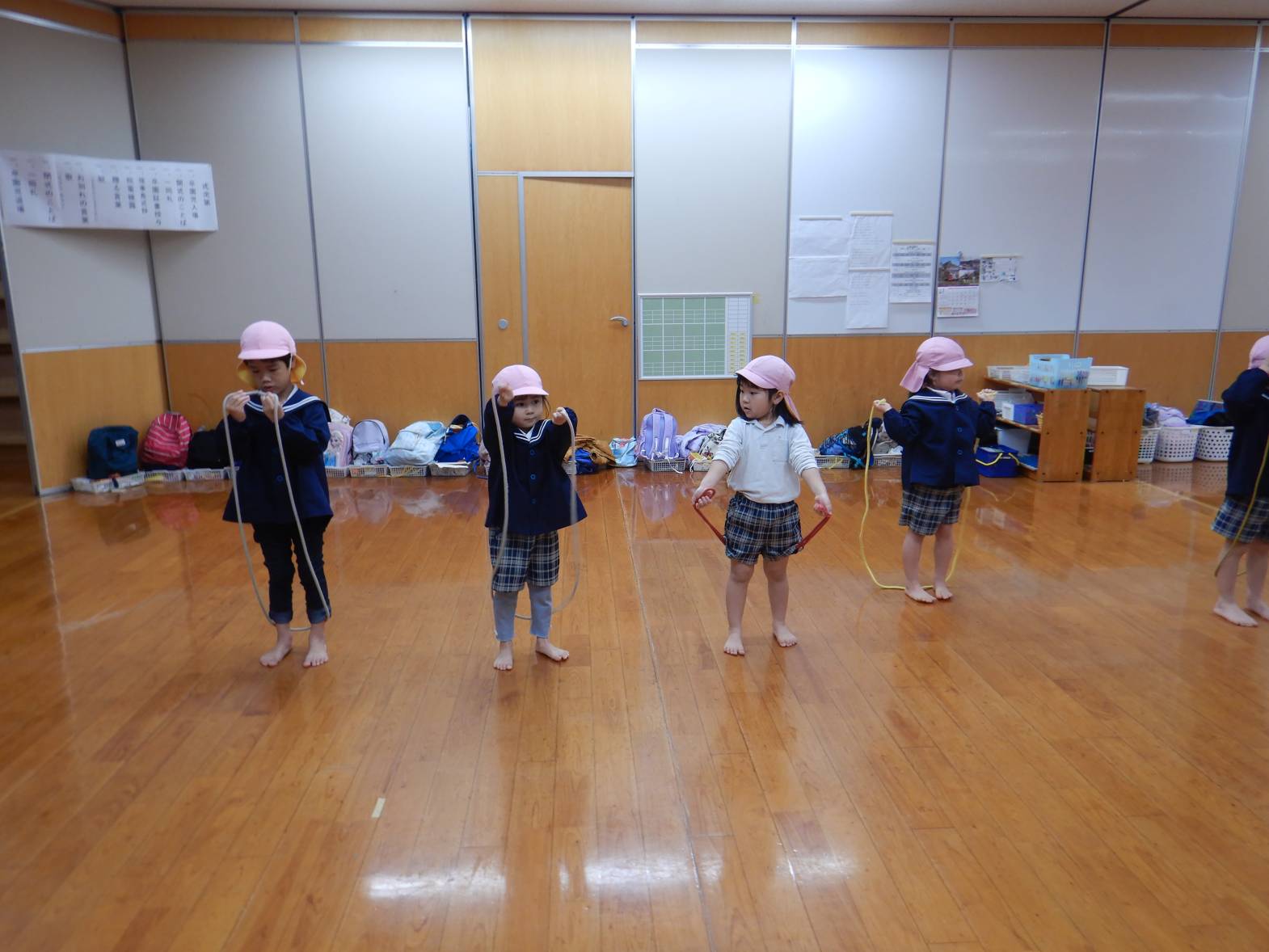 また今日は前とび、後ろとびをやり遂げて新たに「あやとび」を教えてもらい挑戦しました。「あと少し!」と、あと一歩のところまでできるようになる子の姿も見られ、ますます縄跳びへの挑戦に燃える子どもたちです。