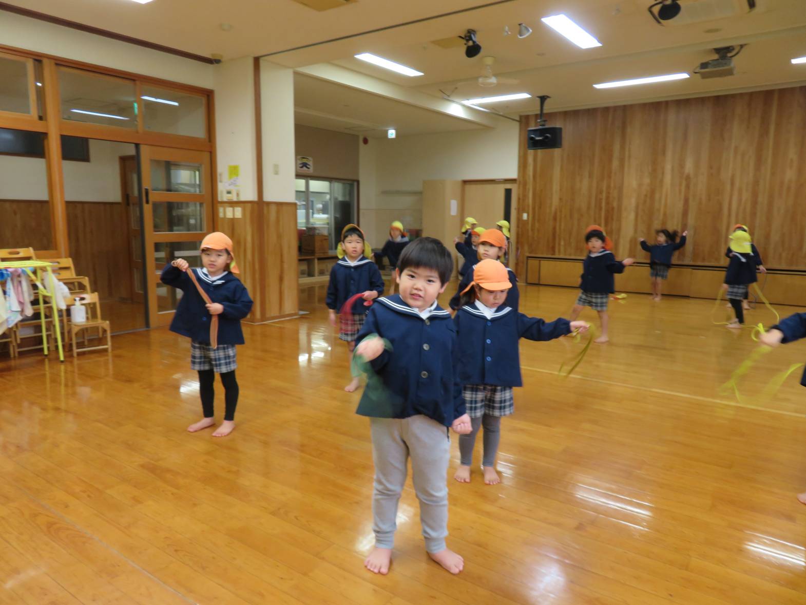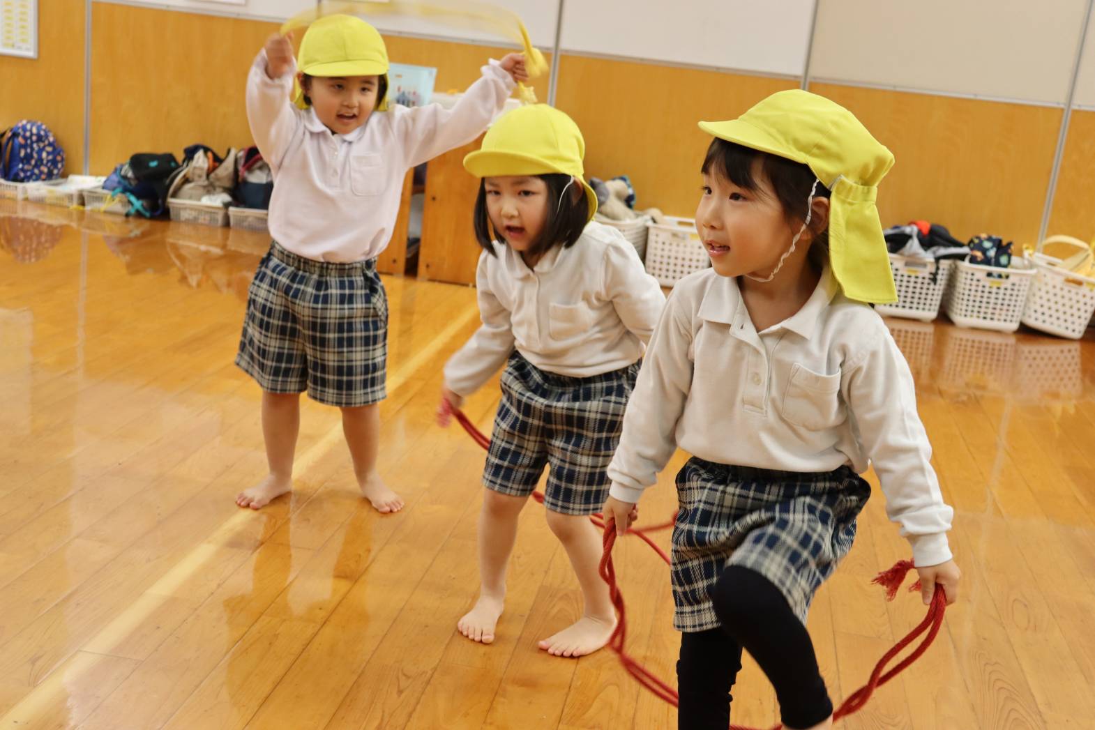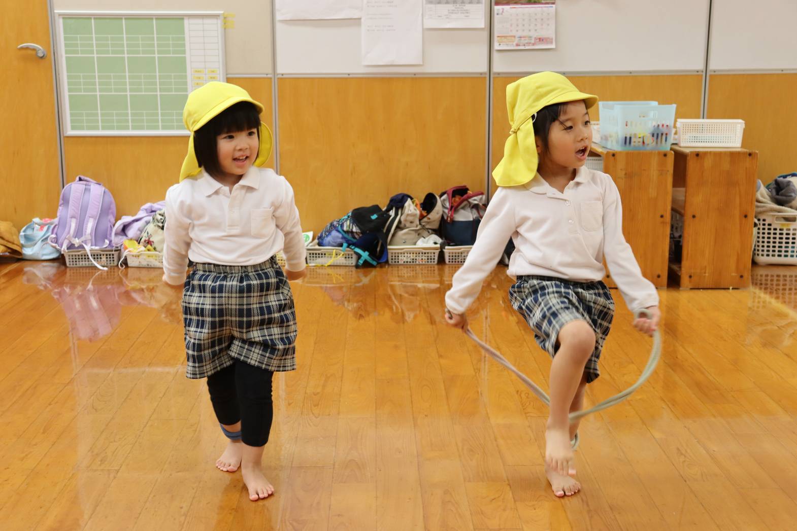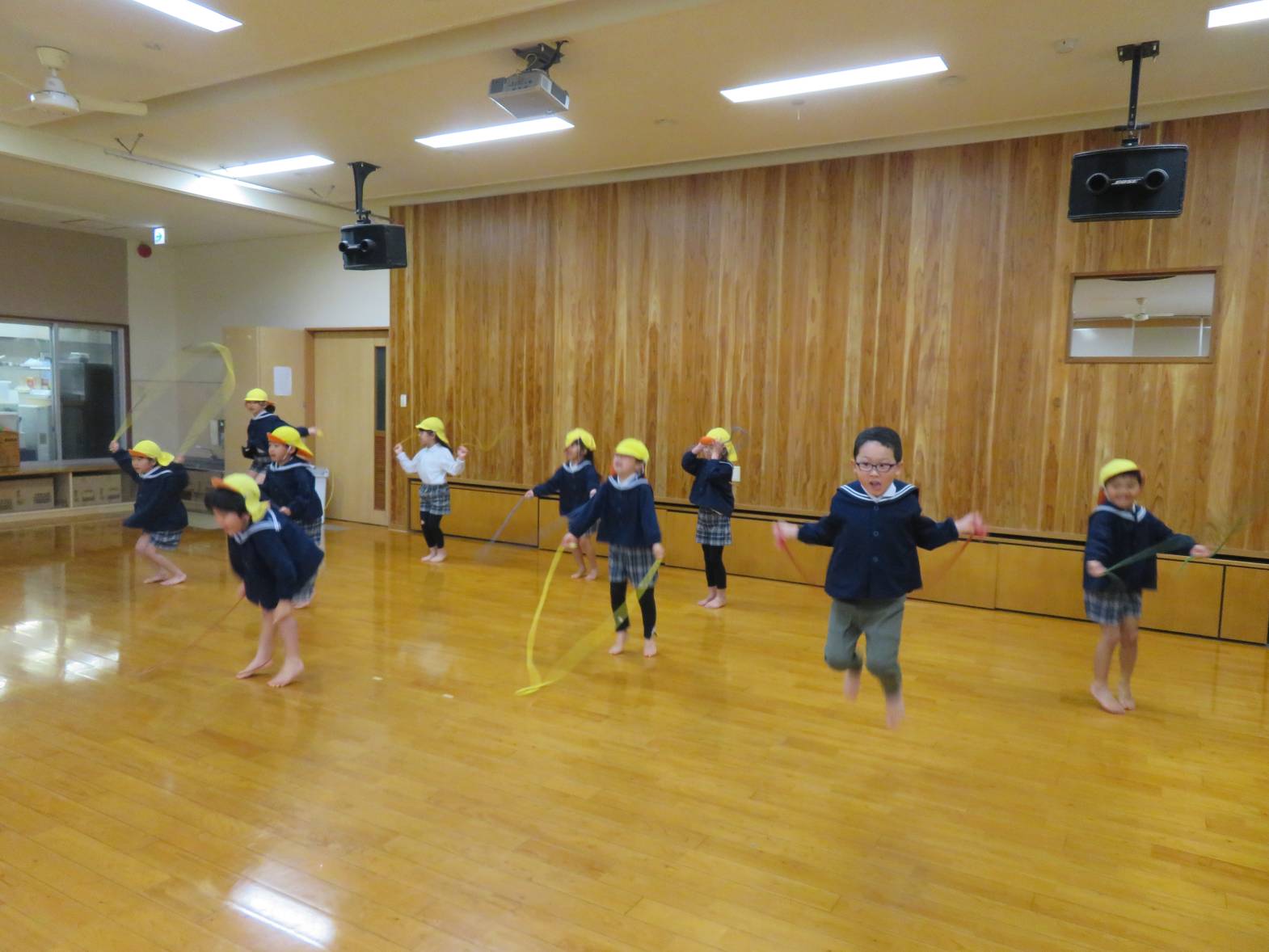 また今日は前とび、後ろとびをやり遂げて新たに「あやとび」を教えてもらい挑戦しました。「あと少し!」と、あと一歩のところまでできるようになる子の姿も見られ、ますます縄跳びへの挑戦に燃える子どもたちです。