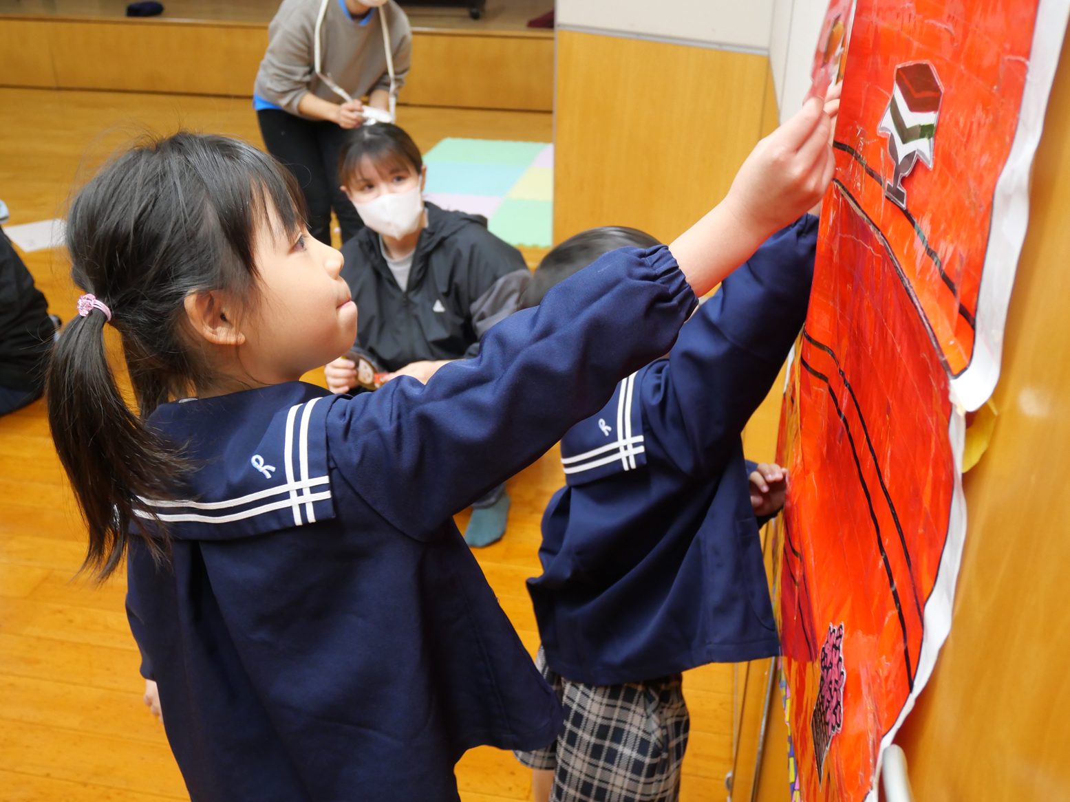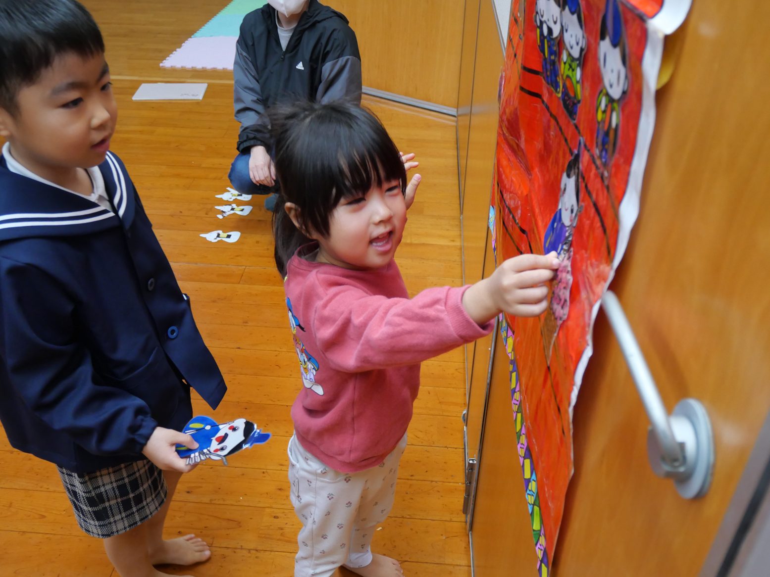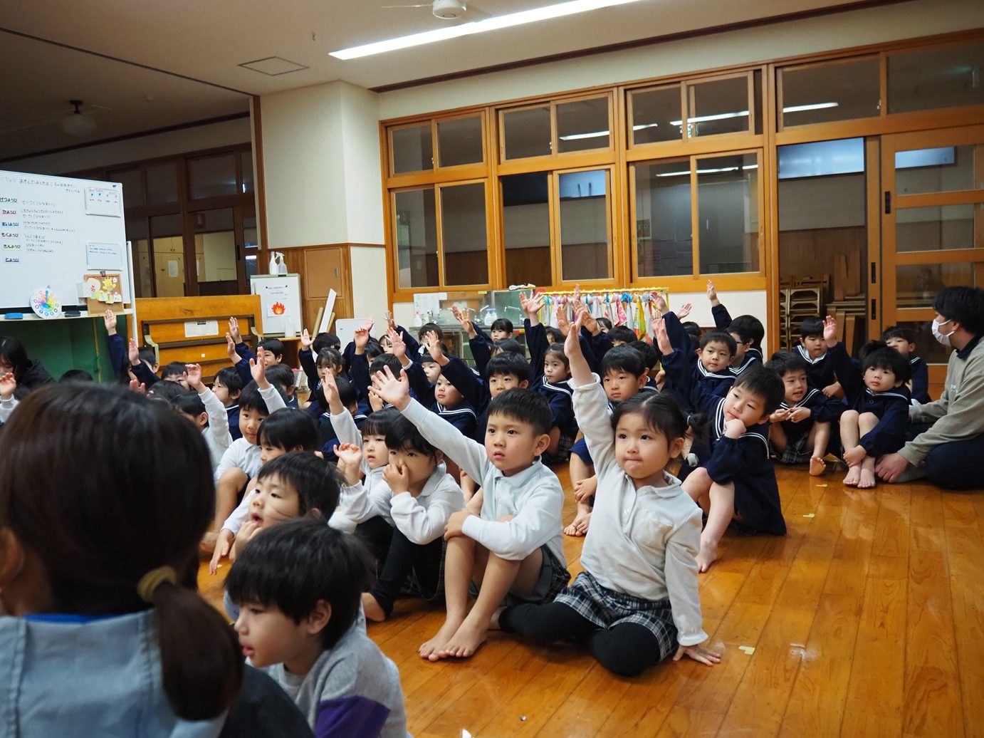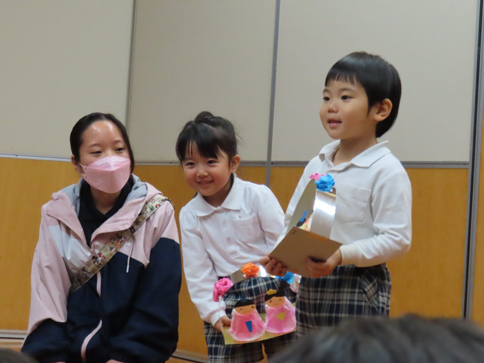 ひな壇のクイズでは、積極的に手を挙げる姿が見られ、「間違えてもいい?」、「こうかな?」と大きい組さんと小さい組さんと力を合わせ、上手に完成させることができました。