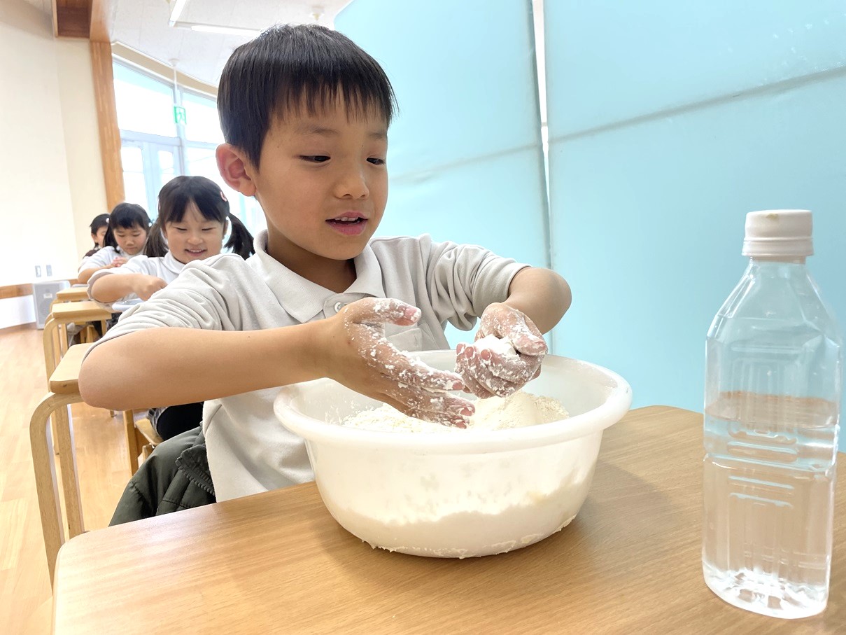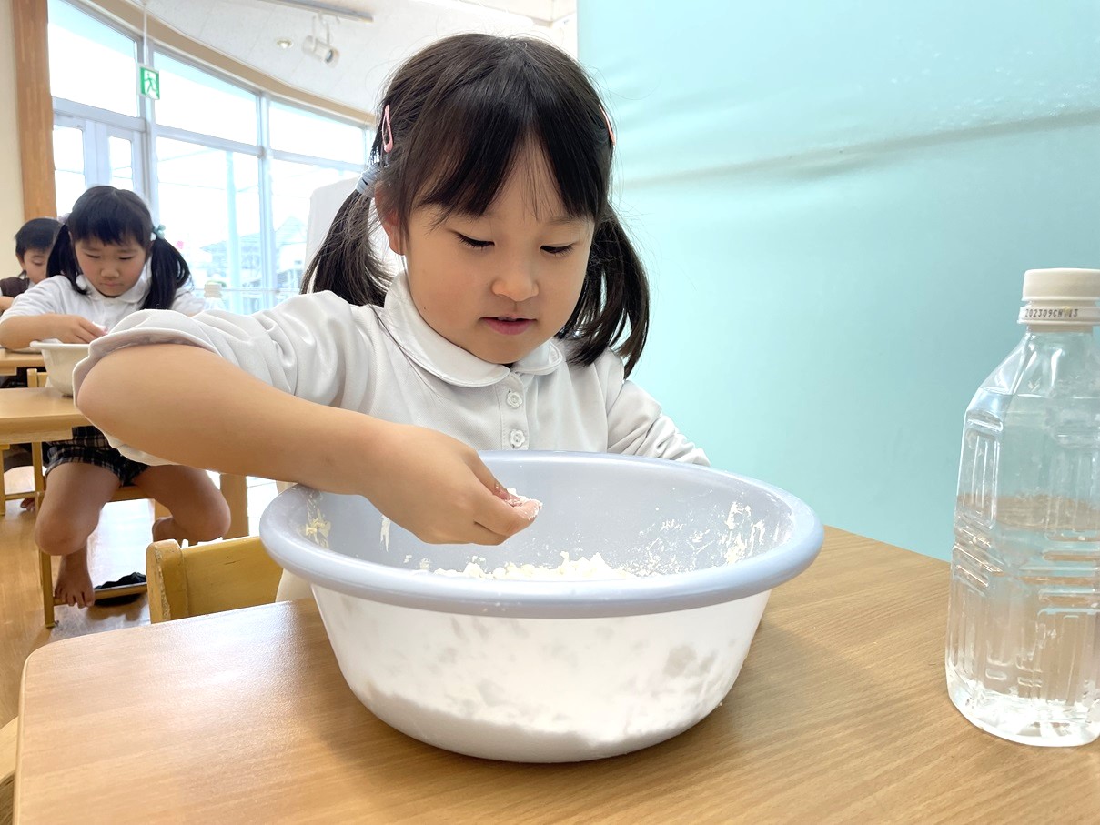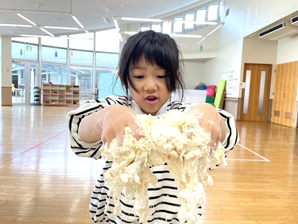 ぞう①グループでは、小麦粉粘土遊びで、自分たちで小麦粉粘土を作ることにも挑戦しました! まずは粉の状態で感触を味わった後、早速水を入れて好きな硬さの小麦粉粘土作りを行っていきます。 水を入れすぎないよう、慎重に水を入れることができました! 水を入れたら腕に力を入れて、一生懸命こねていきます。こねる度粘土になっていくことに、「すごい!固まってきた!」と驚く姿が見られていました。 完成した粘土で思い切り遊び、笑顔いっぱいの子どもたちでした☆