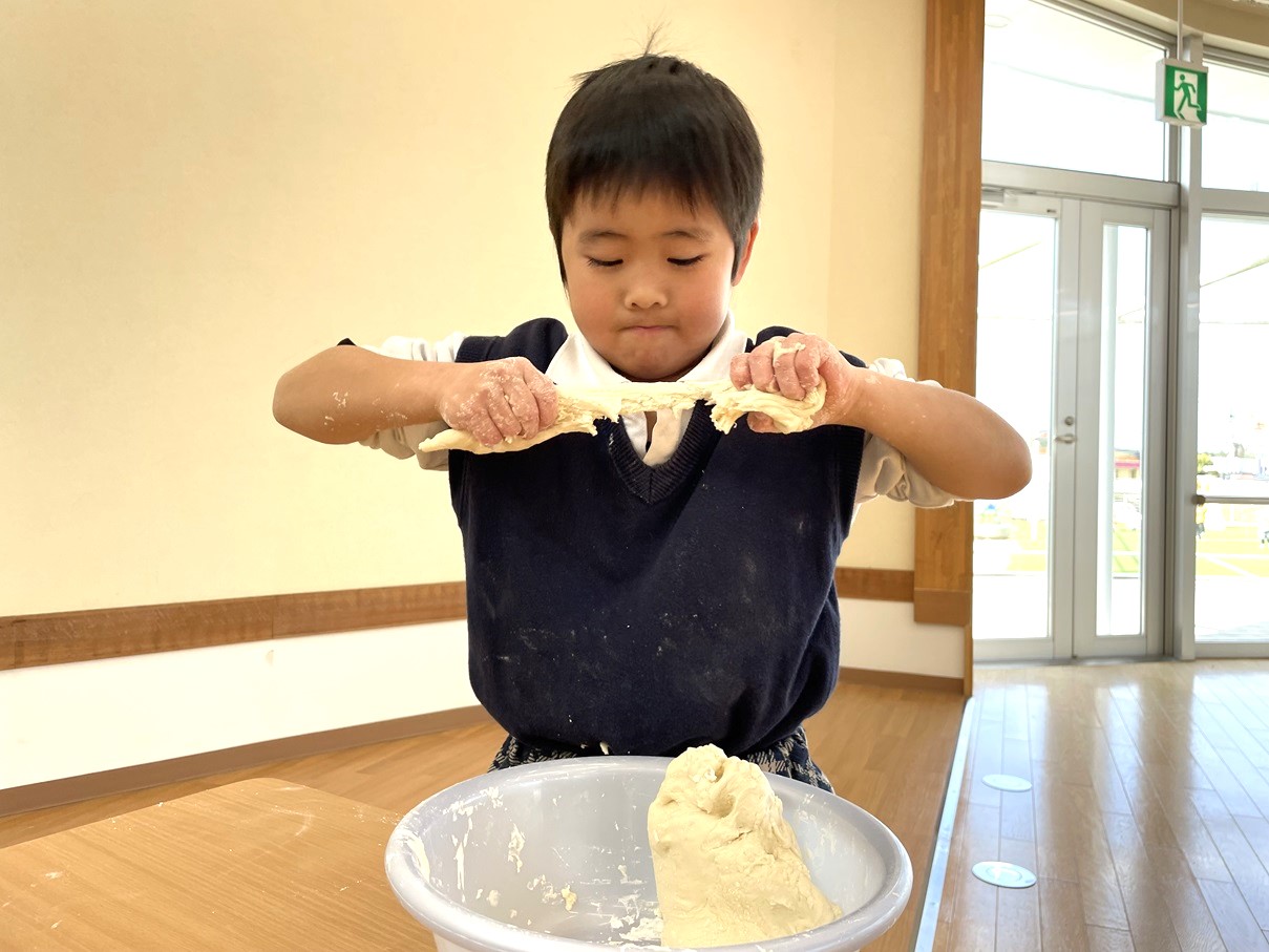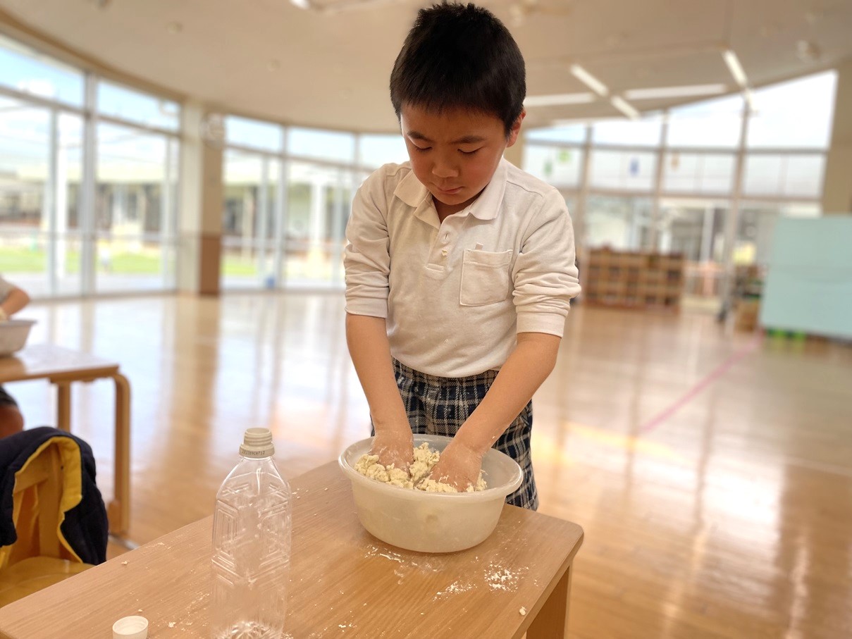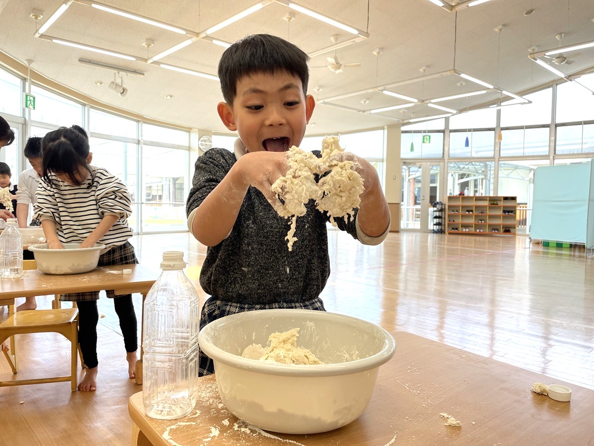 ぞう①グループでは、小麦粉粘土遊びで、自分たちで小麦粉粘土を作ることにも挑戦しました! まずは粉の状態で感触を味わった後、早速水を入れて好きな硬さの小麦粉粘土作りを行っていきます。 水を入れすぎないよう、慎重に水を入れることができました! 水を入れたら腕に力を入れて、一生懸命こねていきます。こねる度粘土になっていくことに、「すごい!固まってきた!」と驚く姿が見られていました。 完成した粘土で思い切り遊び、笑顔いっぱいの子どもたちでした☆
