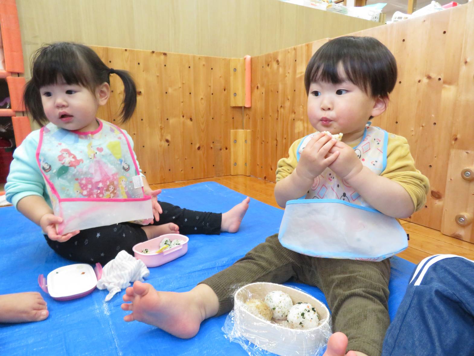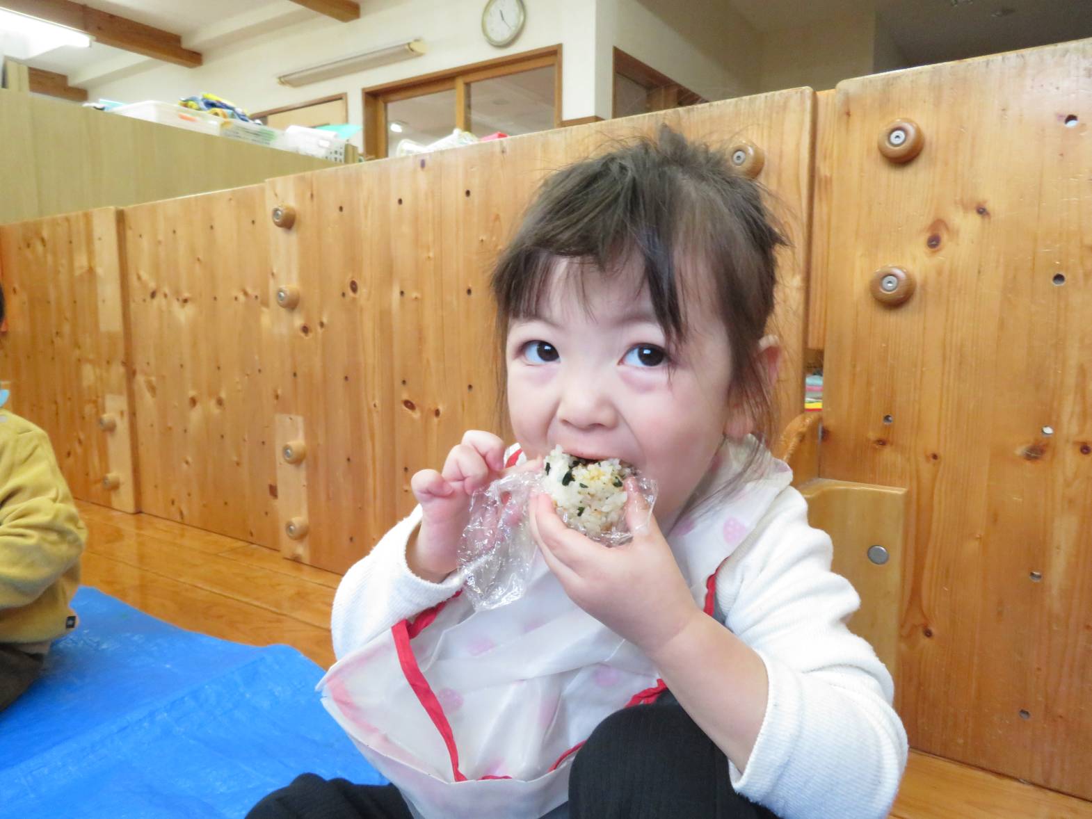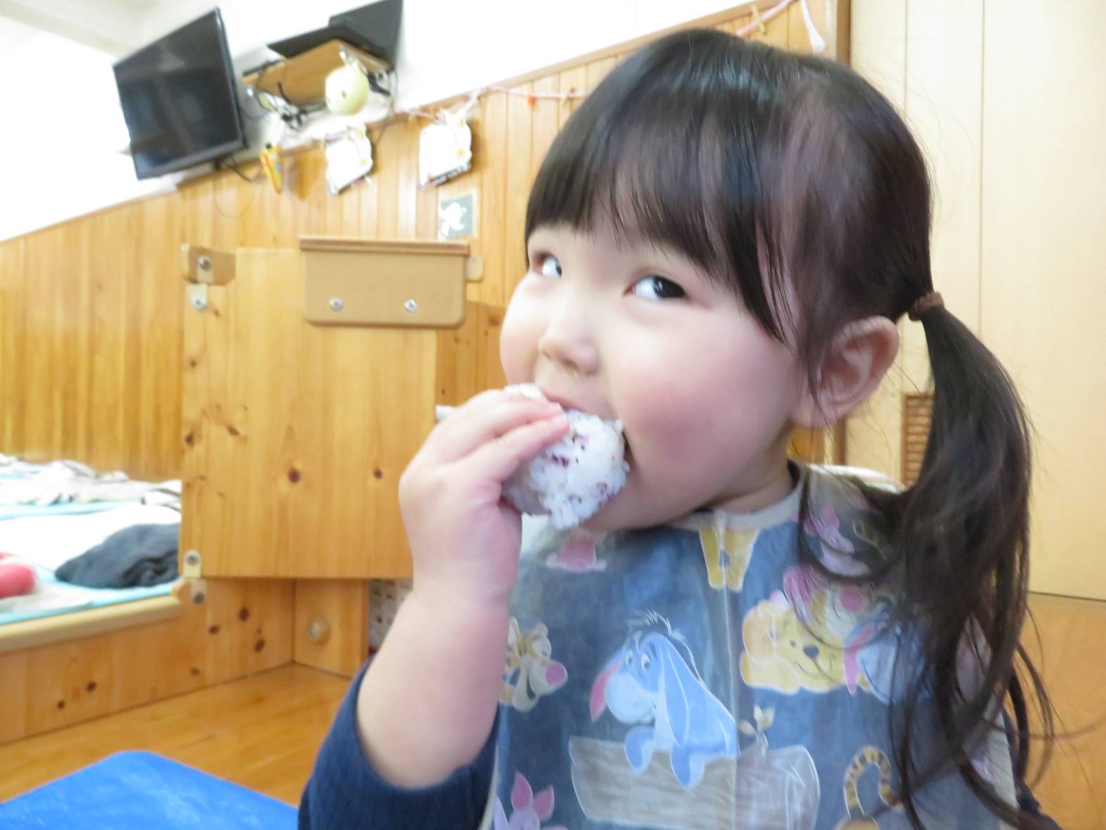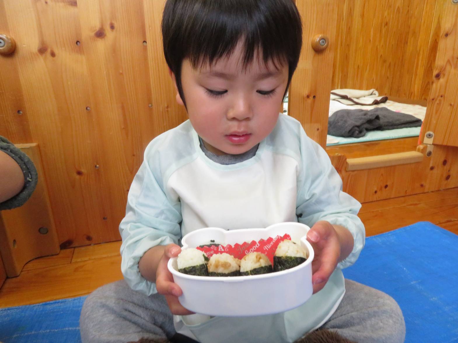 先日、こあら組での最後のおむすびの日でした。 おむすびの時間が大好きなこあら組さん! お弁当箱を開くと、「おいしそ~!」と、目を輝かせる姿が見られました。 「今日はアンパンマン入ってたよ!」、「美味しいね!」、「見てみて~!」と、会話を弾ませながら、おむすびの時間を楽しみました♪ おむすびを食べ終えると、ニコニコ笑顔でとても満足そうな子どもたちでした。 一年間、おむすびのご準備ありがとうございました。