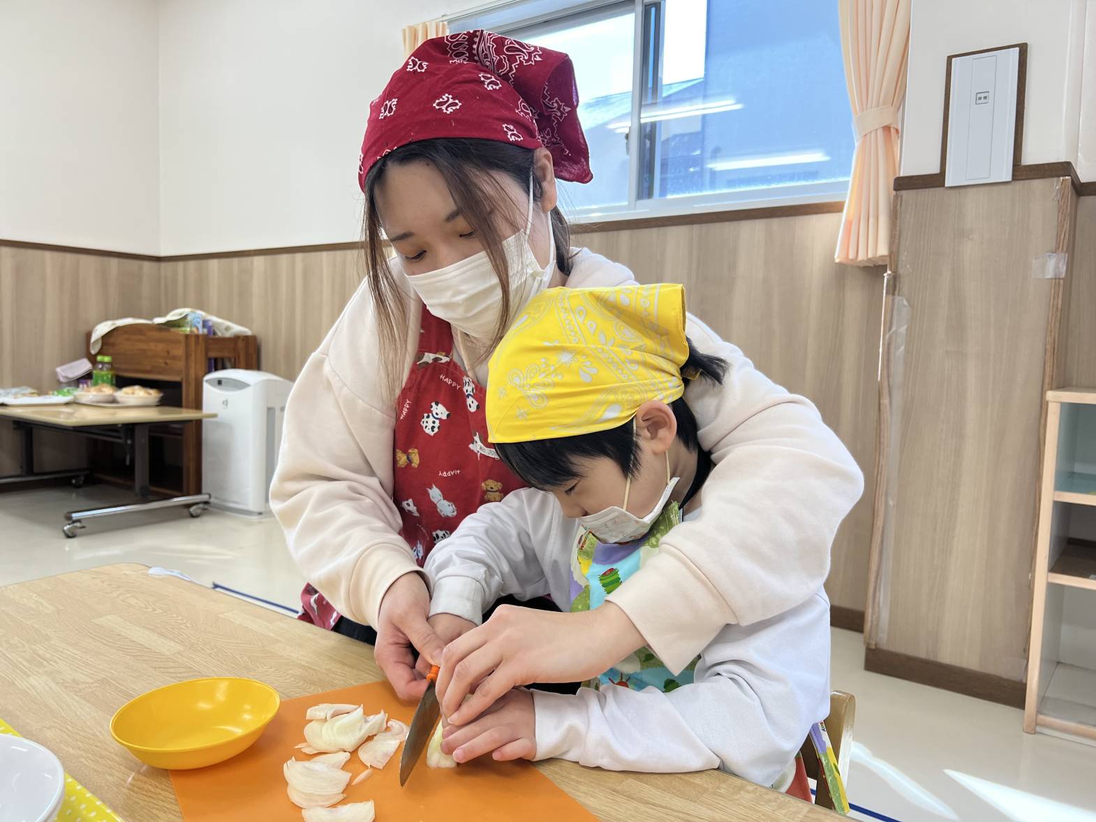 包丁の持ち方を確認して、保護者の方に手添えを行ってもらいながら食材をきることにも挑戦しましたよ☆
