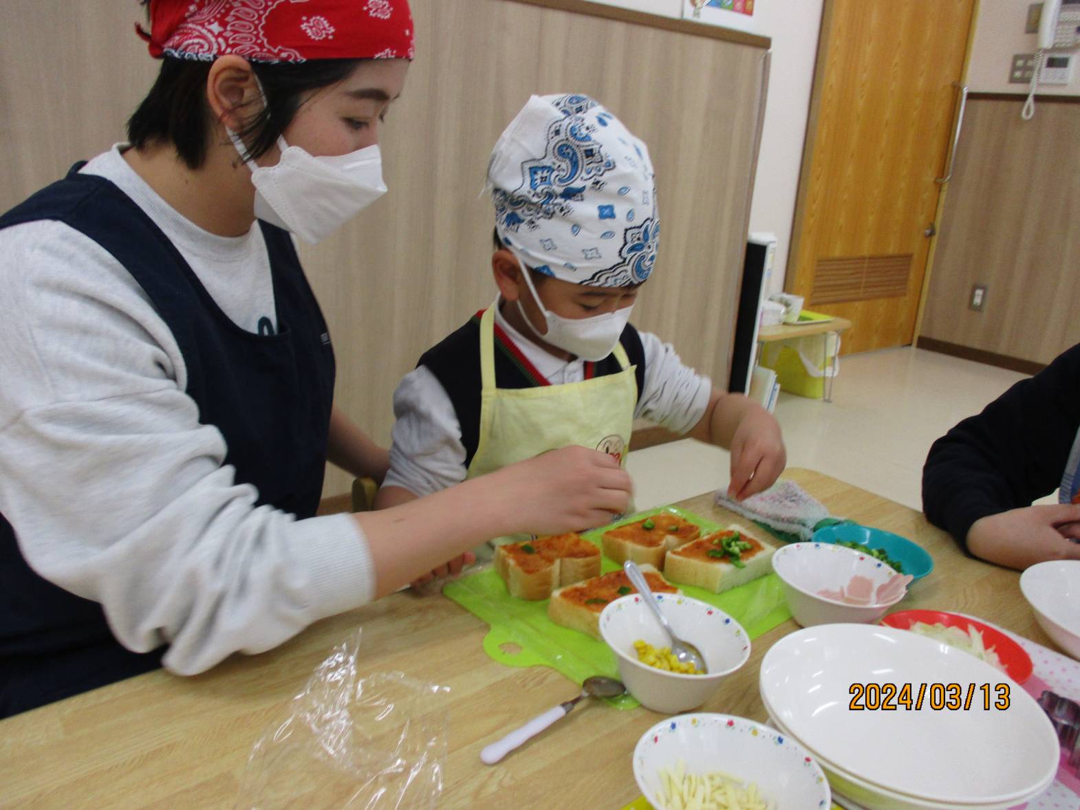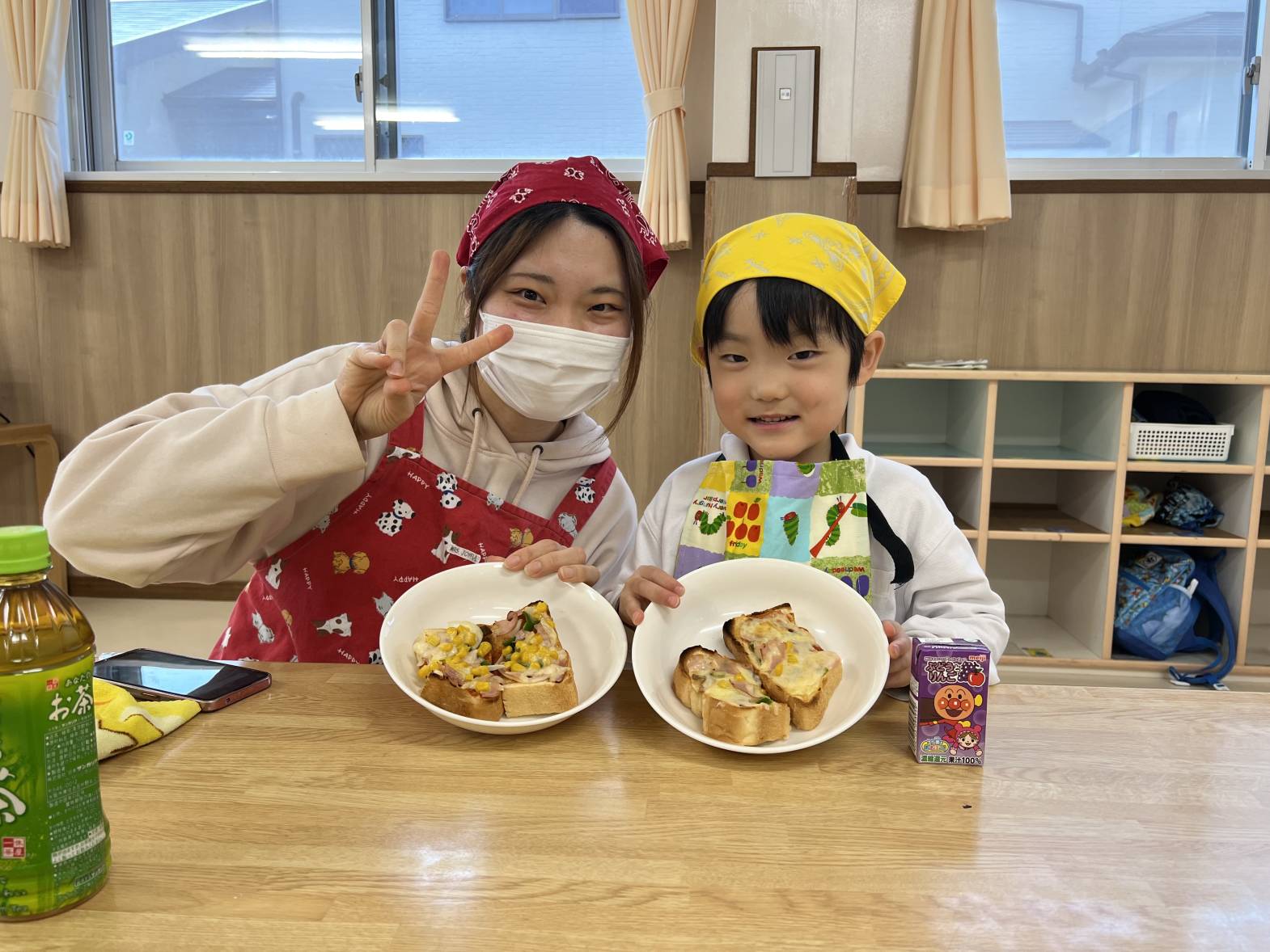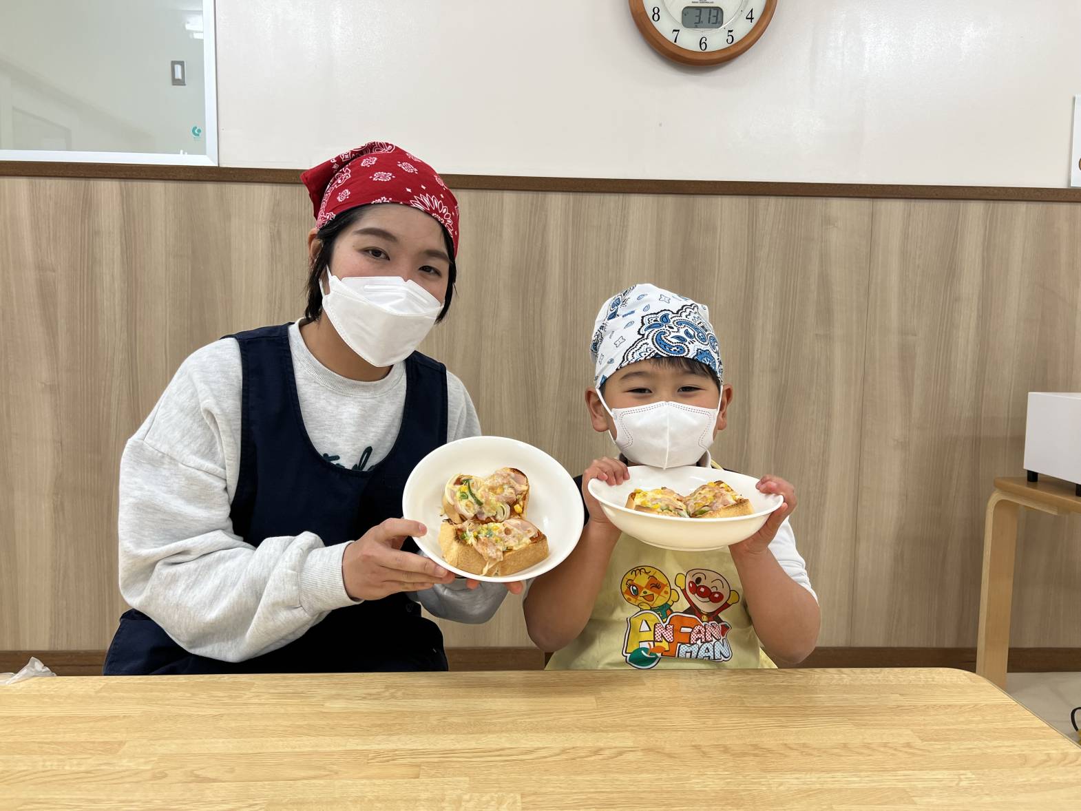 今回のとら①グループのファミリーサロンでは、クッキング活動でピザトーストを作りました!