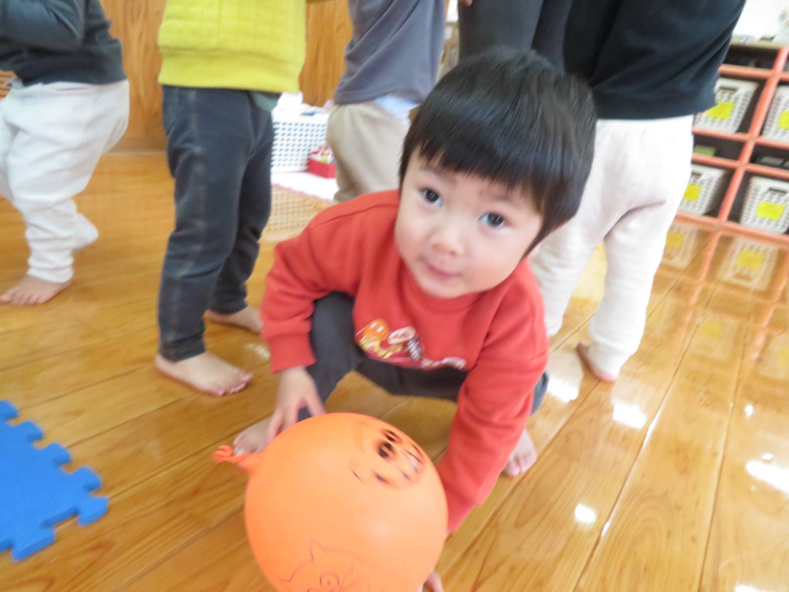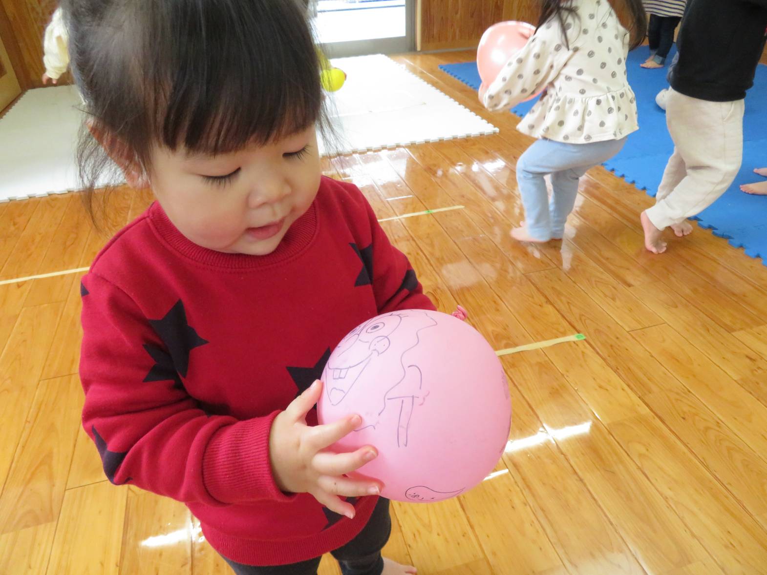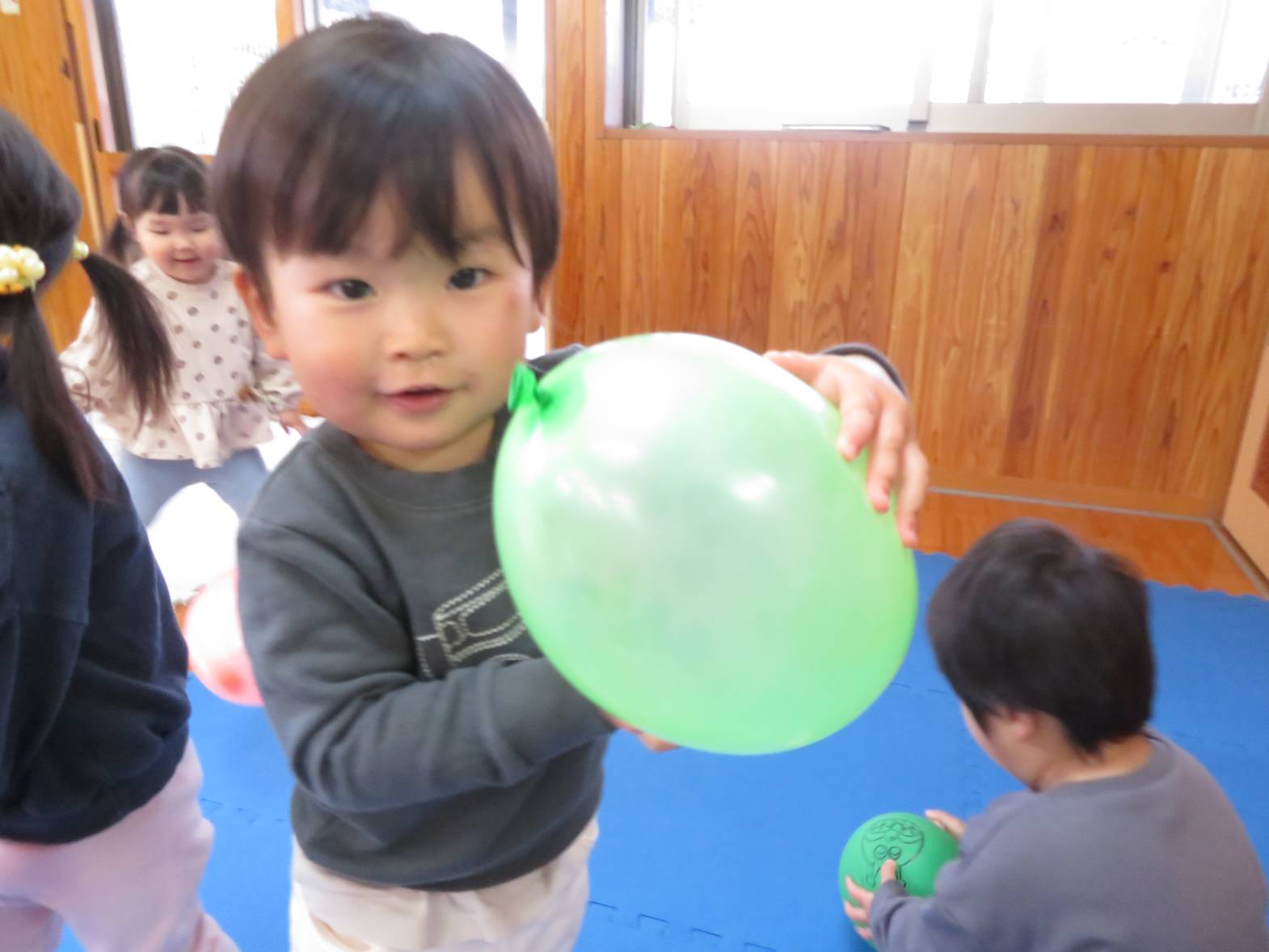 風船遊びを行いました。 風船を手に取ると、「ポーン!」と高く投げてみたり、友だちと見せ合ったりして楽しむ子どもたち! また、風船を投げ、キャッチすることができると、「見てみて~!」と喜ぶ姿が見られました。 友だちと一緒に遊ぶ姿も増え、「一緒に遊ぼう!」と誘ったり、「こうやって遊ぶんだよ!」と優しくかかわったりすることができるこあら組さん! こあら組も残りわずかですが、たくさんの思い出を作っていきたいと思います♪