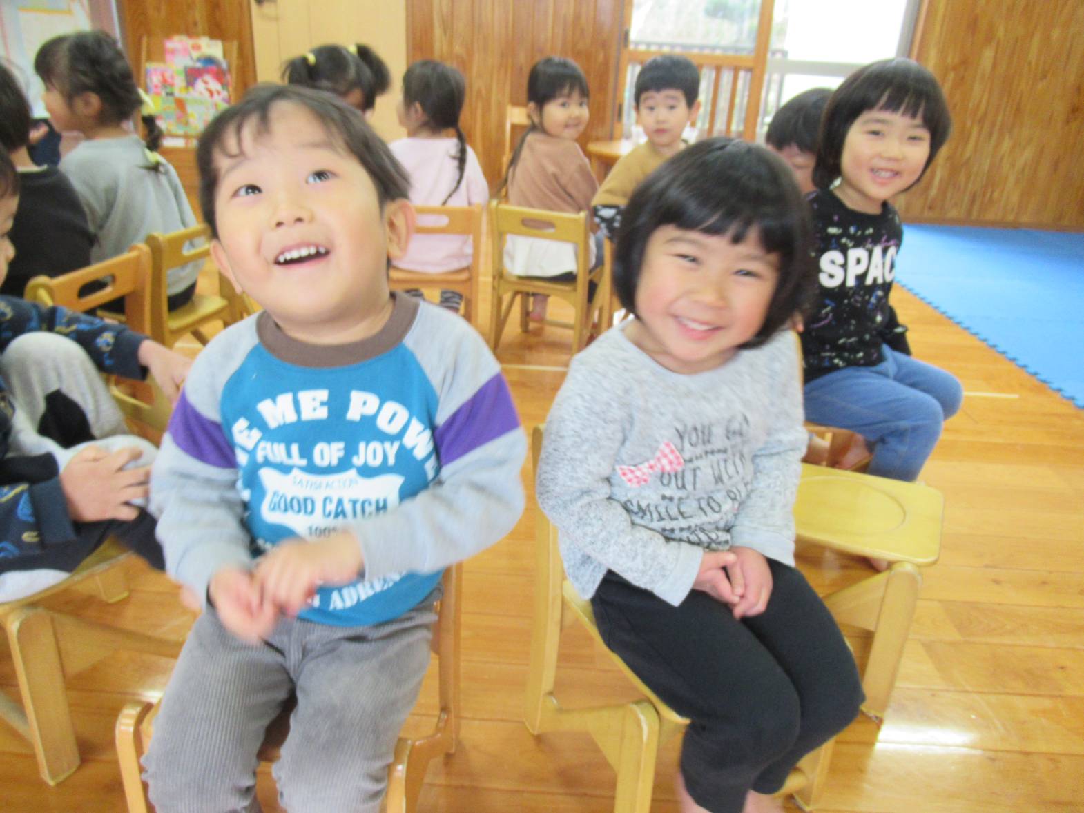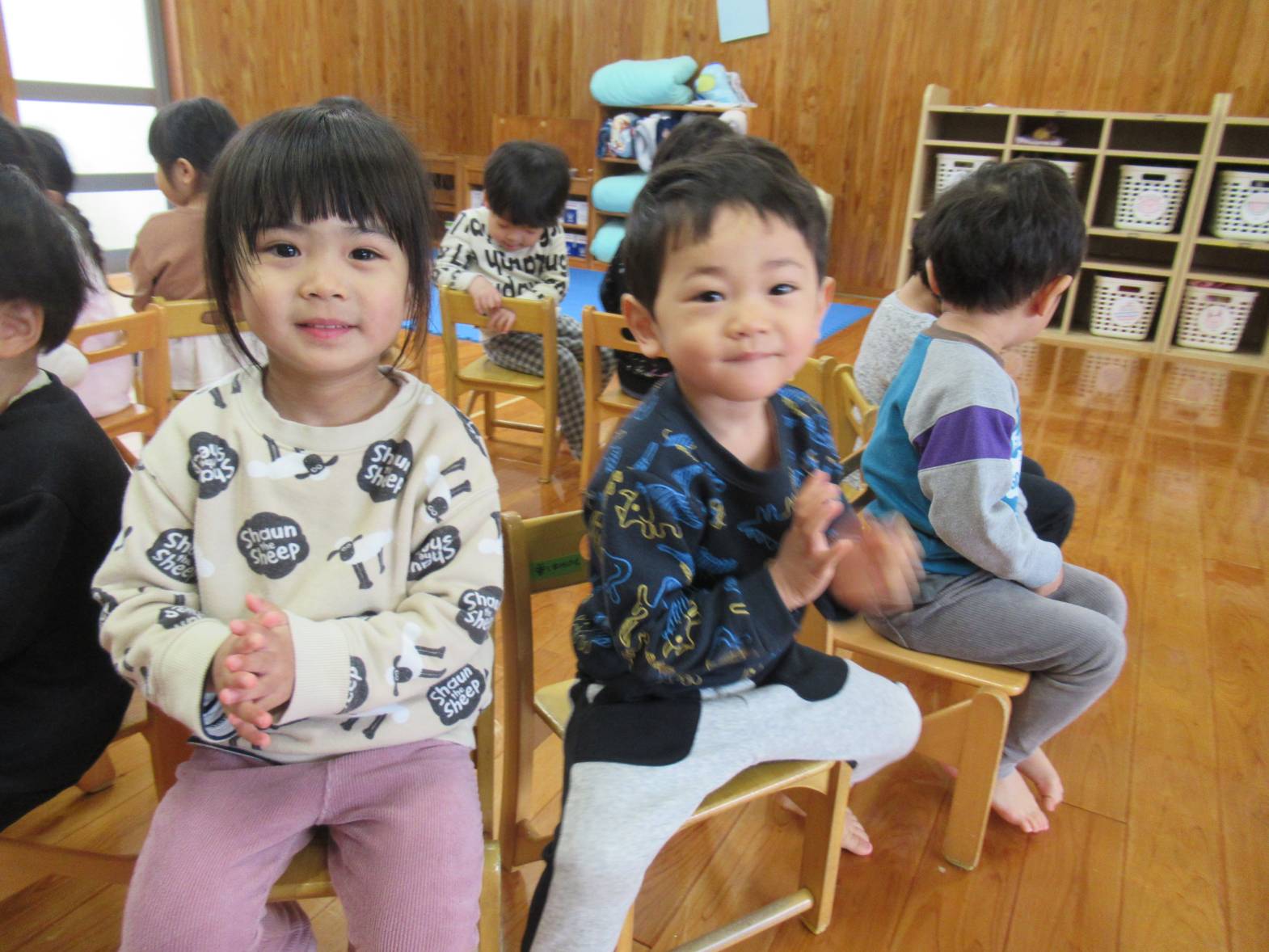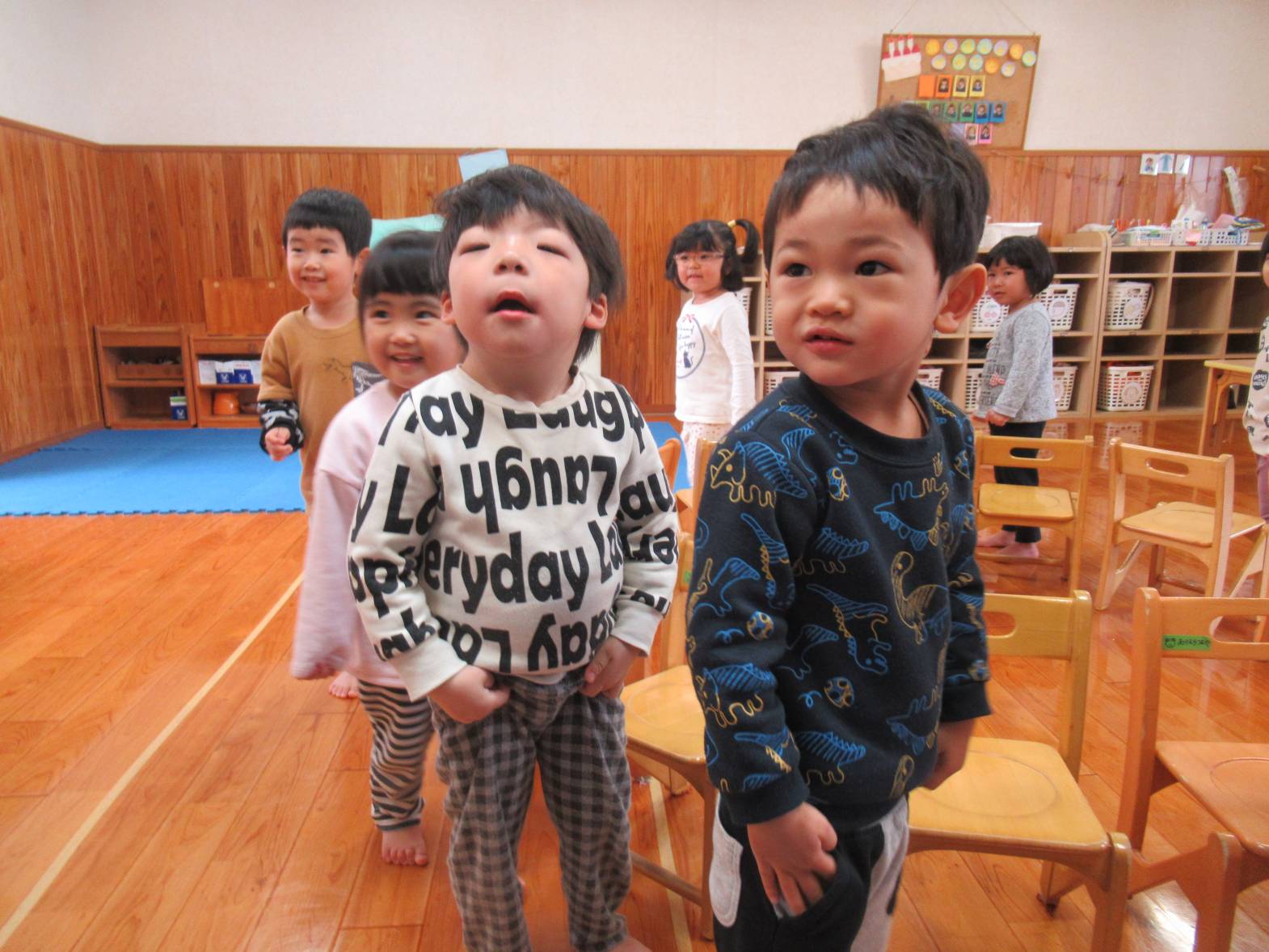 椅子取りゲームをして遊びました! 音楽が鳴ると椅子の周りを歩き始めます。 “音楽がいつ止まるかな?”と耳を澄ませる子どもたち。 音楽が止まり、椅子に座ることができると「やった!」と喜ぶ姿が見られます。 勝敗に涙を流す姿も見られるので、気持ちを受け止めたり、椅子取りゲームの面白さを伝えたりしながら様子を見守っていきたいと思います。