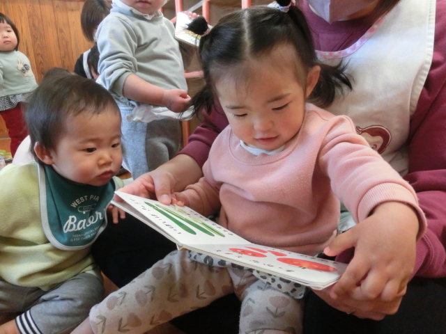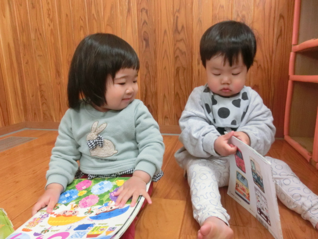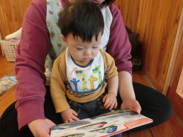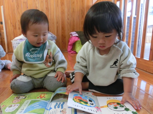 特に、動物、食べ物、乗り物の絵本が好きで、「わんわん、いた。」、「ぶっぶー!」と、指差しして教えてくれる子どもたちです♪