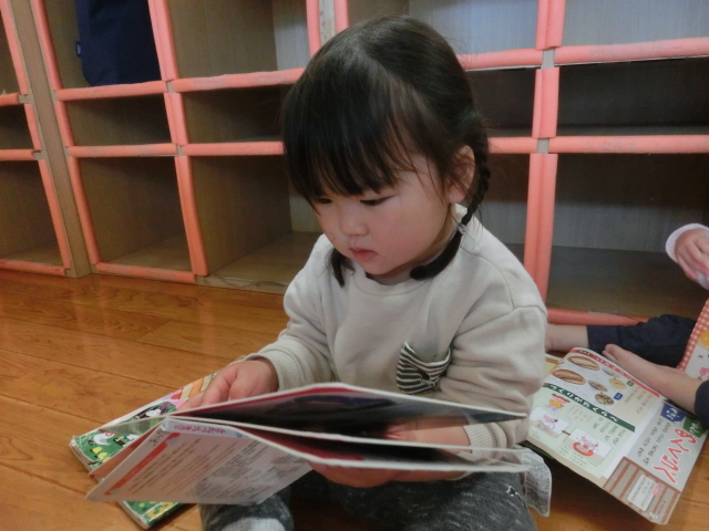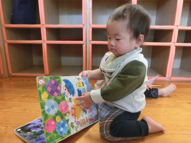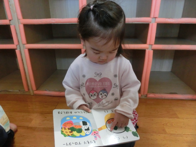 絵本の時間になると、ページをめくり真剣な表情で見ていく姿があります。