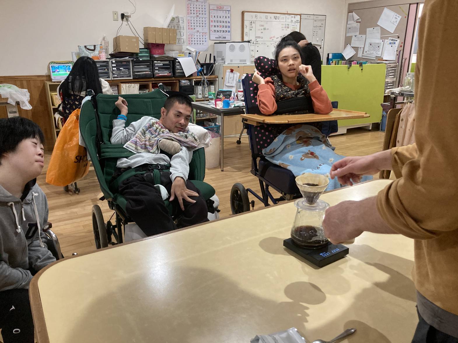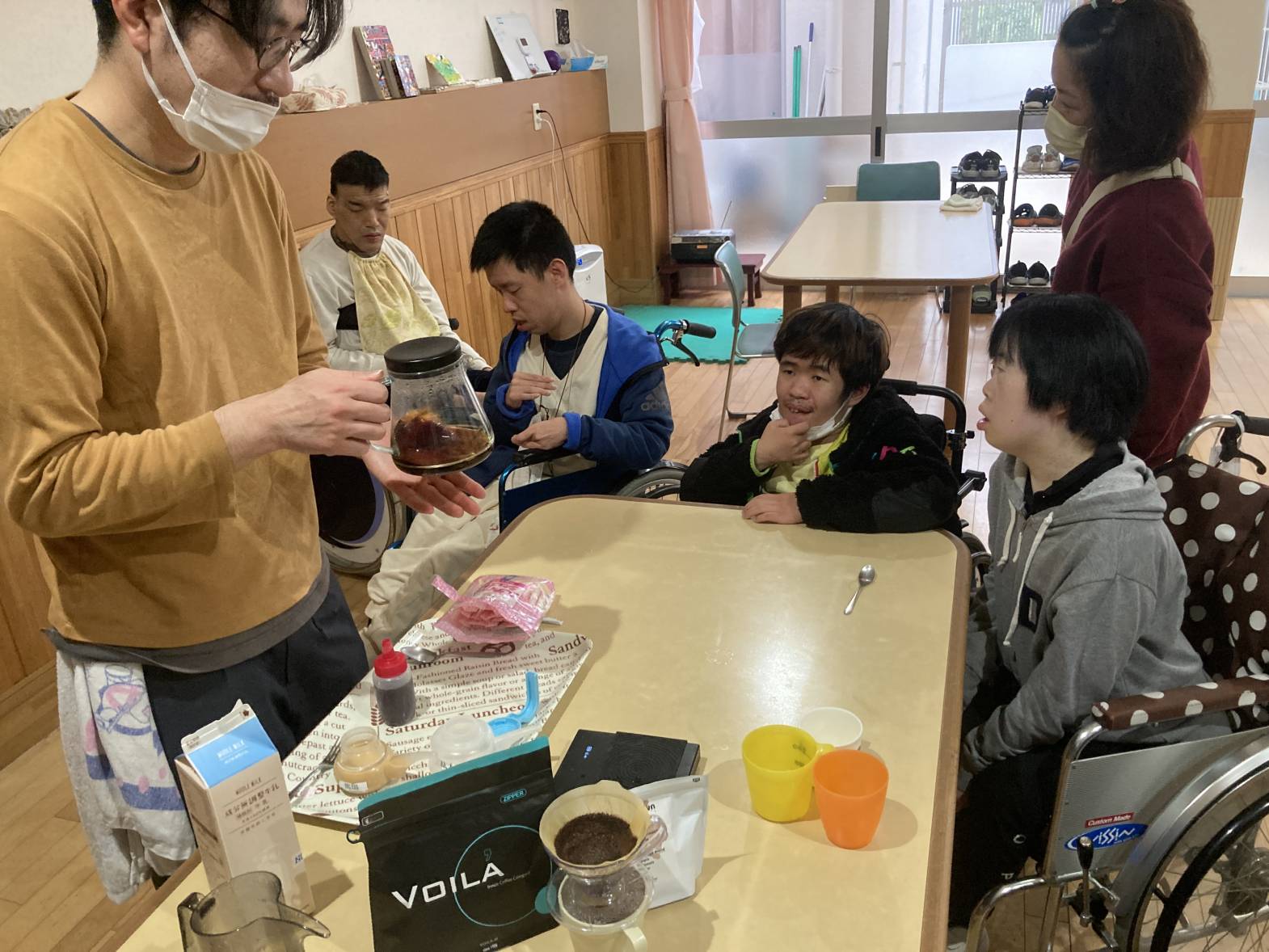 今日は「Sho´s cafe」ということで、カフェ活動を行いました。 今回のコーヒーは前回の活動とは違う豆を使った様です。 どんな味なのか楽しみですね♪ コーヒーを抽出していると、部屋いっぱいにコーヒーのいい香りが・・・ カフェオレにしたり、砂糖だけにしたりとひとりひとりカフェ活動を楽しむことができました。 土曜日限定のちょっぴり贅沢な活動、次回開催も楽しみにしておいてくださいね!