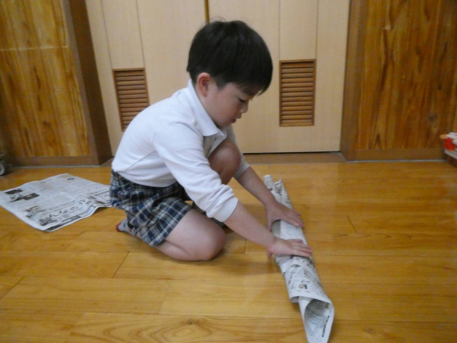 新聞紙で作ったものが完成すると、「先生、見て上手に鞄作れたよ!」等、嬉しそうに教えてくれる子どもたち。