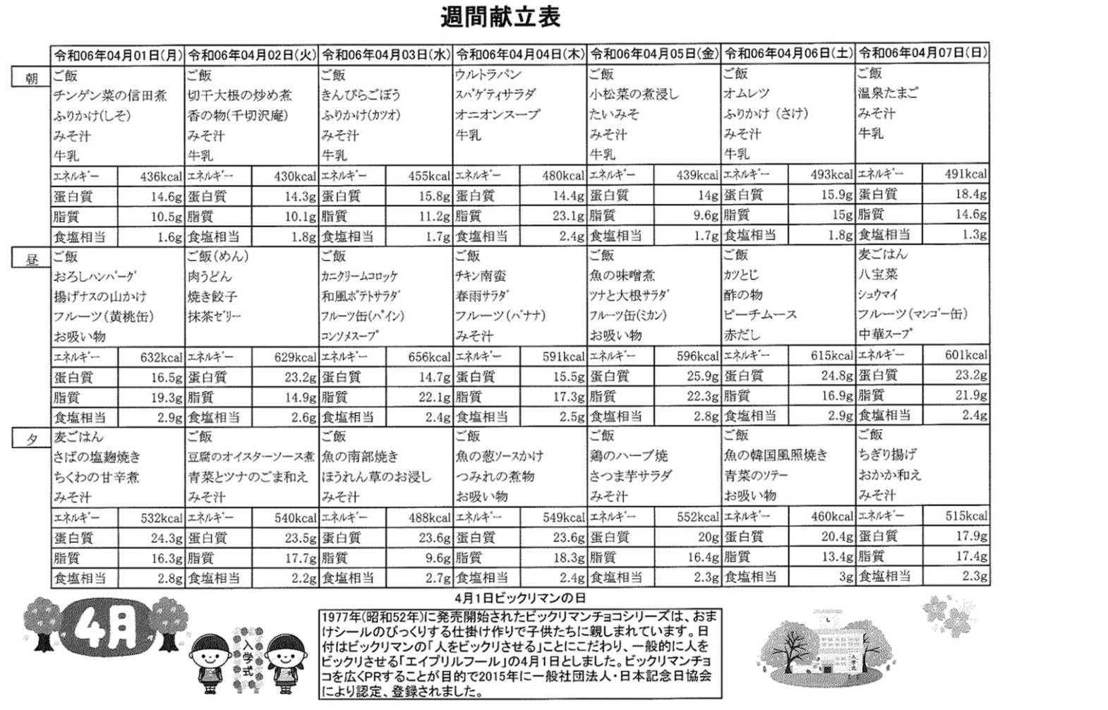 4月1日(月)~4月7日(日)の献立一覧になります。ぜひご覧ください。