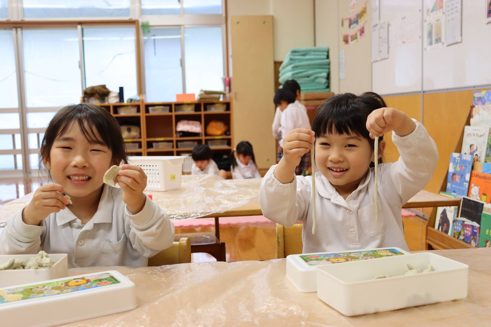 室内遊びでは、会話を楽しみながら遊んだり、友だちと協力して作る楽しさを味わう姿が見られています。