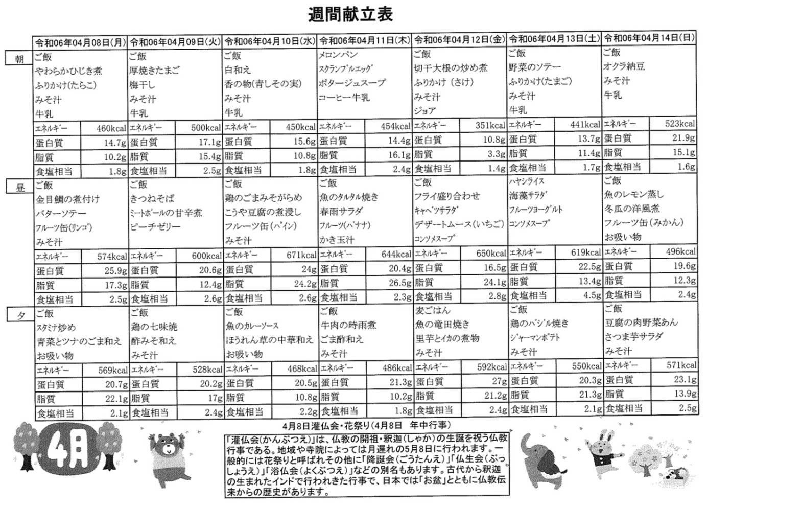 4月8日(月)~4月14日(日)の献立表になります。ぜひご覧ください。