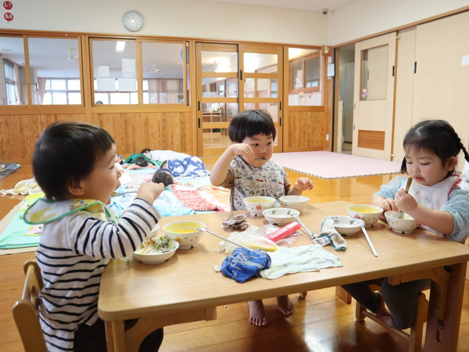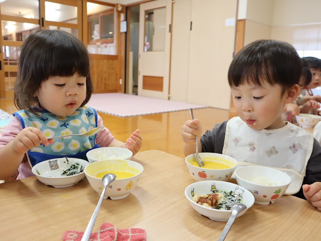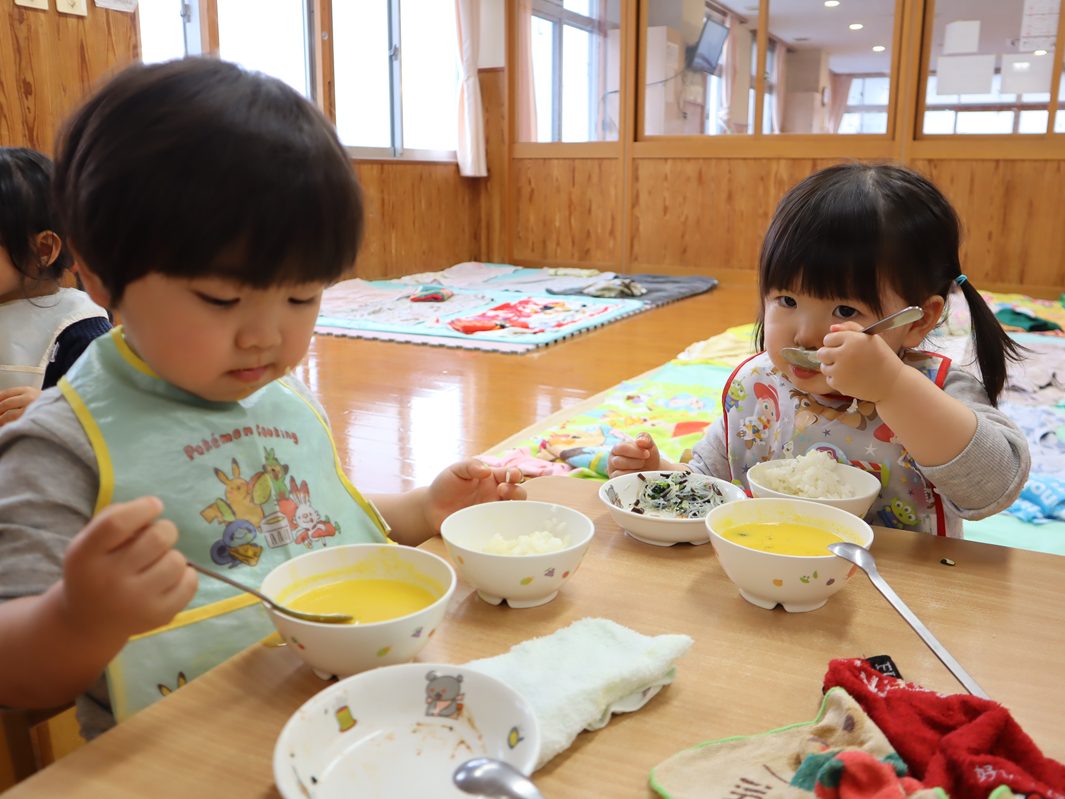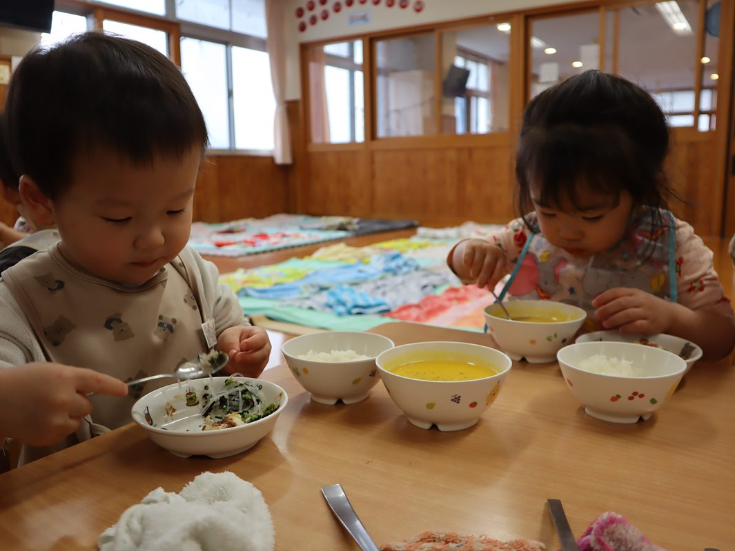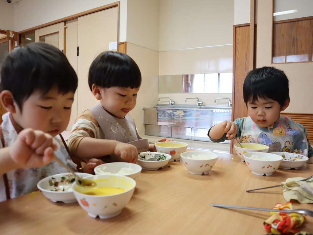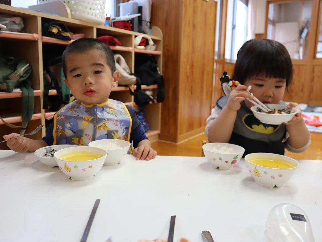 4月になり、ぱんだ組さんになった子どもたち! 新しい先生や新しいおもちゃに目を輝かせ、元気いっぱいに遊ぶ姿が見られました。 たくさん遊んでお腹はペコペコ。 給食では、「○○ちゃん、おいしいね。」「これなぁに?」と積極的に会話を楽しむぱんだ組さん。 最後はきちんと「ごちそうさまでした!」を言い、あっという間に完食! 今年度は新しいお友だちが1名加わり、20名のぱんだ組さんです。 今年も楽しく元気いっぱいに過ごすことができるようにしていきますので、よろしくお願い致します。