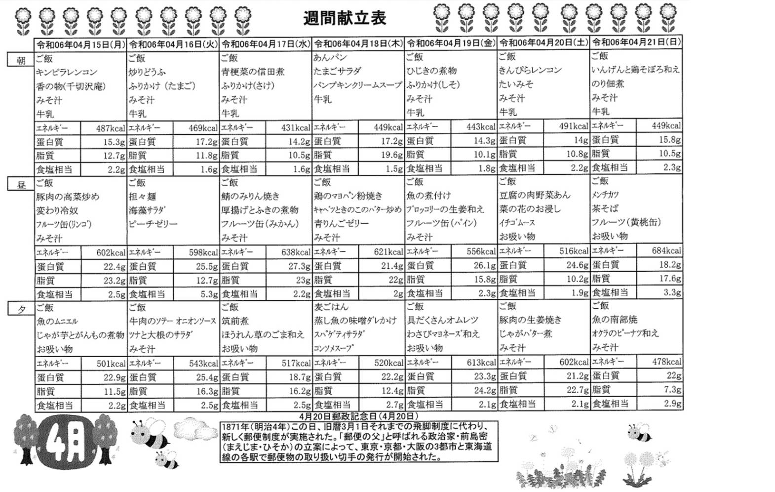 4月15日(月)~4月21日(日)の献立表になります。ぜひご覧ください。