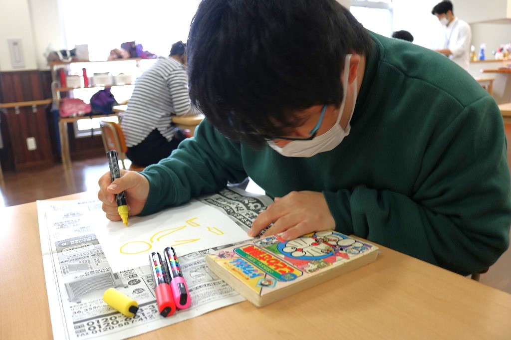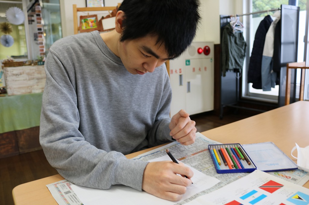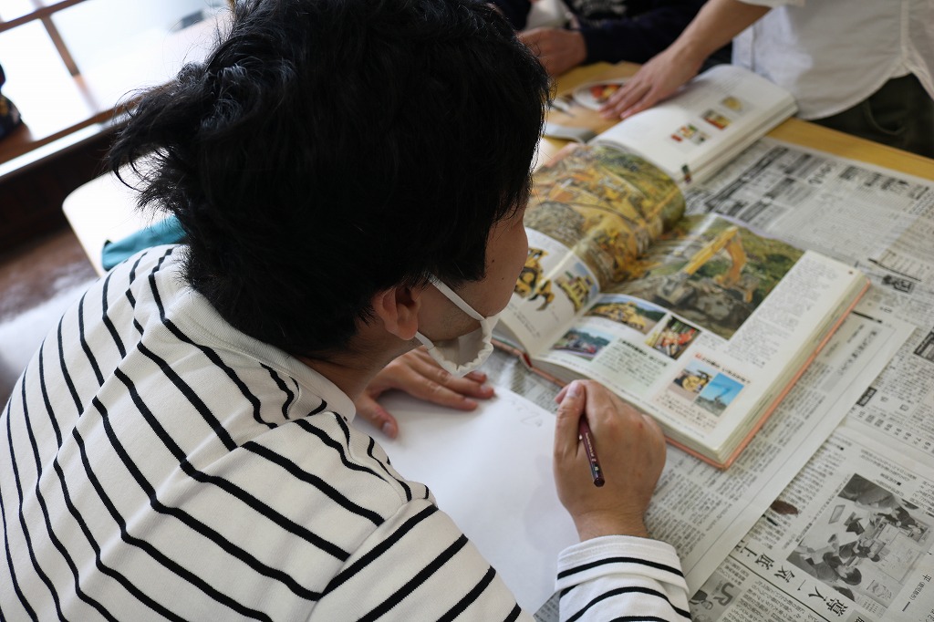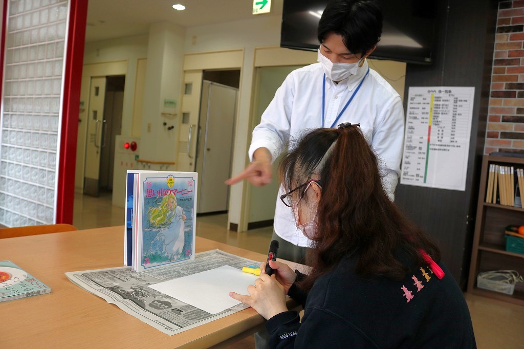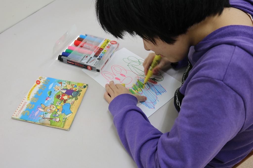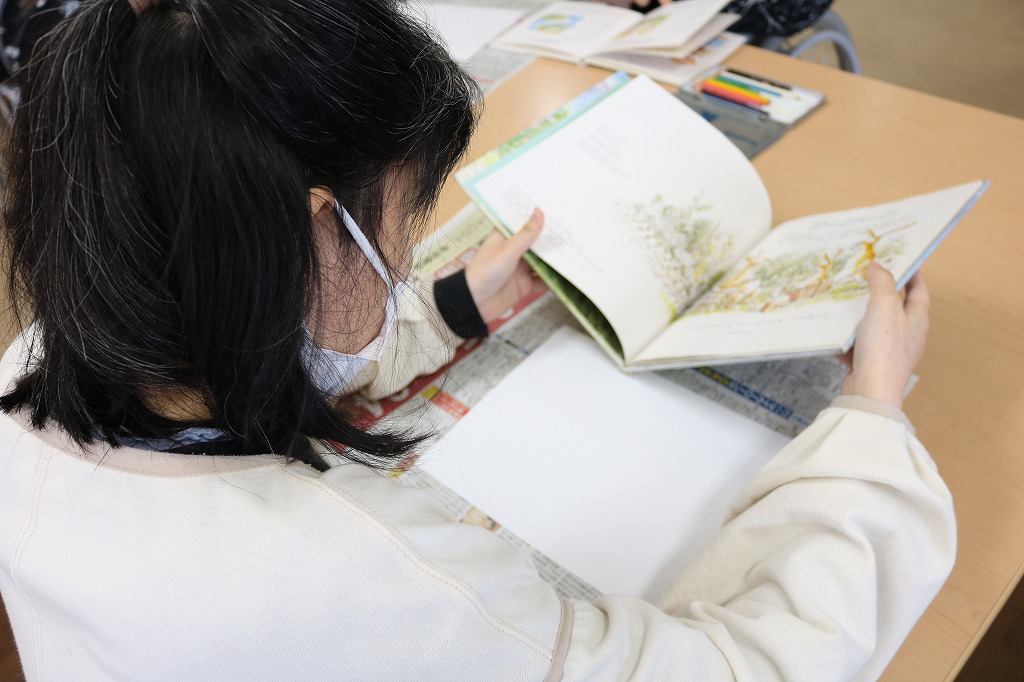 本日の「レッツアート」では、皆さんに好きな本や図鑑など選んでもらい、 その本のなかで気になった、好きなページを白い紙に自由に描いてもらいました。 いつも読んでいる本を絵に描いてみると、とても個性溢れる作品となりました。 これまでアート活動をされていなかった方の魅力が発見できただけでなく、 既に作品制作されている方も新たな可能性を感じられた時間となりました。