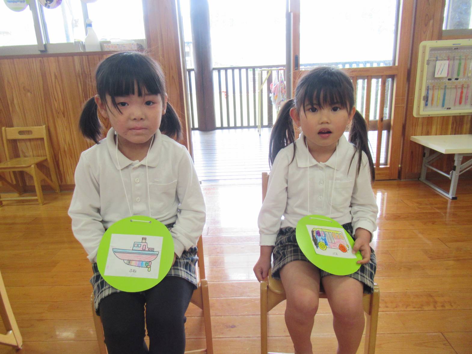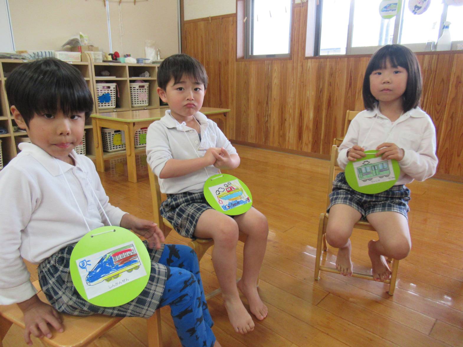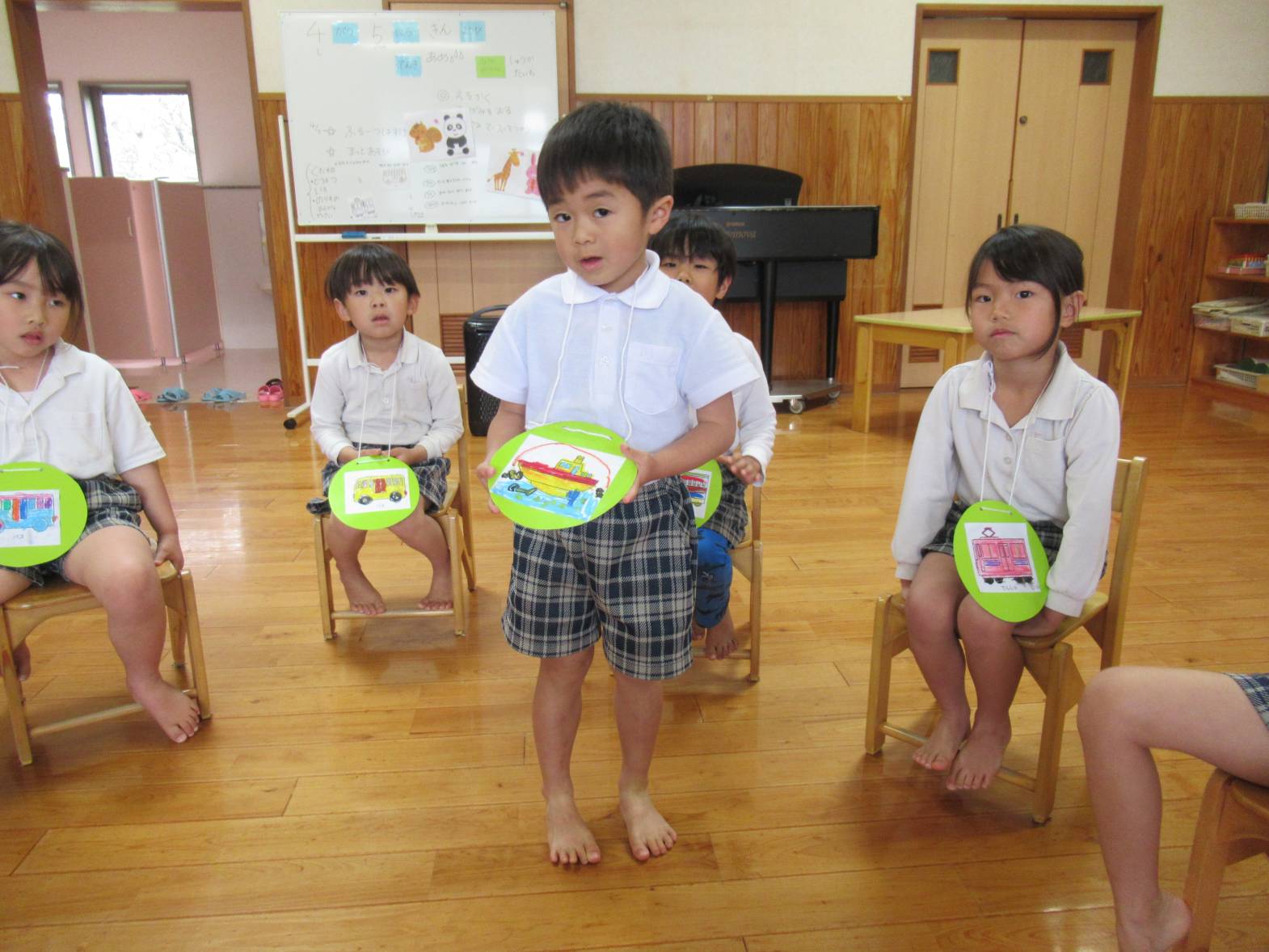 今週は雨の日が続いたため、子どもたちでどんな活動をしたいかを話し合い、フルーツバスケットをすることにしました。 「乗り物のフルーツバスケットがしたい!」という声があったので、まずは乗り物のイラストを選び、色塗りをしました。 カラフルな乗り物が完成したら、フルーツバスケットスタート! 友だちの声をよく聞き、自分の乗り物が言われたら、機敏に動く子どもたち。 「○○ちゃん、こっち!」、「ここ空いてるよ!」と声を掛け合いながら、フルーツバスケットを楽しんだきりん組さんでした。