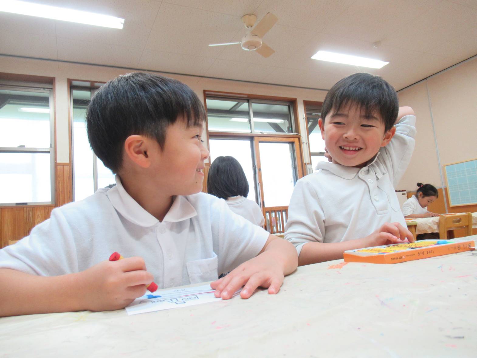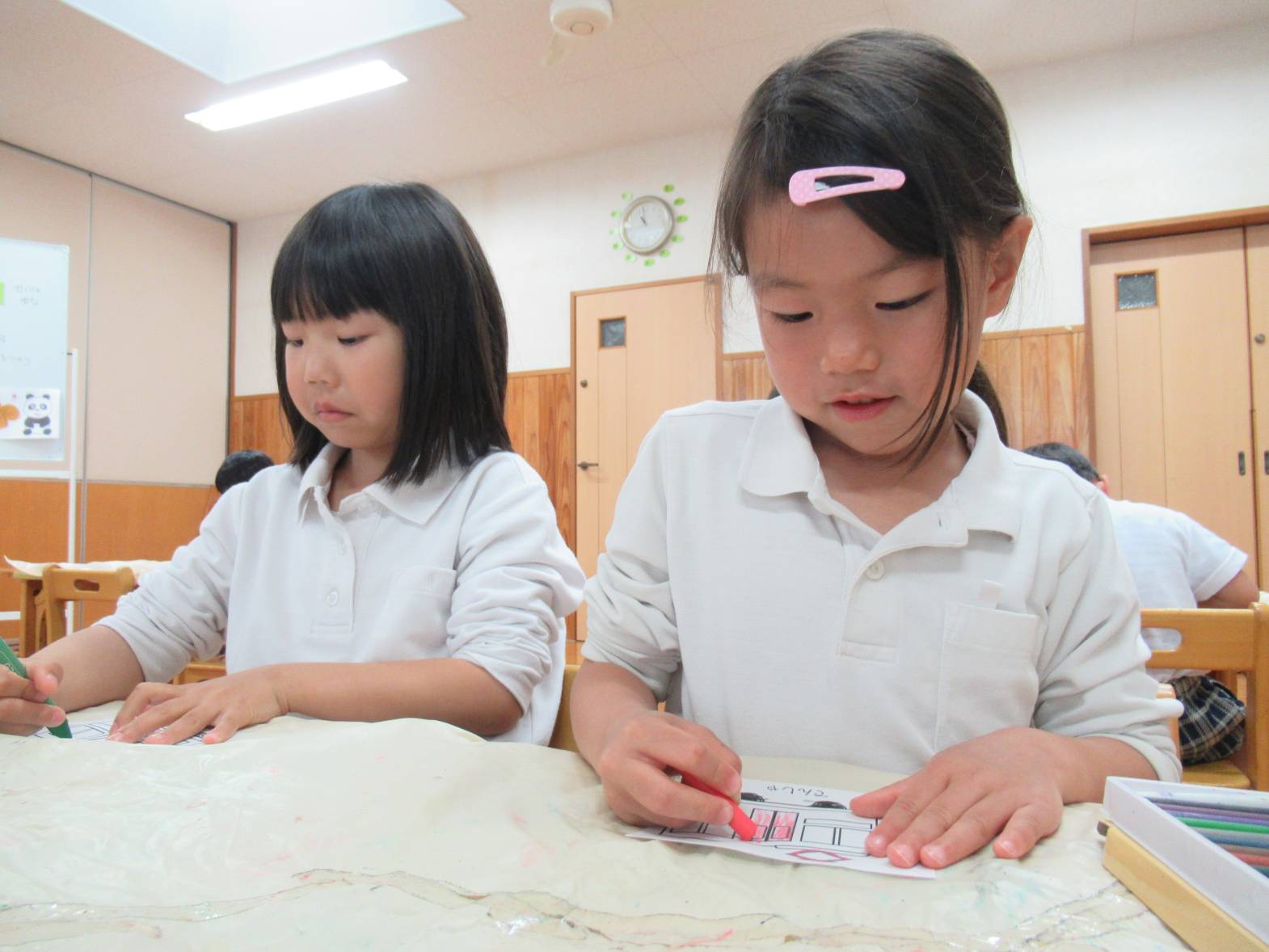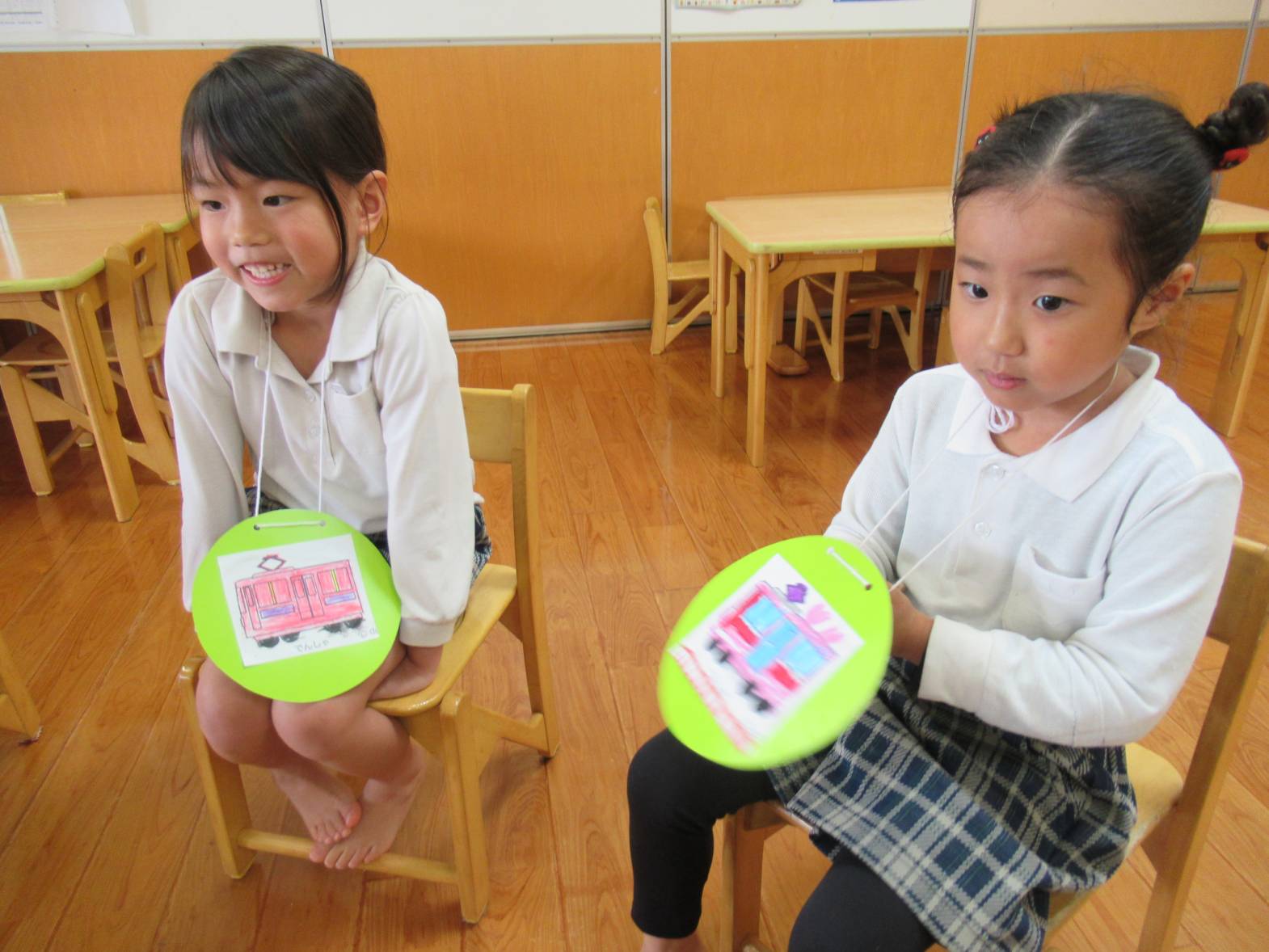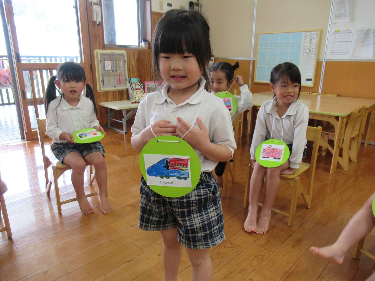 今週は雨の日が続いたため、子どもたちでどんな活動をしたいかを話し合い、フルーツバスケットをすることにしました。 「乗り物のフルーツバスケットがしたい!」という声があったので、まずは乗り物のイラストを選び、色塗りをしました。 カラフルな乗り物が完成したら、フルーツバスケットスタート! 友だちの声をよく聞き、自分の乗り物が言われたら、機敏に動く子どもたち。 「○○ちゃん、こっち!」、「ここ空いてるよ!」と声を掛け合いながら、フルーツバスケットを楽しんだきりん組さんでした。