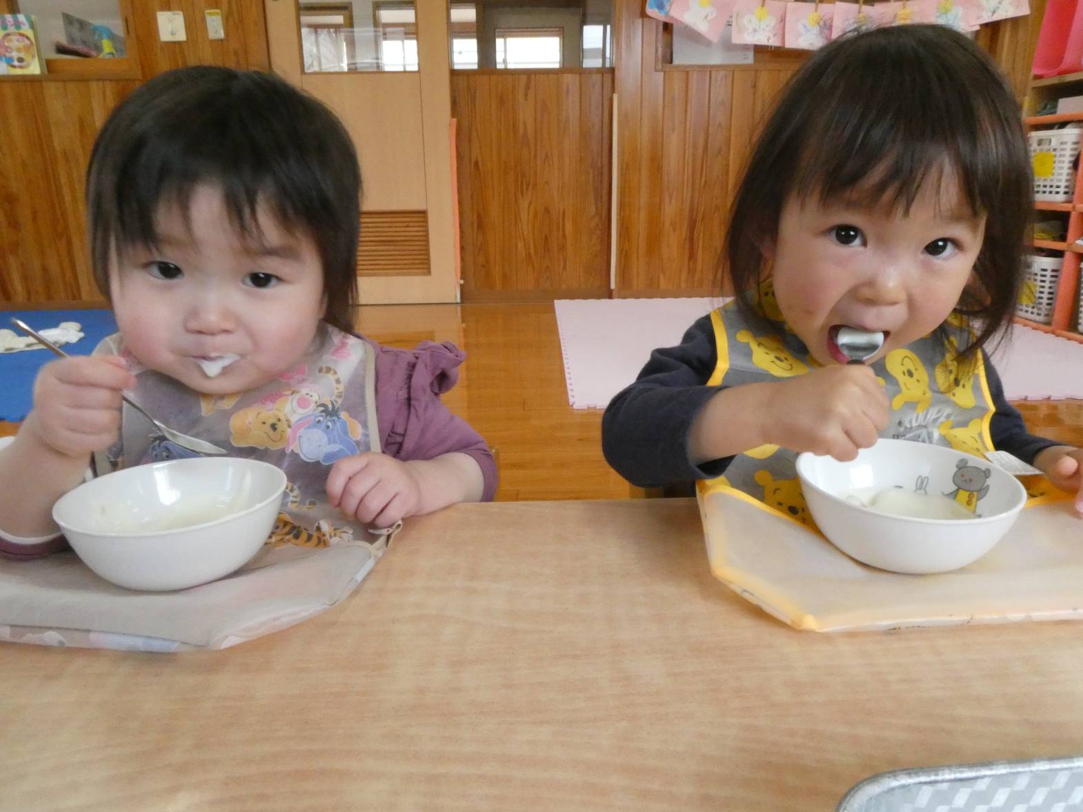 保育者に、「ぱんだ組さ~ん!」と呼ばれると、「は~い!」と元気よく返事をしてくれる子どもたち。