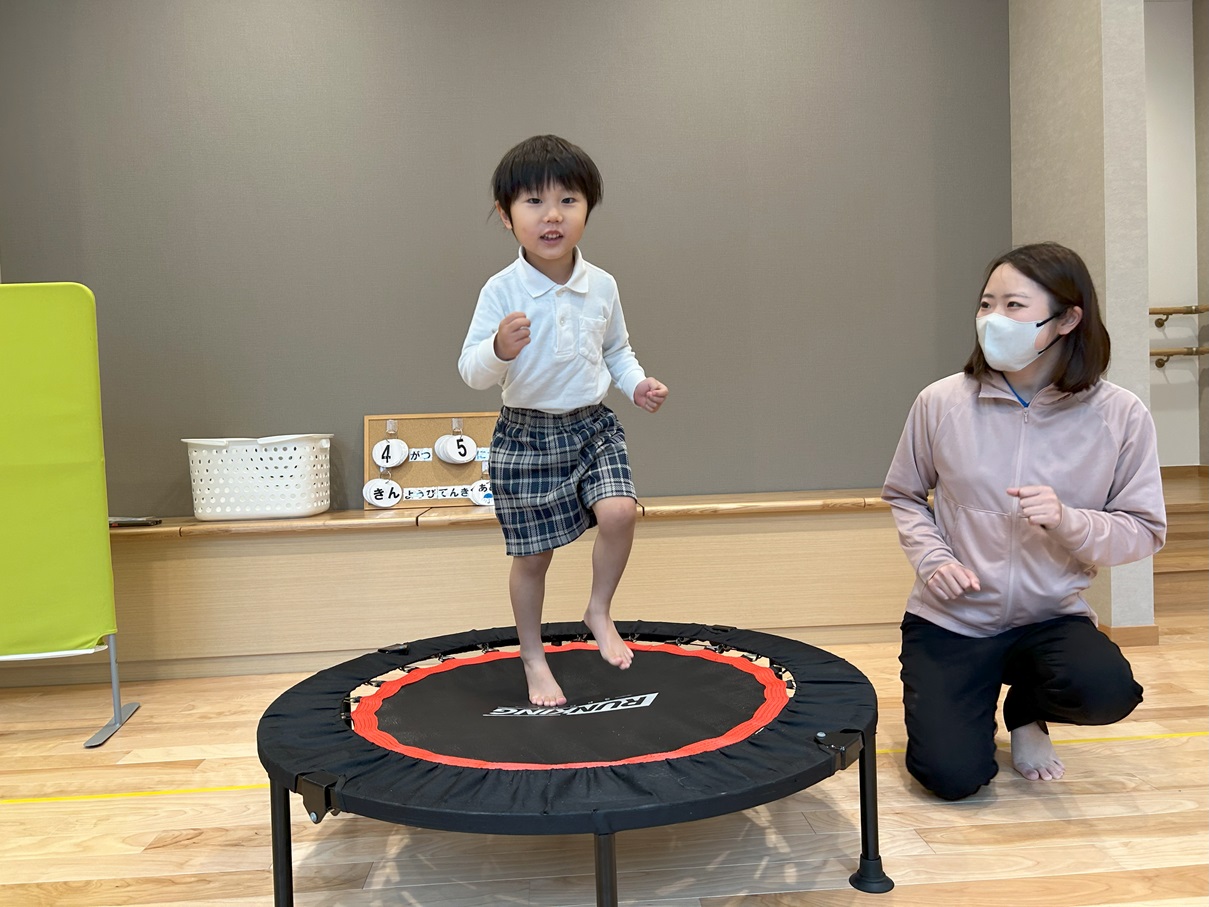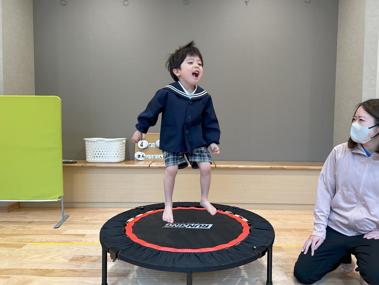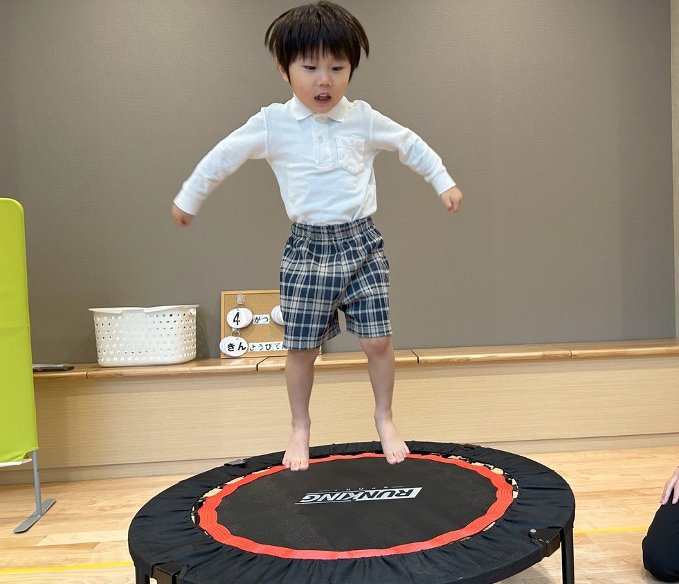 トランポリンの活動を行いました! トランポリンを見ると、「やったー!」と大喜びする子どもたち。 トランポリンの真ん中を跳んだり、トランポリンの上で駆け足をしたりして楽しみました! 「たーのしい!」、「もっとするー!」と全身を使って大きく高く跳び、大満足な様子のとらグループさんです!