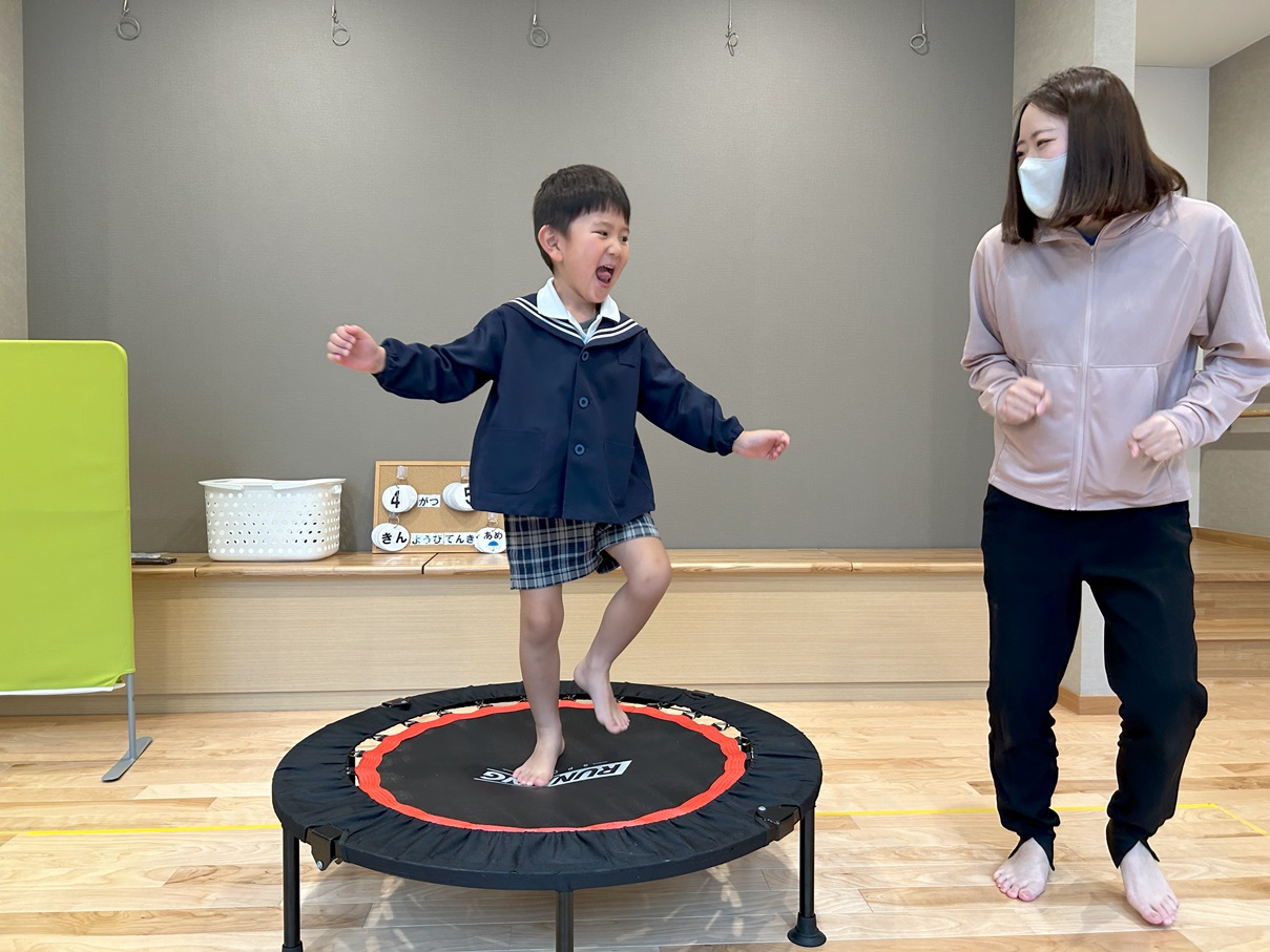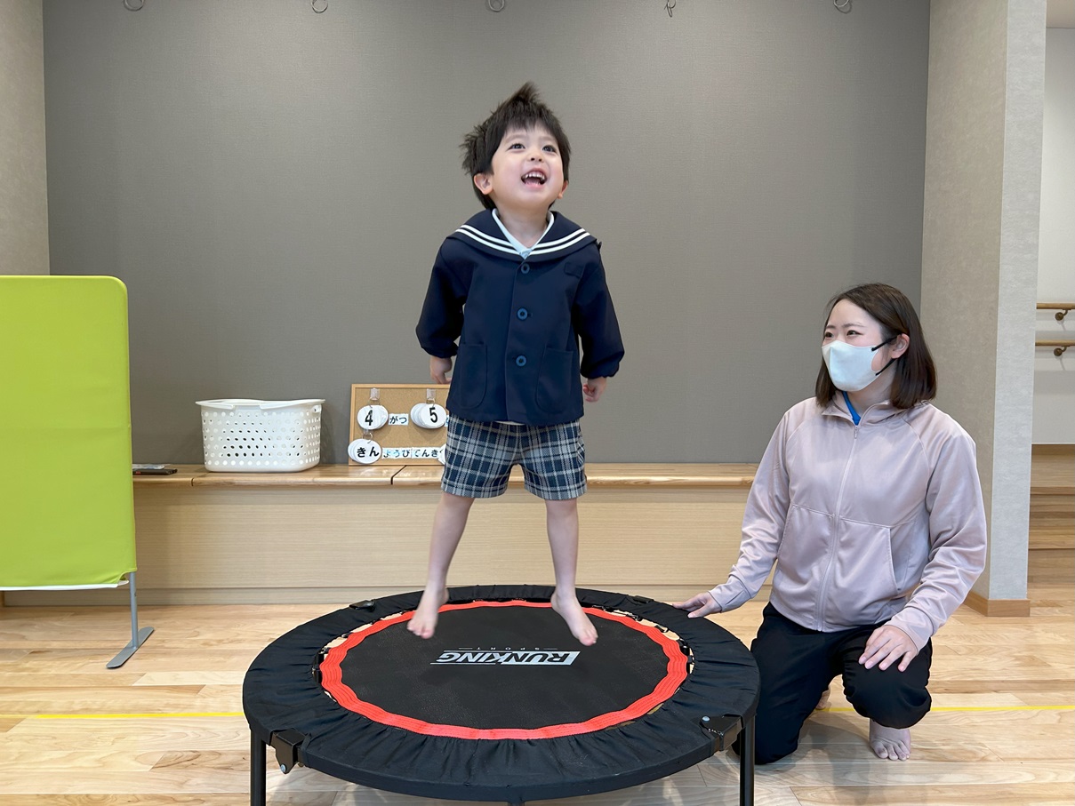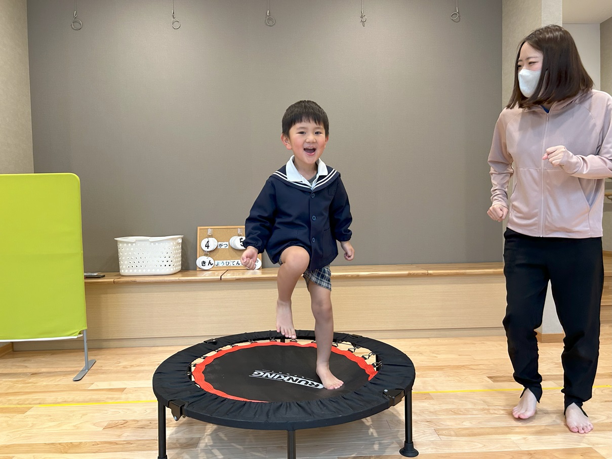 トランポリンの活動を行いました! トランポリンを見ると、「やったー!」と大喜びする子どもたち。 トランポリンの真ん中を跳んだり、トランポリンの上で駆け足をしたりして楽しみました! 「たーのしい!」、「もっとするー!」と全身を使って大きく高く跳び、大満足な様子のとらグループさんです!