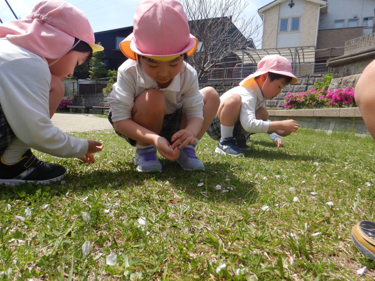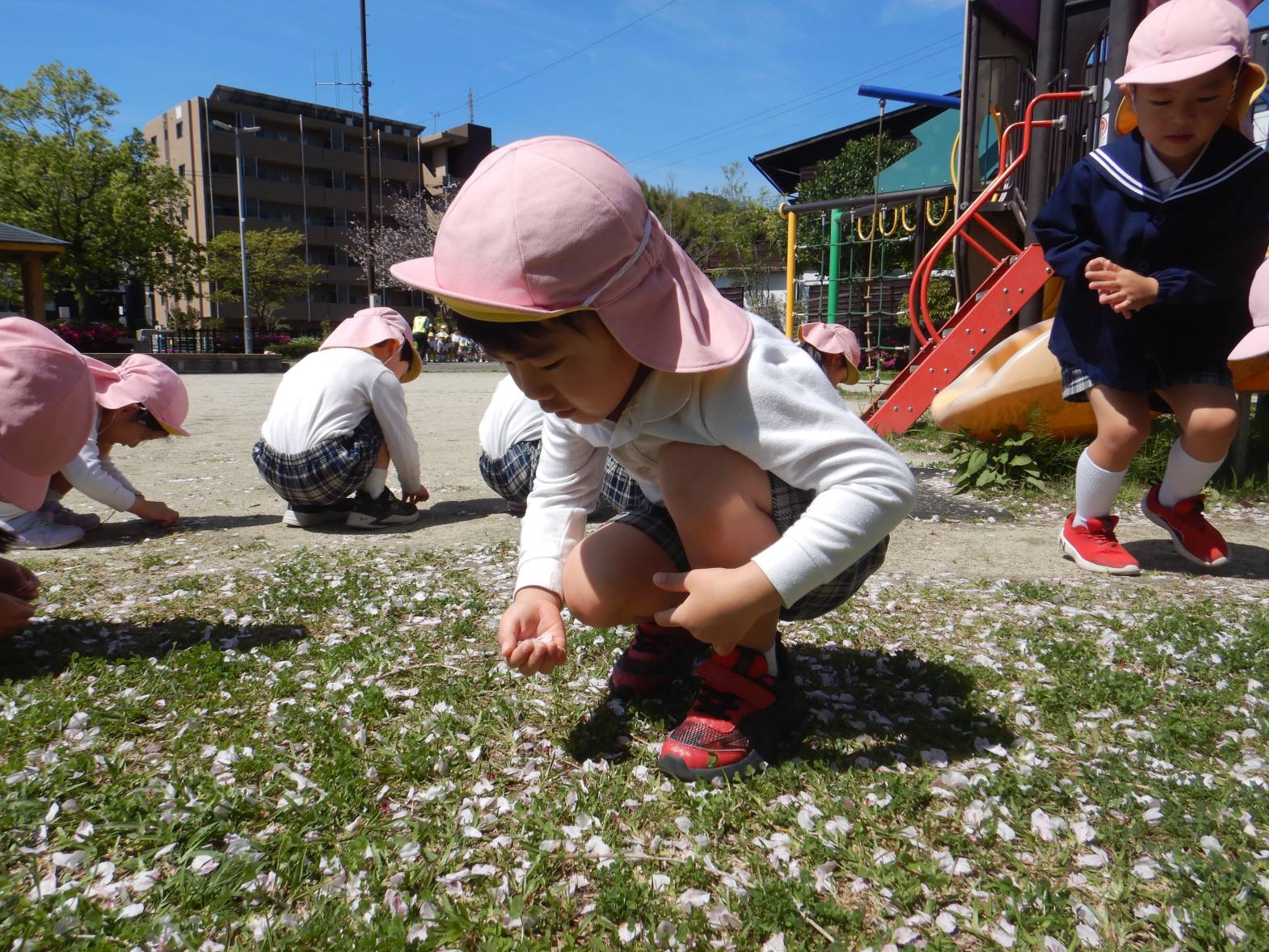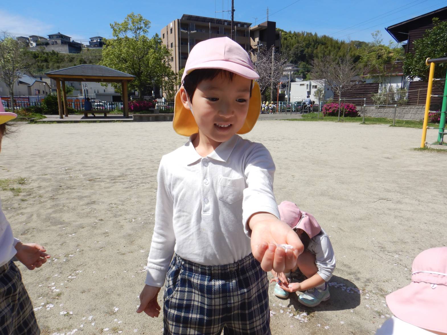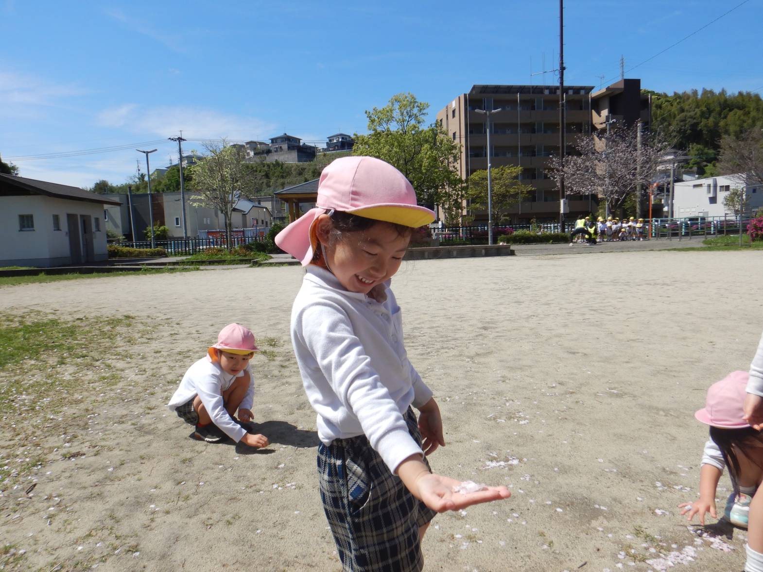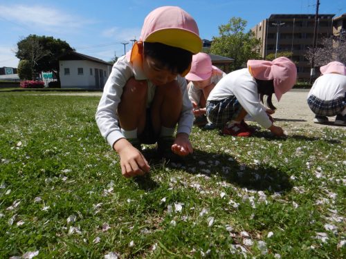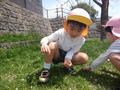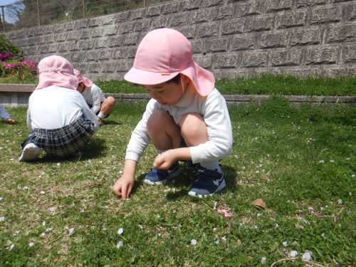 「綺麗だね!」「ここに桜の花びらが落ちてるよ。」と桜を集めたり眺めたりと身近な春を満喫するきりん組さんでした。