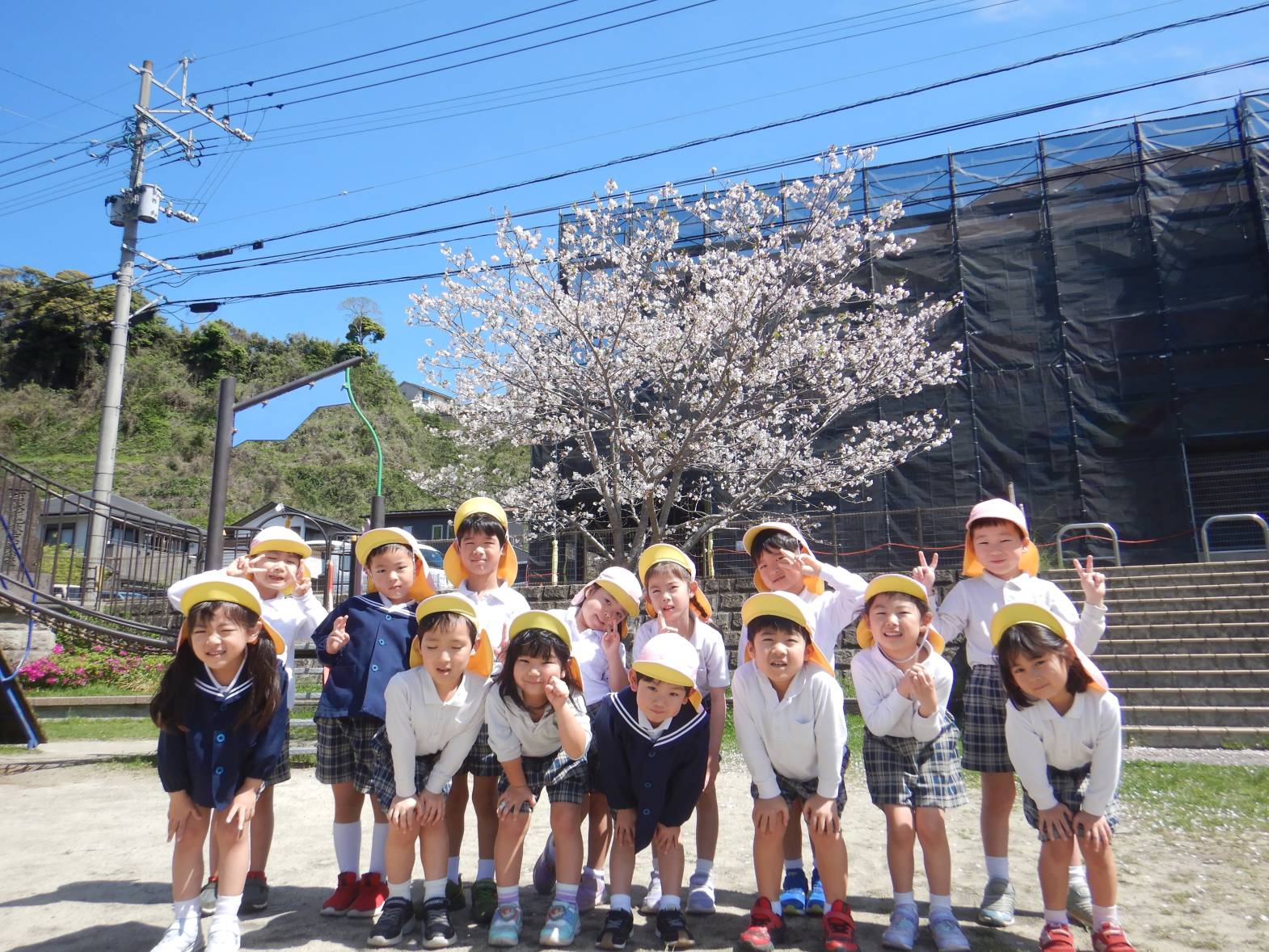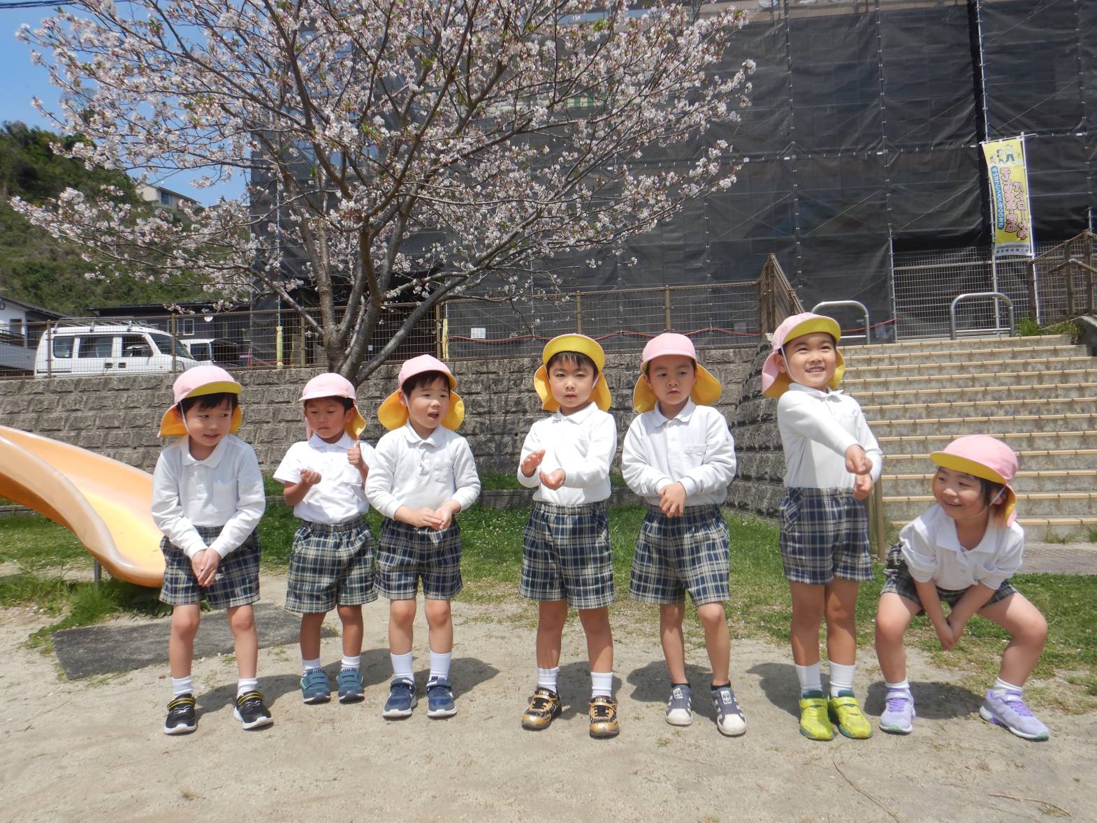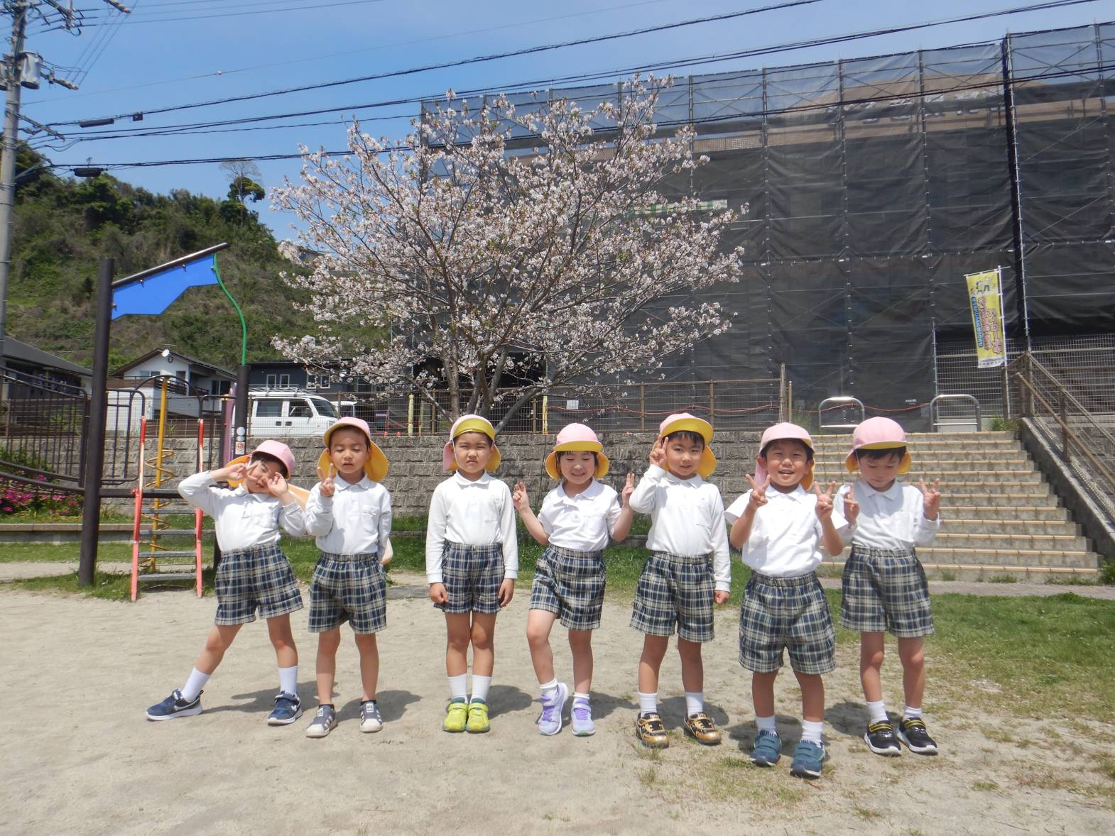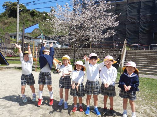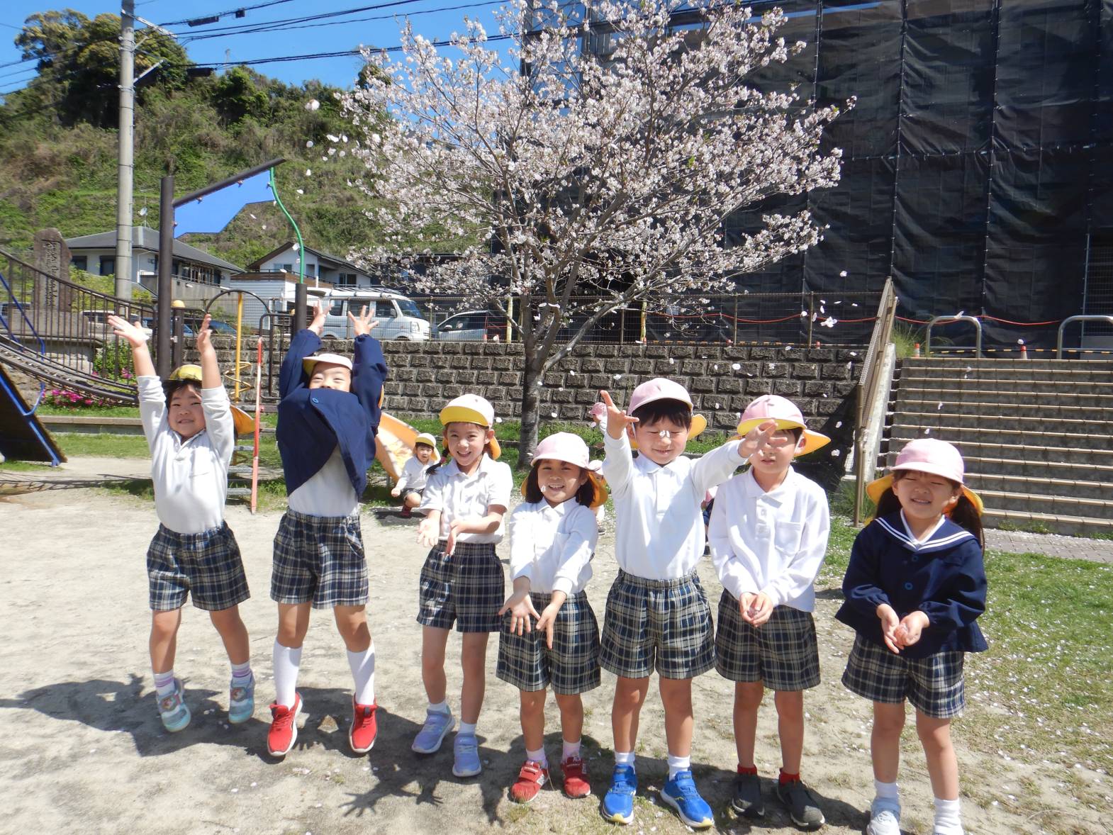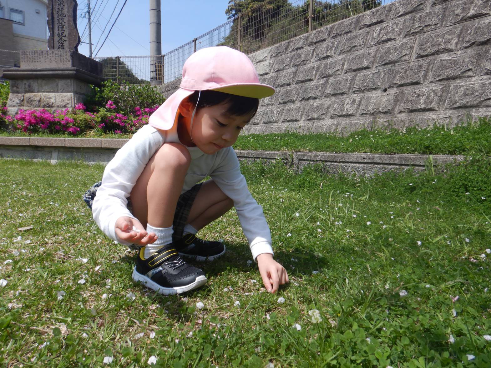 「綺麗だね!」「ここに桜の花びらが落ちてるよ。」と桜を集めたり眺めたりと身近な春を満喫するきりん組さんでした。
